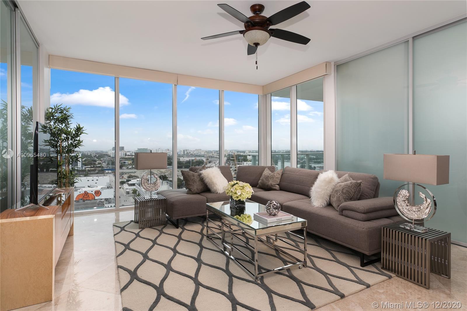 Unit 1506 at Ten Museum park is a FULLY furnished corner two bed and two bath condominium home with north west exposures overlooking the city's skyline. The unit is exquisite light-filled and professionally decorated, marble floors, spa-like master bathroom, airy kitchen featuring high-end stainless-steel appliances. The entrance foyer leads you to an open concept surrounded by glass impact windows overlooking the city. Ten Museum park is a boutique building bringing exclusivity, comfort and state of the art services to it's residents encompassing fitness center, spin studio and yoga room, full-service spa equipped with steam room, snow room and treatment rooms - pool deck with resistance and plunge pools, lounge chairs, and hot tub. Perfect primary residence, pied-a-terre or investment.