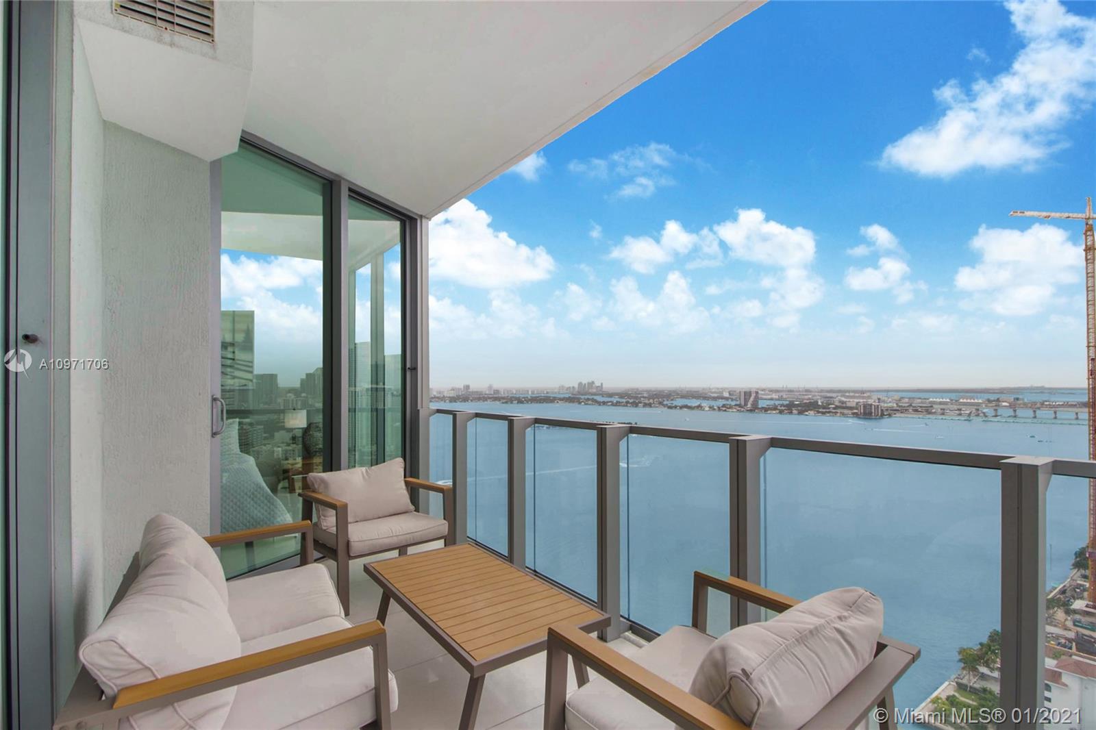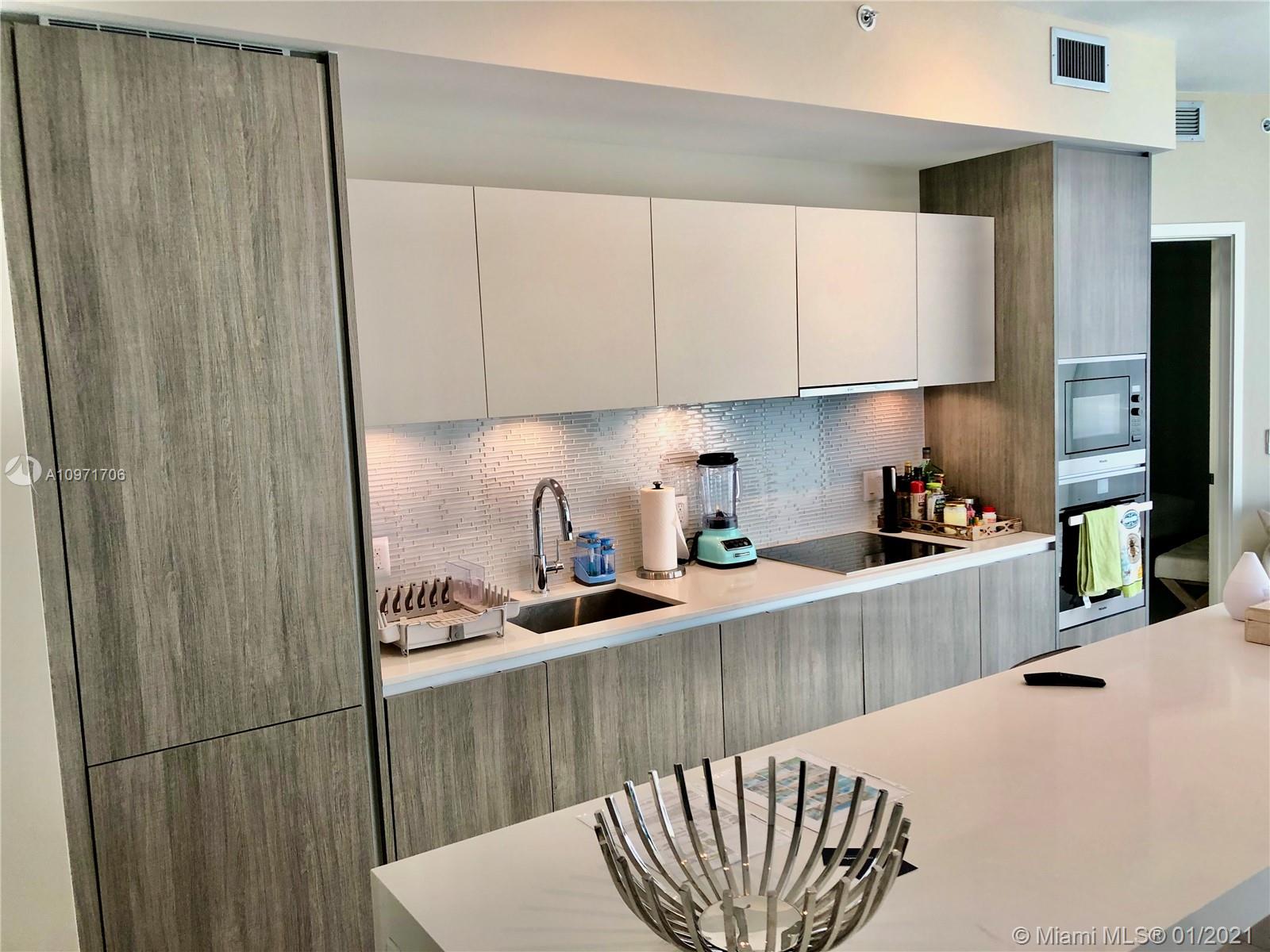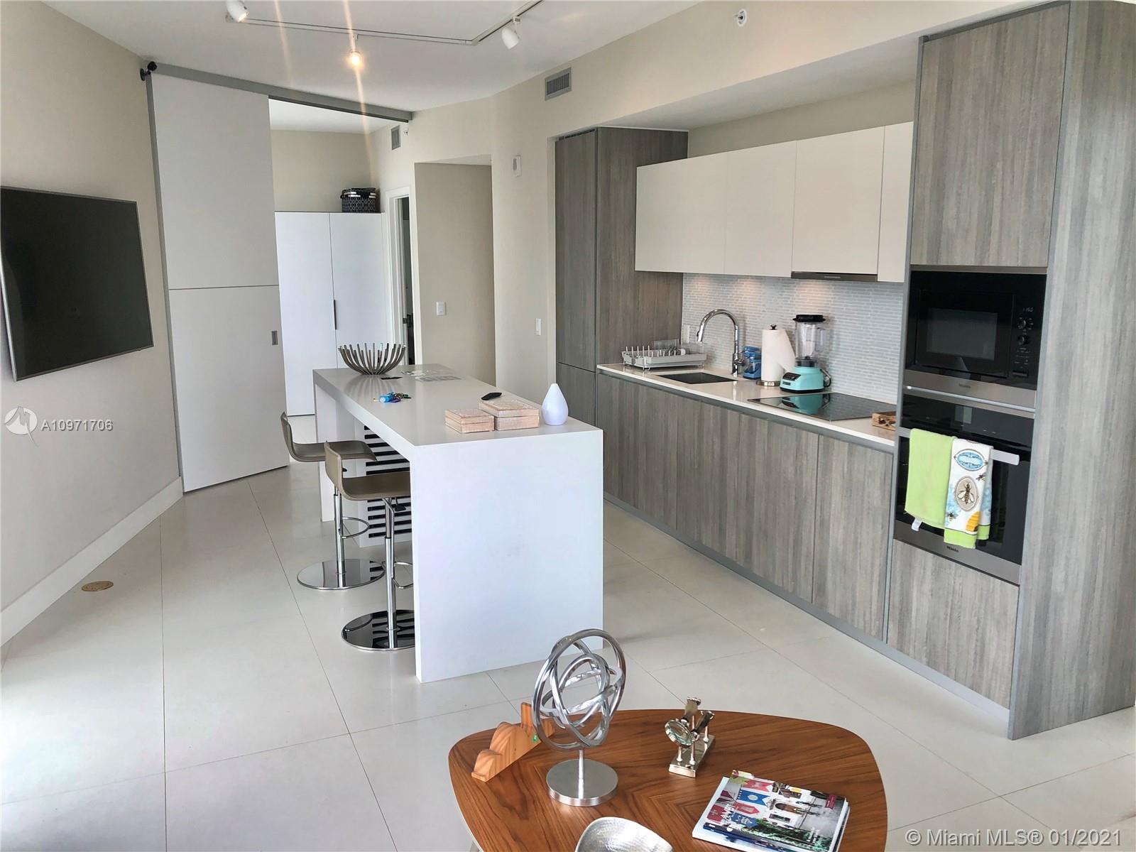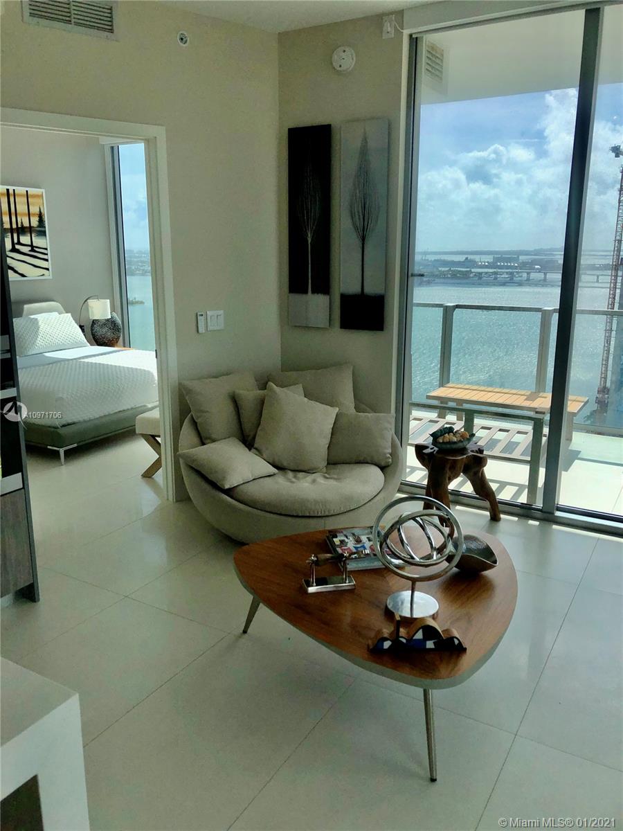 Beautiful upgraded 1 bed + den (enclosed with murphy bed) and 2 baths at luxury building. Professionally decorated by Brazilian designer Myrna Porcaro. Upgrades include kitchen island and wine fridge, wallpaper, vertical garden pillar, murphy bed, & electric shades. Tile floors throughout. Beautiful VIEW OF BISCAYNE BAY, Edgewater & Downtown Skyline, and sunset view. Private Elevator with private foyer entrance; Snaidero Kitchen with Miele appliances; 10 ft ceilings with floor to ceiling glass windows; spacious balcony. Amazing AMENITIES with a Beach Club, elevated sand/beach area, bayfront pool, sauna & steam room, 2 massage rooms, tennis & basketball courts, beach volleyball court, state of the art gym, 6th floor with 2nd pool, bbq area, 2 party rooms. Assigned parking (#233)