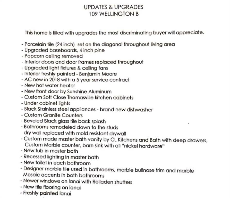 109 Wellington B is loaded with visually beautiful features that reflect a discerning homeowner's priorities .This is one of the most Exceptional and Exquisitely renovated two bedroom / two baths located at the prestigious Wellington section of Century Village. The first floor unit's lake views are breathtaking.Perfect diagonally placed porcelain tile in the entire living area will greet you upon entrance and you will immediately notice all the well thought out details including the lighting fixtures and ceiling fans, this is just the beginning!