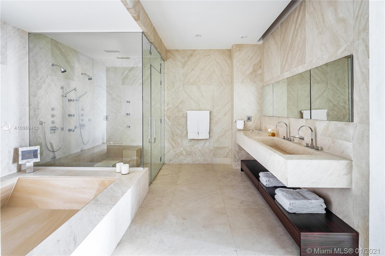 Sophistication & Style South of Fifth! Elegant Entertainer’s Dream at Apogee where Wide Open Entertainment Spaces meet soaring 10ft ceilings to accentuate the finest of art collections. Blue Skies & Sparkling Ocean beckon from every window. Unique & Spacious, this 3,104sf 3BR was specially converted to a grown-up 2BR space, maximizing Open Living Area & Cocktail Party Seating, incl 1000+sf Covered Outdoor Terrace with a BARBECUE!. Oceanside Eat-in Kitchen w/Gas Stove/DOUBLE Ovens&Warmers&Dishwashers. Breathtaking views of the Ocean/Fisher Island/Miami & Miami Beach Skylines. Miami's most exclusive address, Apogee has only 67 residences, world-class security, private elevator foyer entry, stunning amenities, 11ft deep terraces w/outdoor kitchens, private 2.5 Car A/C garages & much more!