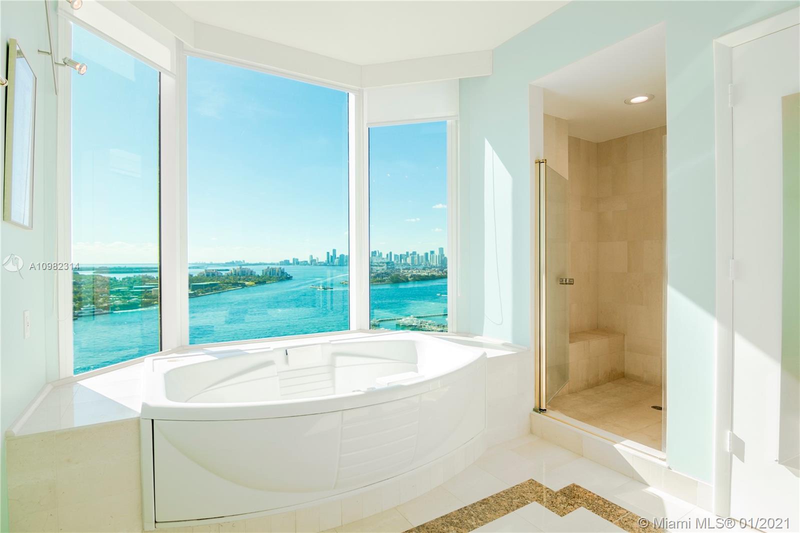 Immaculate 3 bedroom corner residence at Miami Beach's iconic Portofino Tower. Highly coveted and rarely available 01 line, boasting panoramic and picturesque views of South Beach, Biscayne Bay, Fisher Island and beautiful sunsets over the Miami skyline. Floor to ceiling glass with abundance of natural light, brand new marble floors throughout, new high-end stainless steel appliances, Sonos surround system throughout residence and on balconies, exterior lighting installed on balconies. Relax and enjoy unobstructed sunrises and sunsets from your private east and south terraces, or from the master bath tub. The most exceptional apartment available at Portofino.