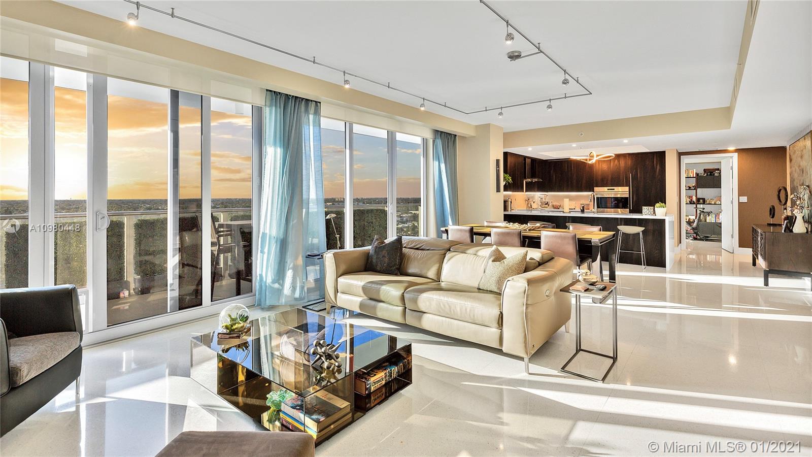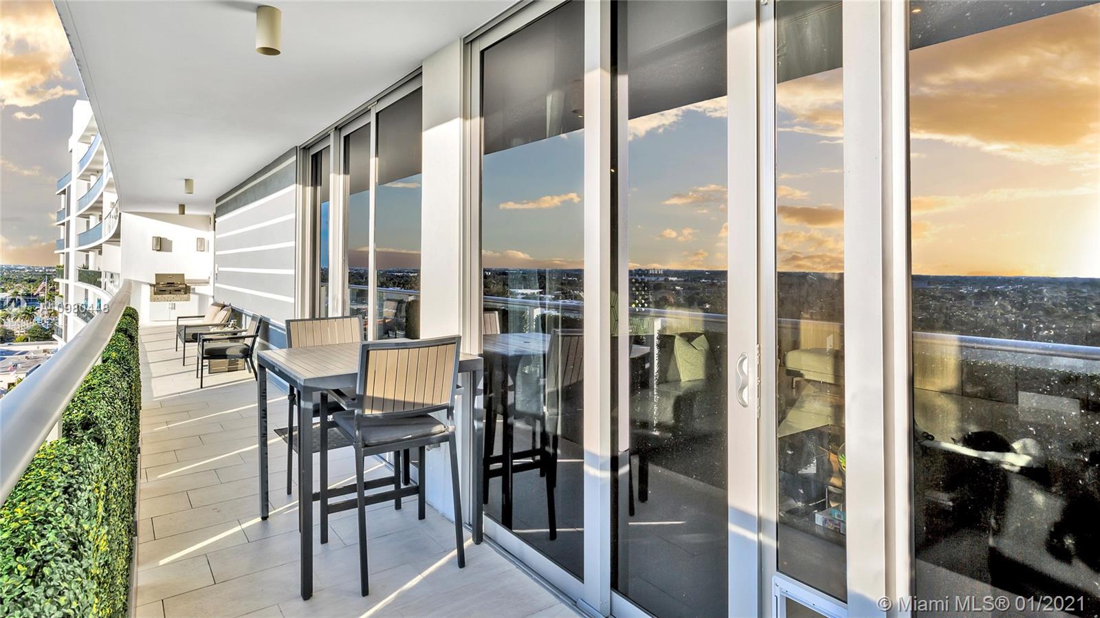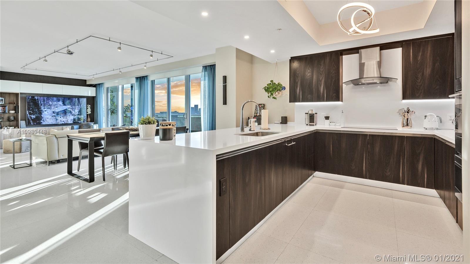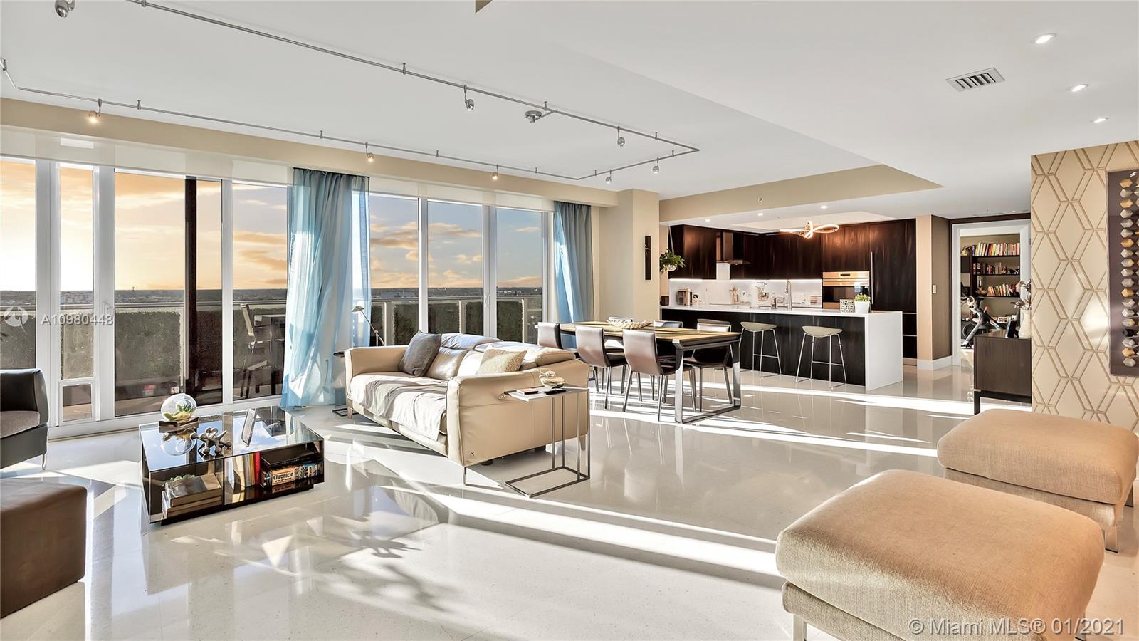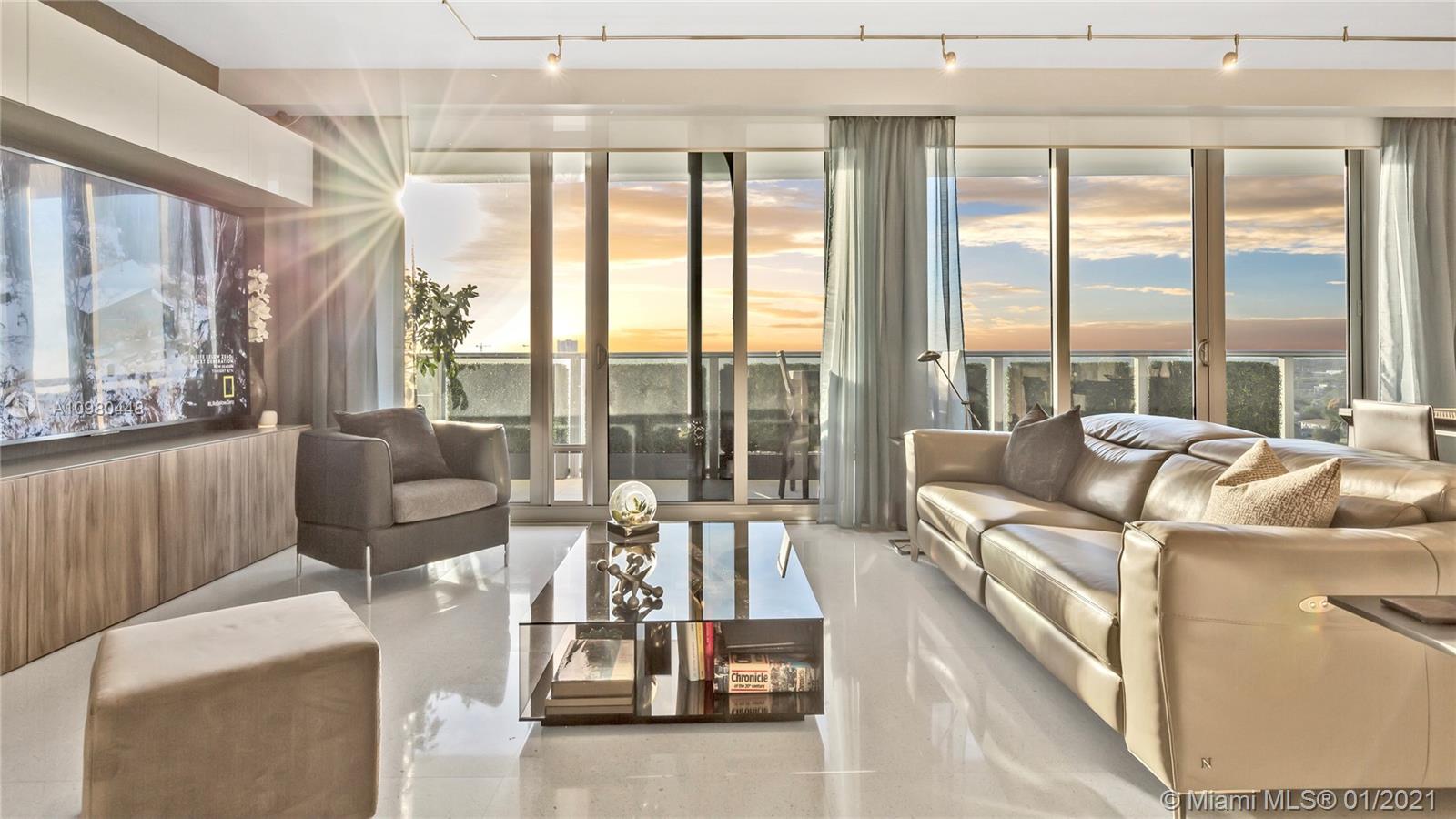 Exquisite 2 Bedroom, 2.5 Bathroom with Panoramic Skyline & Sunset Views, Open Concept, Custom Work Throughout & 72' Terrace with BBQ. Chef's Kitchen with Italian Cabinetry, Quartz Countertops, Wolf Oven & Induction Cooktop, Sub-Zero Fridge. The Open Living Room Includes Custom Storage, Entertainment Wall & Chic Lights. Spacious Primary Bedroom Includes Walk-In Closet, Combo Storage/Entertain Built-Ins & Primary Bathroom with Dual Backlit Vanities & Grandiose Shower. RIVA Residences Provides 40,000 SF of Amenities: Heated Lap Pool, 7,000 SqFt Gym with YOGA Studio, Resort Style SPA with Sauna, Steam & Treatment Rooms, Resident's Lounge, Sunset Deck & Jacuzzi, Cucina to Entertain, 24/7 Front Desk Attendant, Valet, 2 Dog Walks & Central Location. Private, 2 Car Garage for Additional $150k.