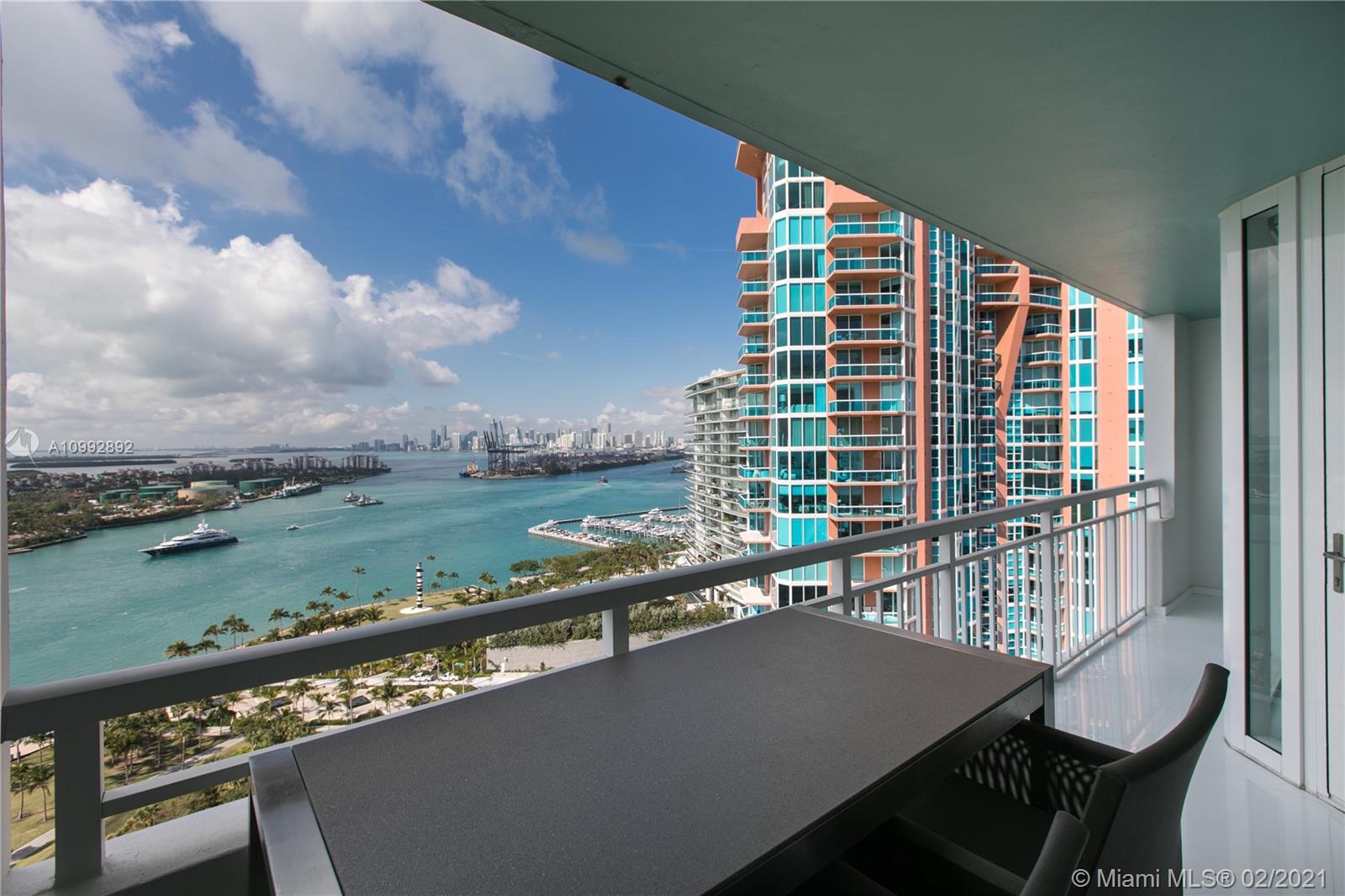 One of a kind renovation to create 2 BR, 2 full baths. Unit has been reconfigured to maximize living space and views. White glass marble floors throughout. Open living and kitchen area. Kitchen features Miele and Wolf appliances. Floor to ceiling impact windows with extended private balcony on the highest non penthouse floor. Magnificent open views of Govt Cut, Ocean, Fisher Island and the Miami skyline. All assessments paid by Seller. Must see to appreciate.