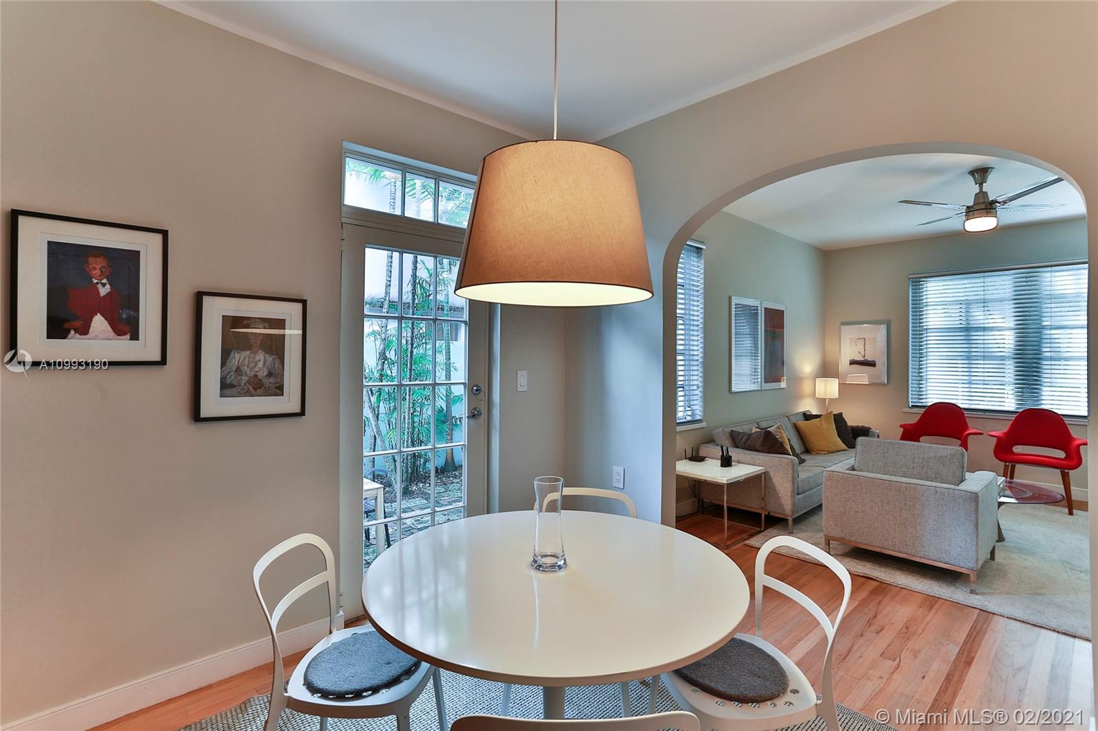 This beautiful, fully renovated home in the Riveria Arms, a SoBe Art Deco treasure, has it all: your own PRIVATE PATIO/YARD, assigned PARKING, and 100% HURRICANE IMPACT GLASS! Corner unit is light and bright with stunning hardwood floors throughout. Gourmet kitchen boasts stainless steel appliances including gas stove, Bloomberg Fridge, Bosch Dishwasher, and Granite countertops. Separate dining area with beautiful bookshelf backdrop leads to your private patio, perfect for year round dining and entertaining. Bedrooms upstairs with separate entrance, so no upstairs neighbors! Washer/dryer built in on second floor. Built in shelving & outfitted closets. Henry Hohauser designed building is tastefully preserved. Easy to show.
