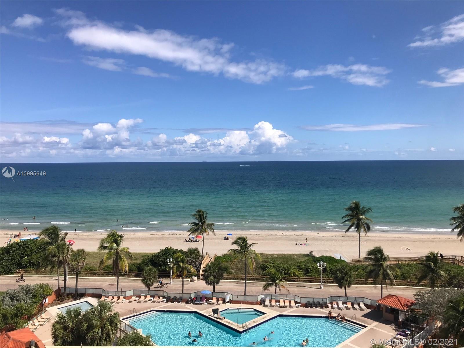 Ocean view Unique two-story 1 bed room apartment with 2 full bathrooms. Recently painted. Famous Resort located on the beach along the 2 miles Hollywood Boardwalk. Location attracts many tourists. Electric cook top in the kitchen on a first floor. High Ceiling. Hurricane proof windows. Ocean view from windows on both floors. Furnished and ready for rent or living. 2 closets. Maintenance includes all utilities: electricity, AC, cable TV, Internet (WiFi), water, 1 garage parking space, Large heated swimming pool and Jacuzzi, Gym and 24 hours reception and security. There are no rental restrictions. Quick Guests online registration. Can be rented Daily , weekly or monthly. Perfect purchase of a beach front apartment for personal or Investment use. Call listing agent for showing.