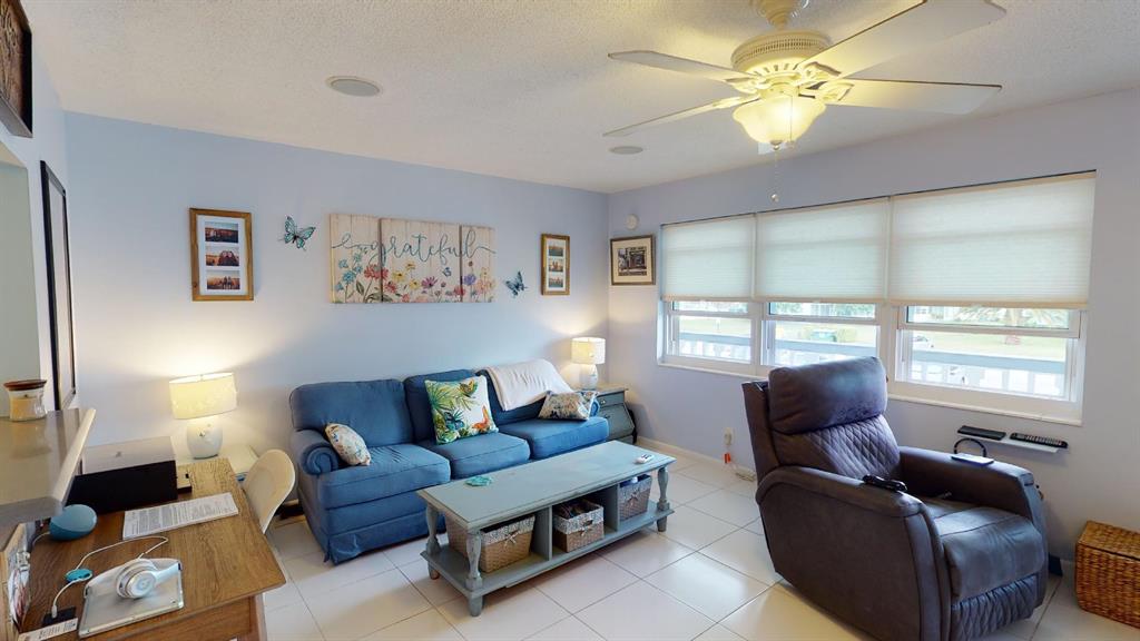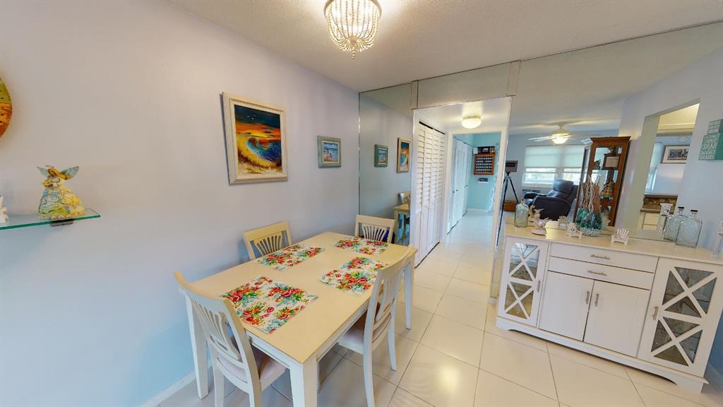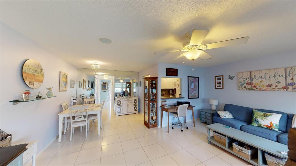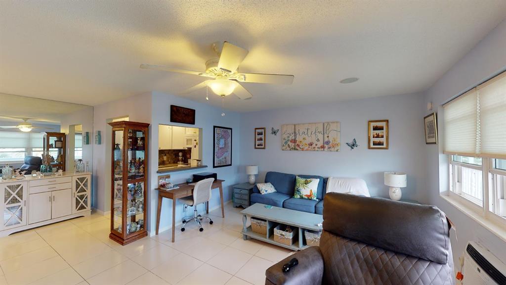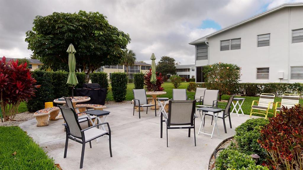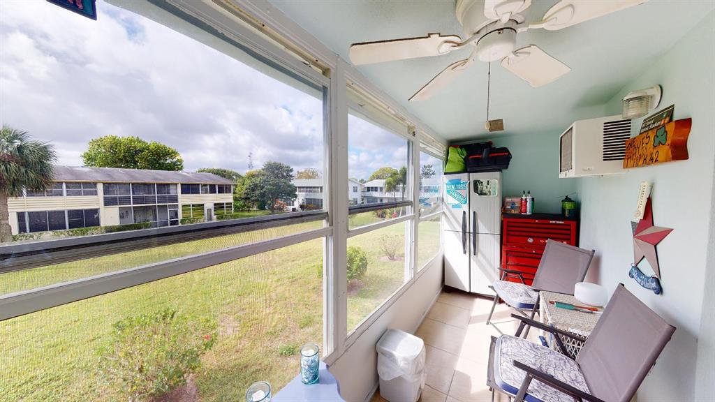 Located in Century Village a 55+ resort-style community is this beautiful 2nd floor one bedroom with one and one half baths condo. This condo features all tile floors, updated kitchen and baths with a walk-in shower, 2 A/Cs, 6-panel doors, freshly painted, and ceiling fans in all rooms. Kitchen has all wood cabinets, backsplash, quartz countertops, newer white appliances, a six-stage RO water filter and an on-demand hot water heater.Impact windows in front. sliding glass doors in bedroom open to screened lanai with a fan and storage closet. You're only steps away from the pool. Building has new anti-slip walkways and roof replaced this year, laundry on both floors, and a large open patio for enjoying the outdoors. No pets and no rentals. Close to turnpike and 95