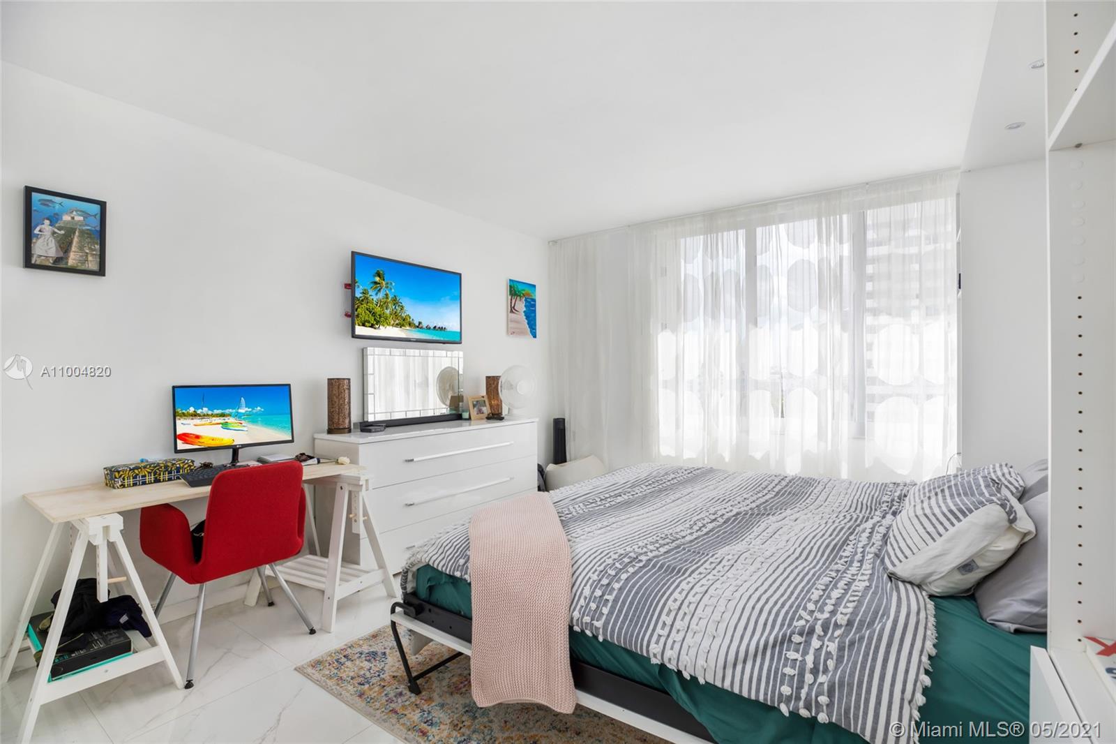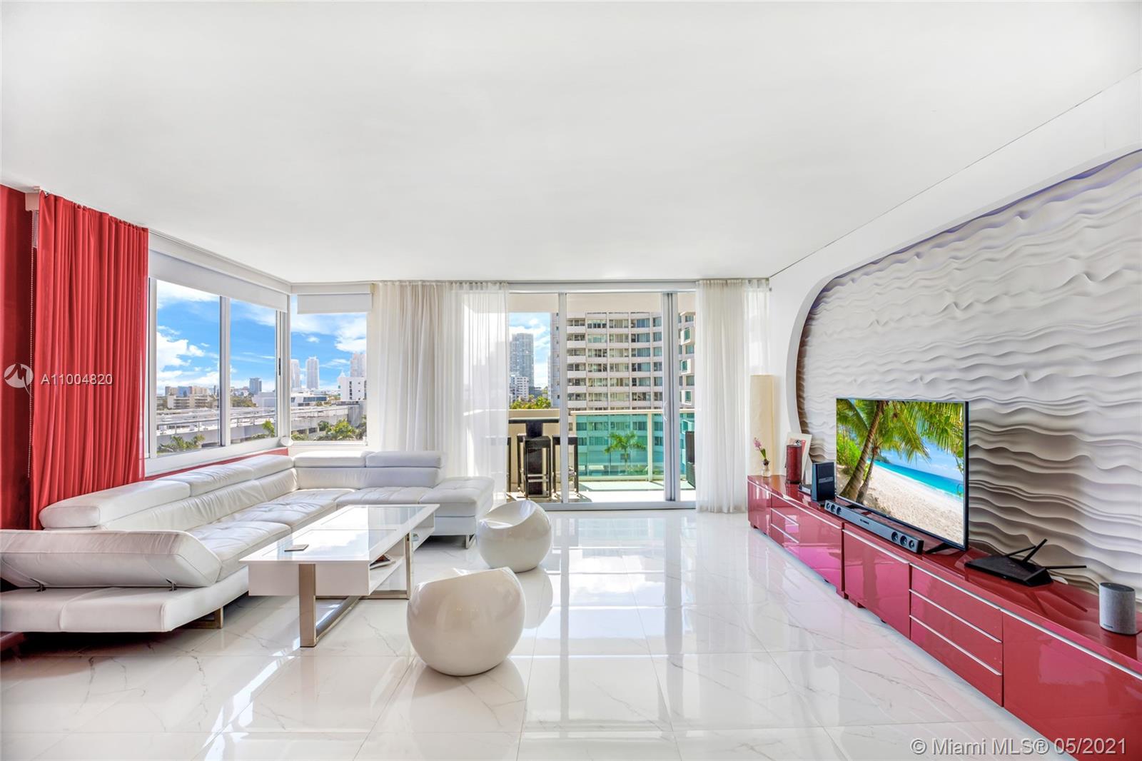 SIMPLY STUNNING..This Bright Corner Unit with Spacious Design and almost 1000 sqft of space. One of the largest 1 bed 1 1/2 bath was remodeled by a celebrity television designer from HGTV with a unique multi color LED feature wall, large porcelain tile floors throughout, updated Open Kitchen with white cabinetry, Exquisite Bathrooms, Spacious Master suite with plenty of Closets, tiled balcony plus Impact Windows. SOLD FULLY FURNISHED! Feel like you're living in a Resort enjoying brand new state of the art Fitness Facility, Bayside Pool, Jacuzzi, Media Room, Convenience Store, 24hr Concierge & Valet. CABLE/INTERNET Included.