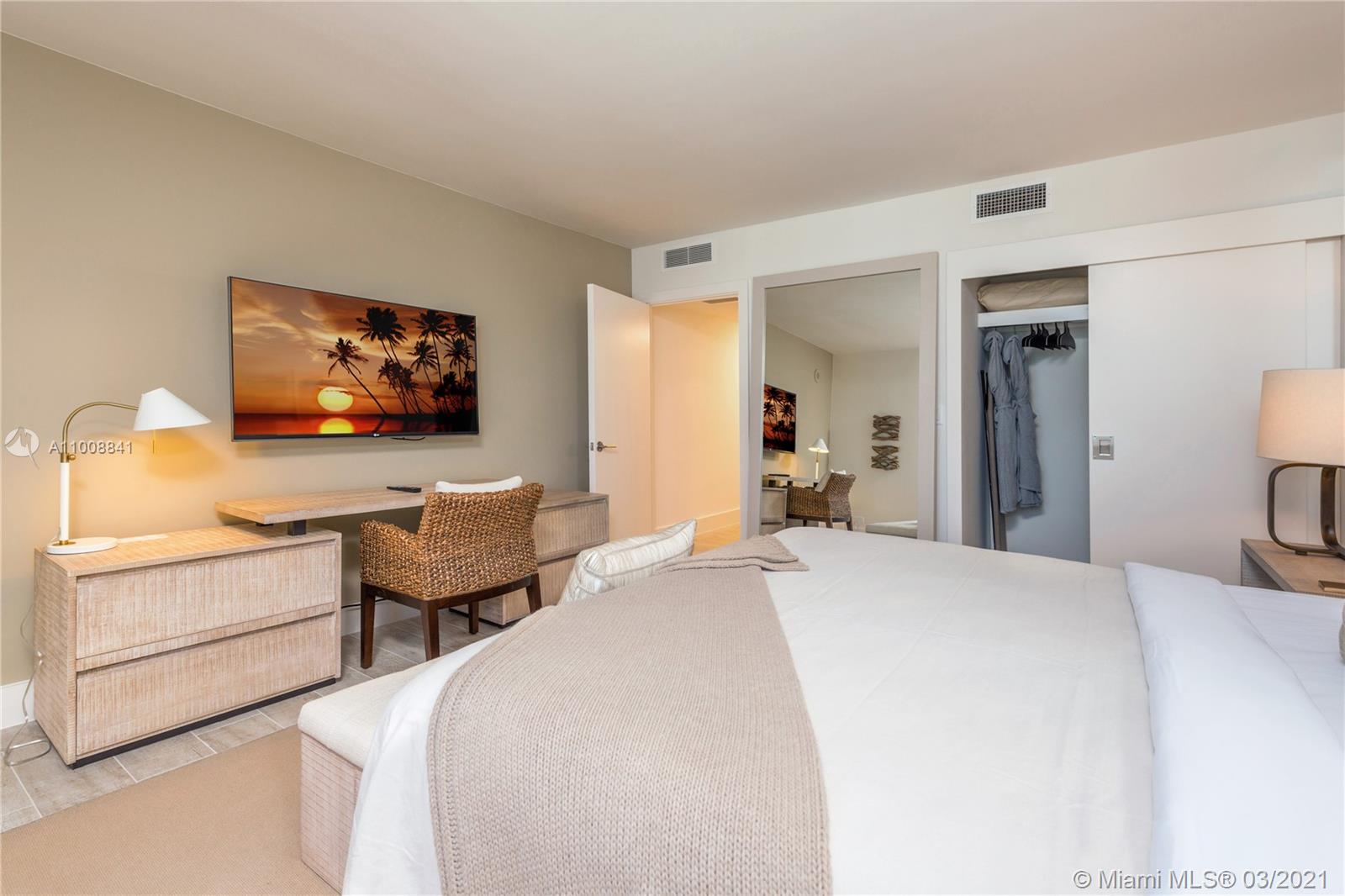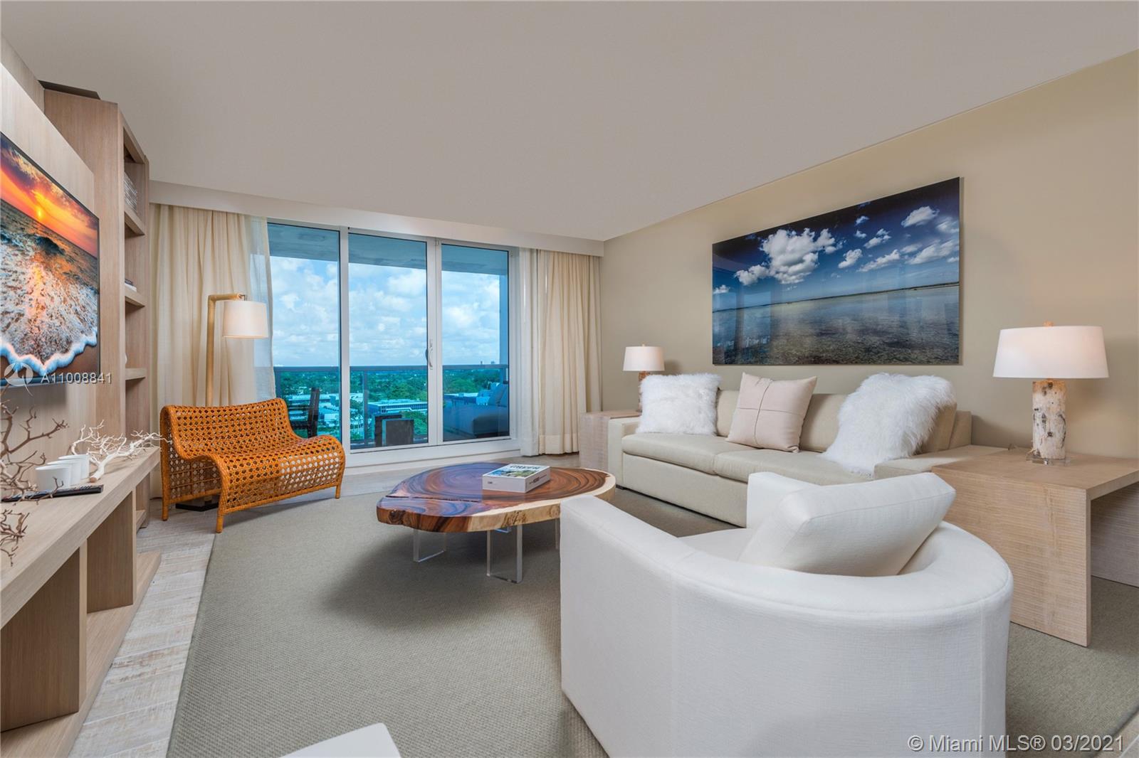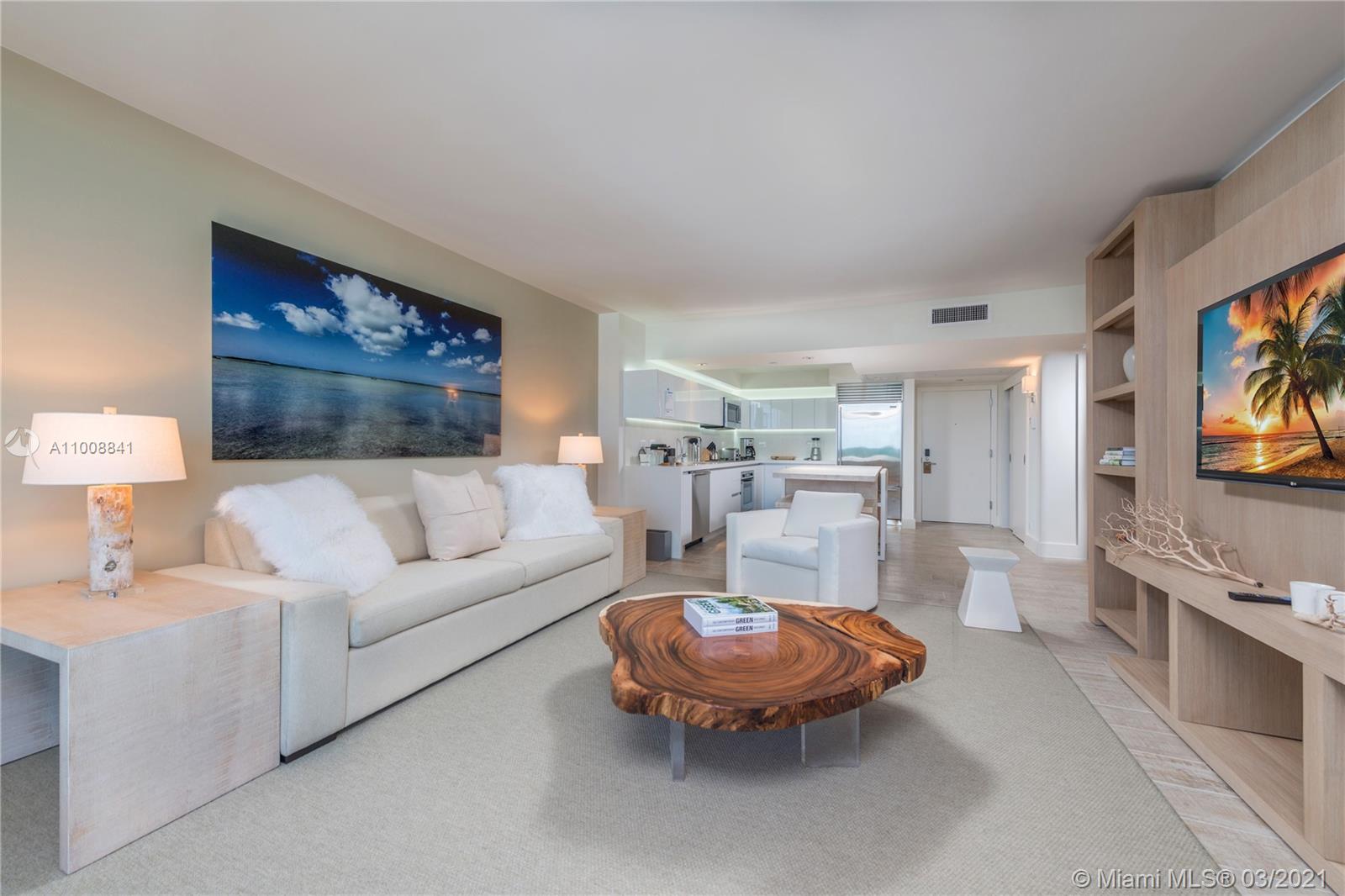 Enjoy stunning unobstructed bay views! Immaculately furnished by acclaimed designer, Debora Aguiar. Full kitchen, oversized living room and bedroom. Hotel living with private rooftop pool,bar & sand filled lounges.Restaurants serving the finest in organic cuisine.Private resident’s lobby,concierge & chauffeured Tesla.600 linear ft. of beachfront,4 pools,14,000 sqft fitness center,Bamford Spa,beach & pool service,valet & more. Hotel Program Available