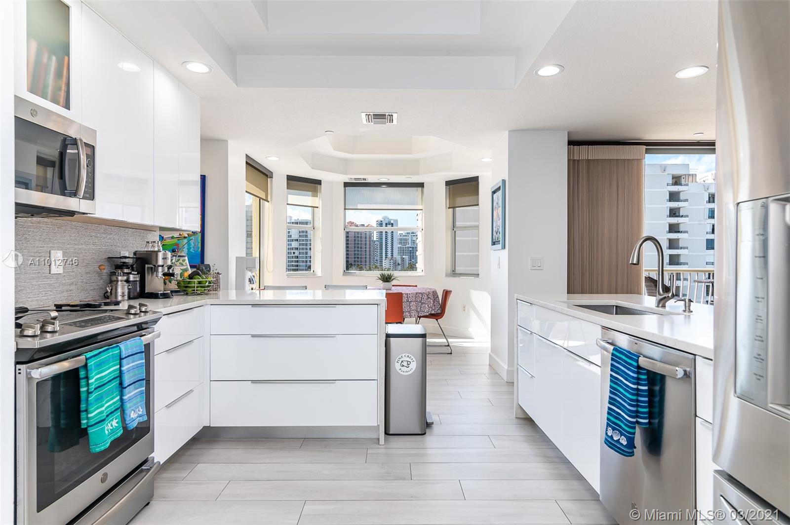 Luxurious building with semi-private elevator that leads you to a beautiful and recently renovated 3 bedroom apartment with modern porcelain flooring throughout, new white kitchen cabinets, and quartz countertops offering open space towards dining and living room area. Stainless steel appliances including wine cooler. Panoramic and gorgeous ocean views from kitchen dining, formal dining, living room, master bedroom, and of course from the 220 sq ft balcony. High ceilings with double trays and LED lighting. Private beach access and club across the street. Pool with barbecue area next to building docks. Low maintenance of $632 monthly which includes reserves. Very well-managed and maintained building with solid financial and reserves. All windows are high impact resistant for hurricane.