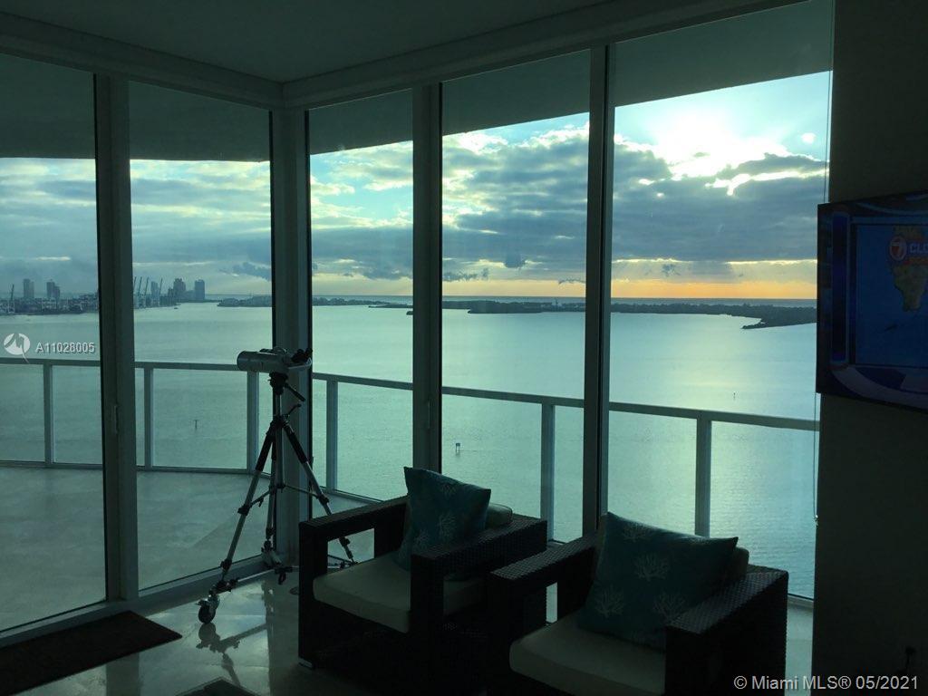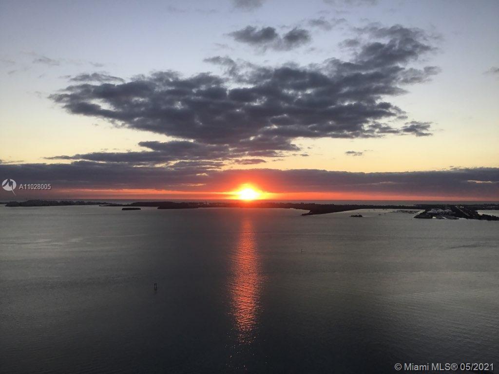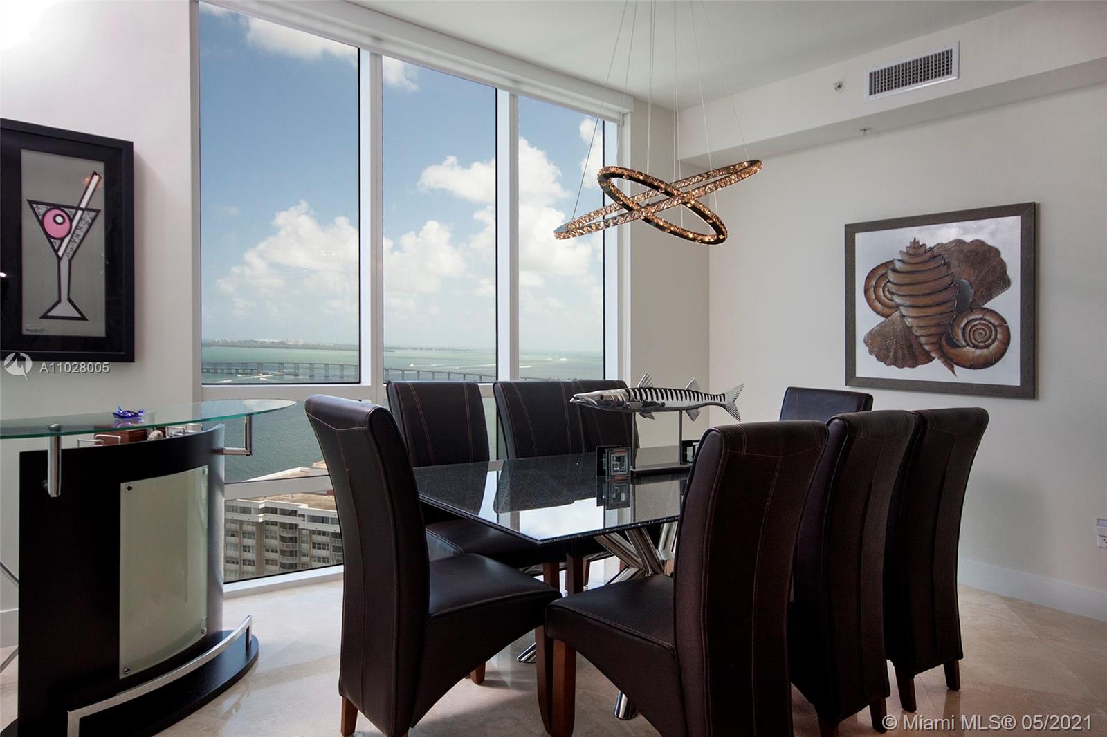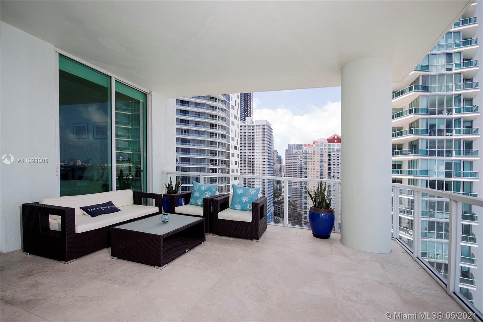 This Tower Suite at Emerald features a unique curve-of-the-earth panoramic views of Biscayne Bay and city skyline. The 10 ft high impact floor-to-ceiling glass windows connect the modern interior space with the private 447 sq ft wrap-around balcony that serves as a fabulous city and ocean lookout for a total area of 2,041 sq ft. The unit features stainless steel Sub-zero appliances, European kitchen cabinets, marble & laminate wood floors and private balcony on 2nd bedroom. Upscale resort-style amenities with 24 hrs. security, valet parking, concierge, rooftop infinity edge pool & spa overlooking the city and bay, state-of-the-art fitness center. Located in the heart of Brickell financial district, just minutes from AAArena, Brickell City Centre, Bayside Marketplace, Miami Airport.