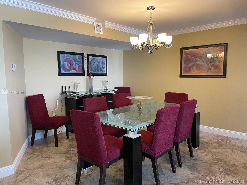 Stunning updated furnished and spacious apartment with ocean and city view. Beautiful, updated kitchen with granite countertops, SS appliances. Crown molding, tile floors in the living area, Brazilian cherry wood floor in the bedrooms. Custom walking closets, granite tops in the bathrooms, 1st master bathroom step in shower, 2nd master bathroom double sink, and tub/shower. Impact windows and hurricane shutters. Washer and dryer in the unit. Apartment comes with covered parking. Building has recreation room, two heated pools, two tennis courts, fitness room, restaurant, secured building.