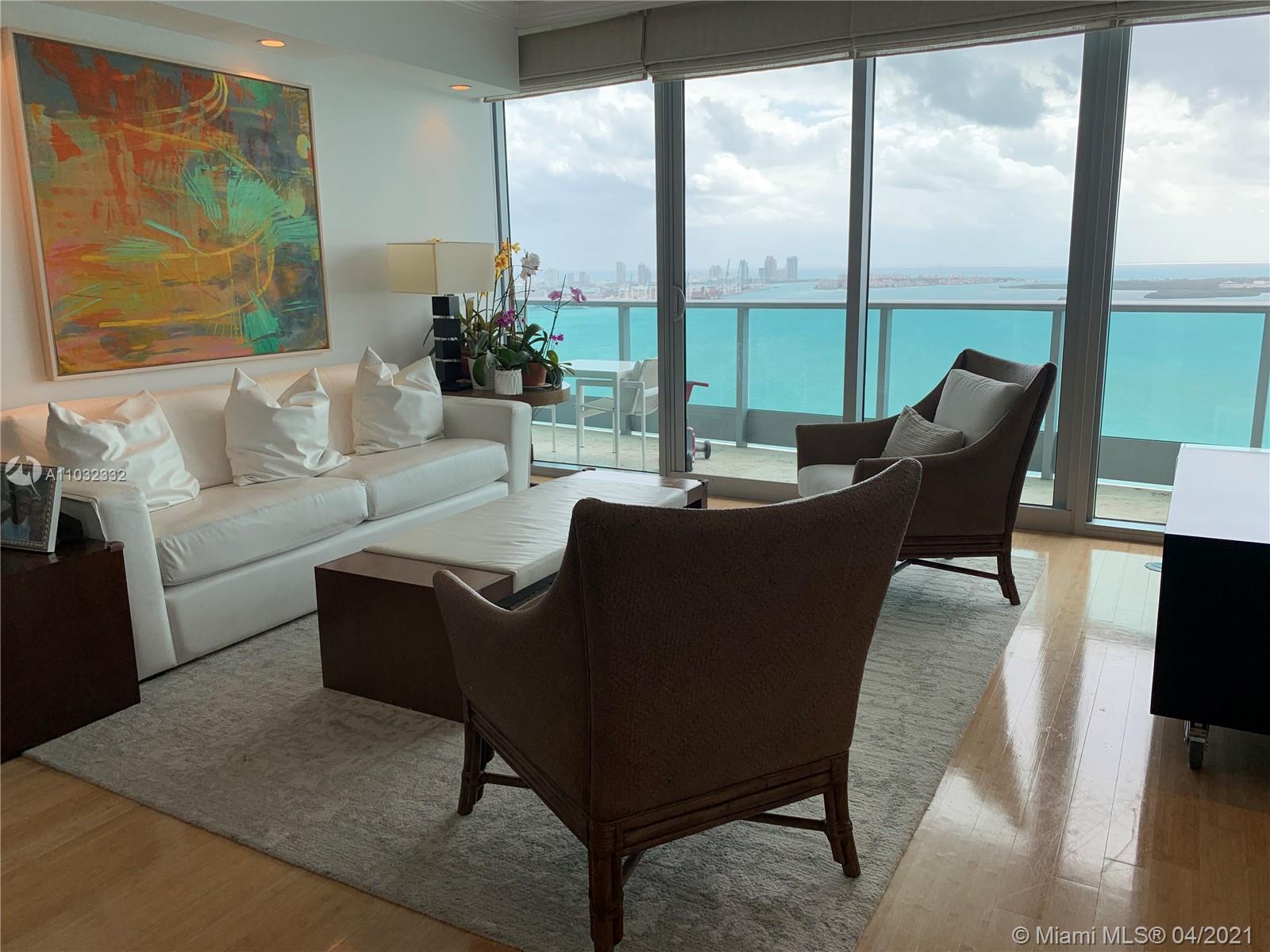2 Bedroom / 3 Full Bathroom + DEN (Queen Murphy bed custom built and slide doors to convert it into a private room) Water views from every room. Custom made motorized roller shades and impact windows. Over sized bathroom with shower & jacuzzi, Italian kitchen cabinets, granite countertops, Sub Zero fridge and Miele appliances, wine cooler, built-in coffee maker. Private elevator to your foyer entry. Unit comes with 2 assigned parking spaces in the lobby level + storage unit. Amenities: Full service concierge, fitness center, spa, rooftop party room, infinite pool and jacuzzi, business center, kids room, 24hr valet, security, infinity pool.