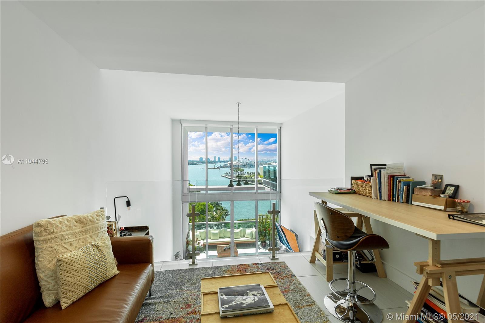 The guest suite is located on the first floor and the master bedroom and office suite on the second; dramatic 18' ceiling height and light porcelain flooring accentuates the natural light throughout. Enjoy the views of the Port of Miami, Biscayne Bay, Miami Beach to the Atlantic Ocean. Newly upgraded interiors include solar shades, black outs in the bedrooms and interior glass balcony. One Assigned Parking Space and 24-hour valet for additional cars.