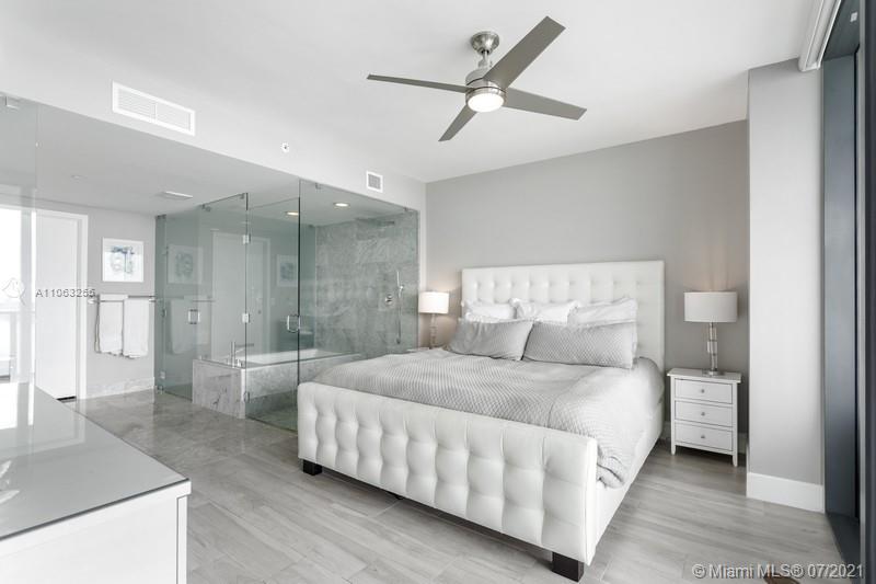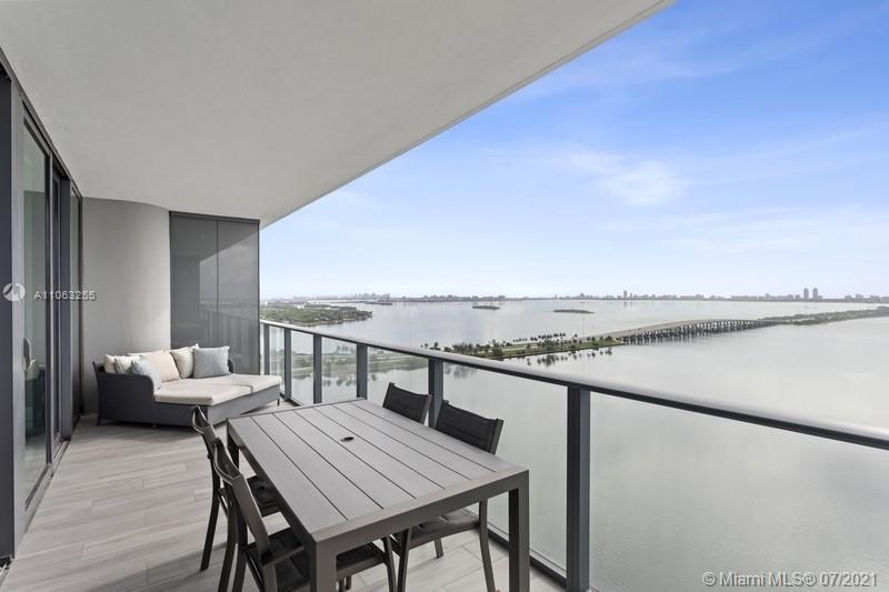 Enjoy the breathtaking views of Biscayne Bay and Ocean. This upgraded 1 bed + Den 1.5 bath condo features Marble and Striato Porcelain floors throughout. Beautiful European Italcraft cabinets throughout kitchen with full wolf appliances. Luxurious spa bathroom with rain shower, soaking tub, his and her vanities and more! Electric control blinds and black out blinds in primary bedroom. Many upgrades throughout! Lutron lighting throughout. Covered parking, 1 assigned space next to elevator, plus valet spot available. Enjoy all of the amenities of the ONE PARAISO, 3 Pools, jacuzzi, sauna, steam room, theater, fitness center, business center, piano bar, marina, tennis courts and more! Close to entertainment and the finest restaurants. PET friendly community!