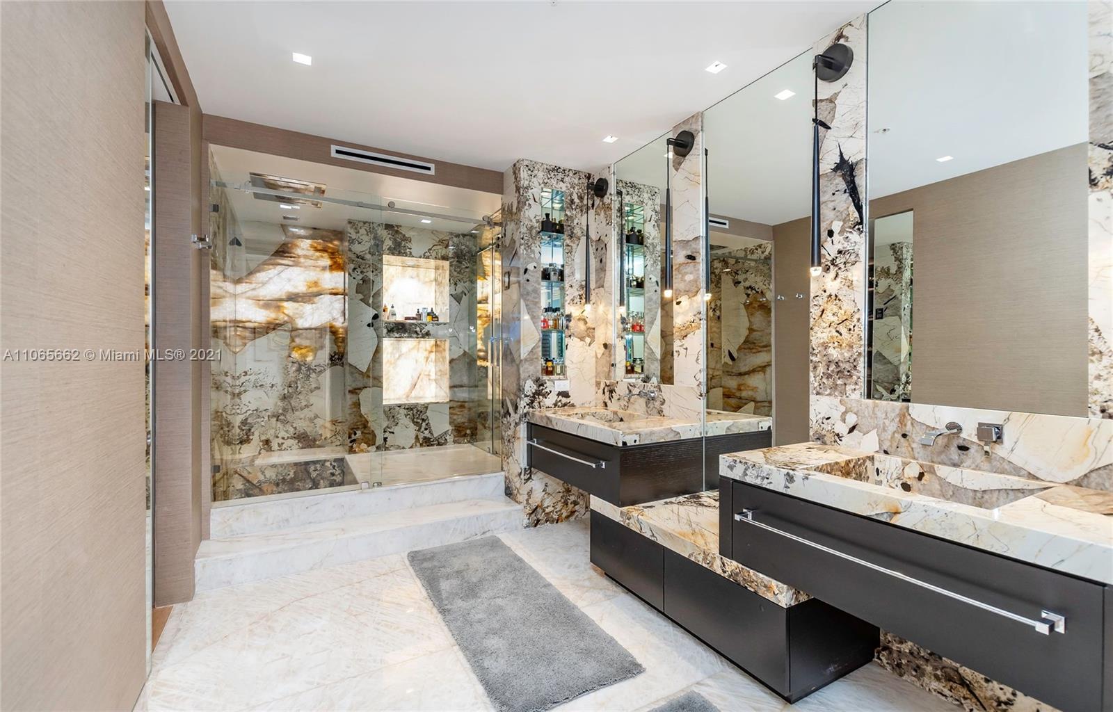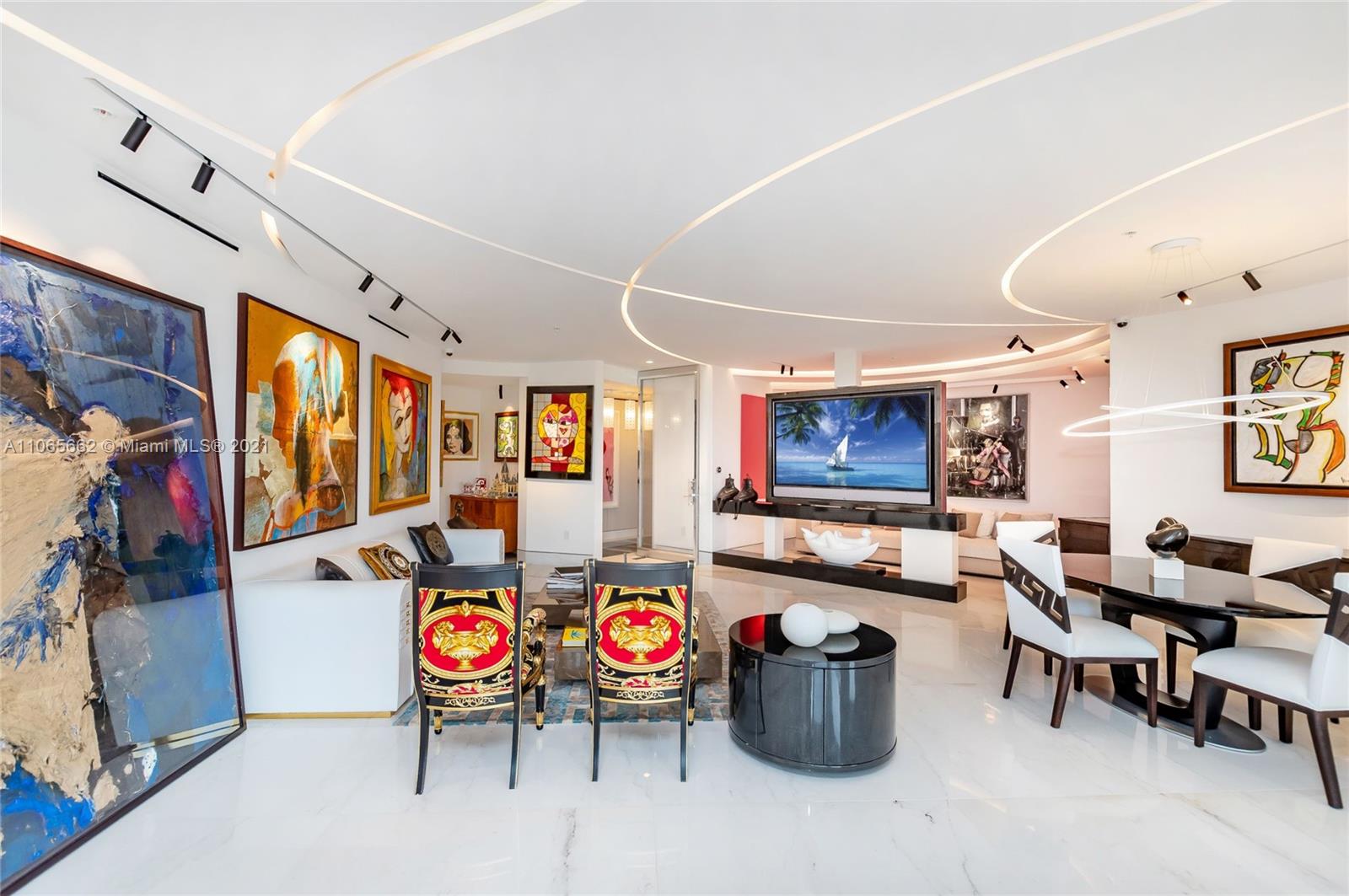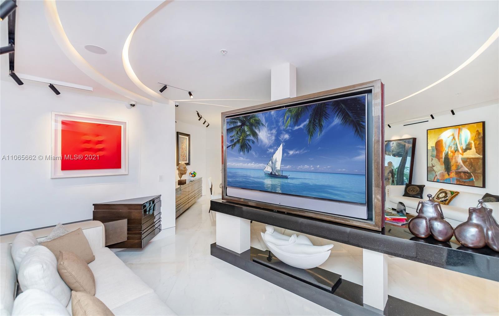 Masterpiece with pure luxury; caring all details in this stunning Versace-style property. All unique and sleek remodeled with high-end materials hand-chosen in Italy and Europe. Exquisite walls of onyx with stunning internal illumination, giving you unparalleled elegance and excellence in this impressive property. Gorgeous flooring, and wood details add distinctive touches at every turn. The kitchen features Miele appliances, custom cabinetry. A private elevator leads you into your exclusive foyer, leading to a modern open space with a breathtaking water view. Unique custom-built family/media area with a mobile TV, offering great entertaining and fantastic family time. A distinctive retractible Tv-System coming from the roof optimizes all space in the cozy master bedroom. You must see it.