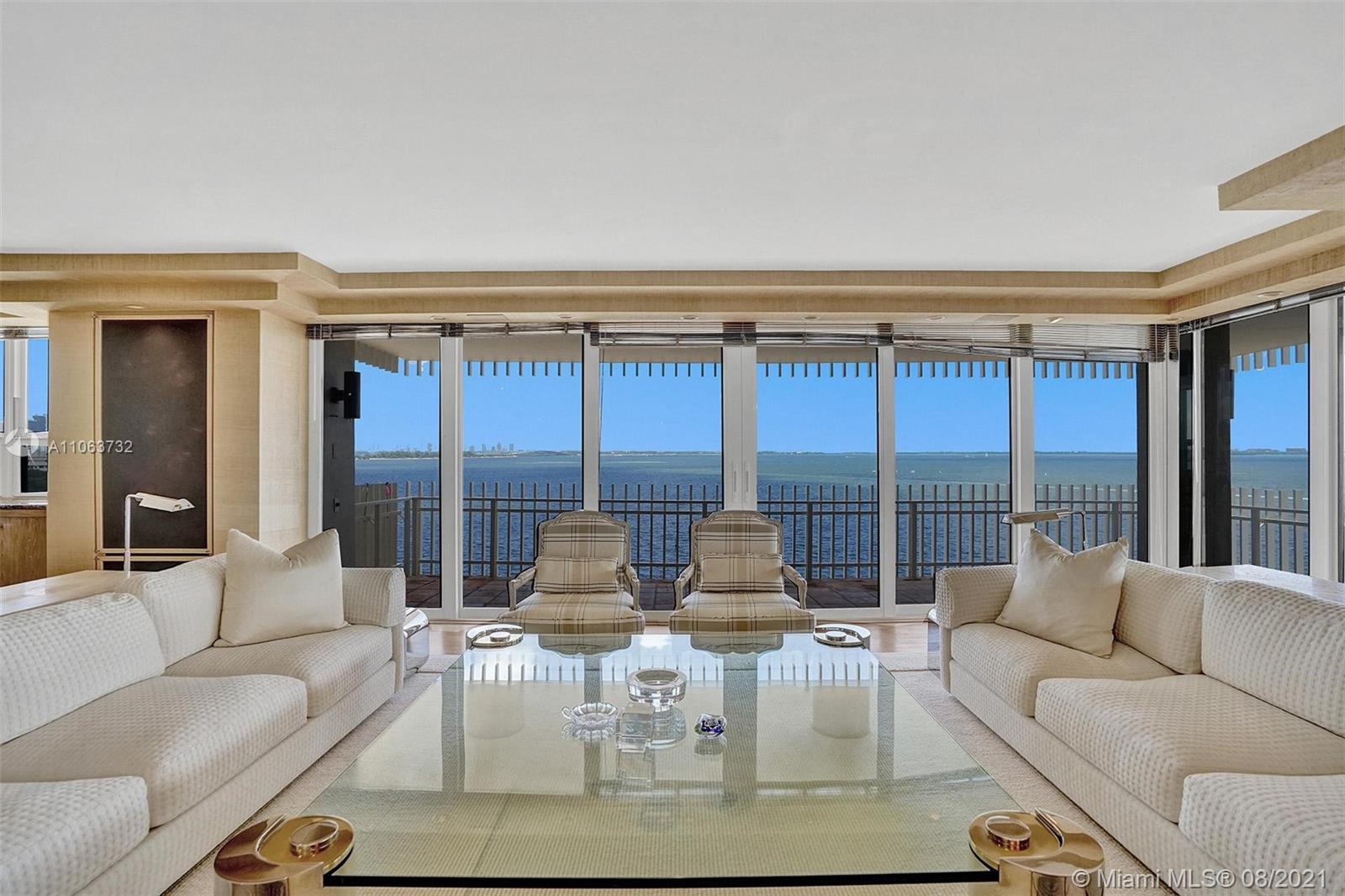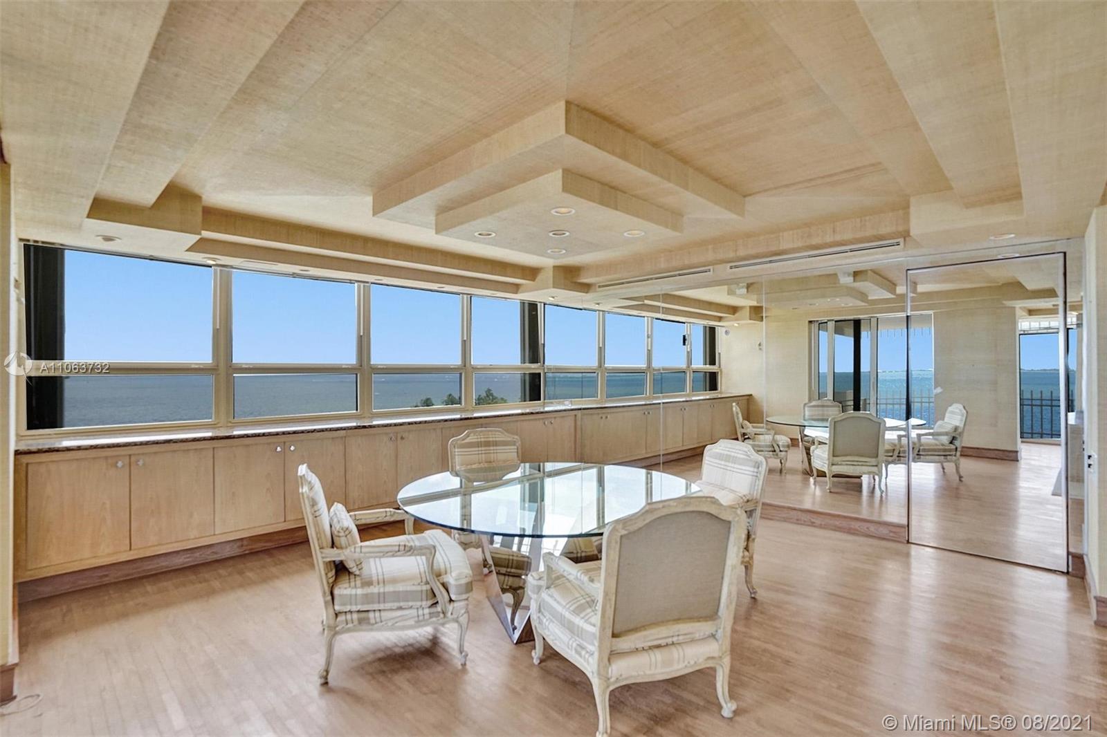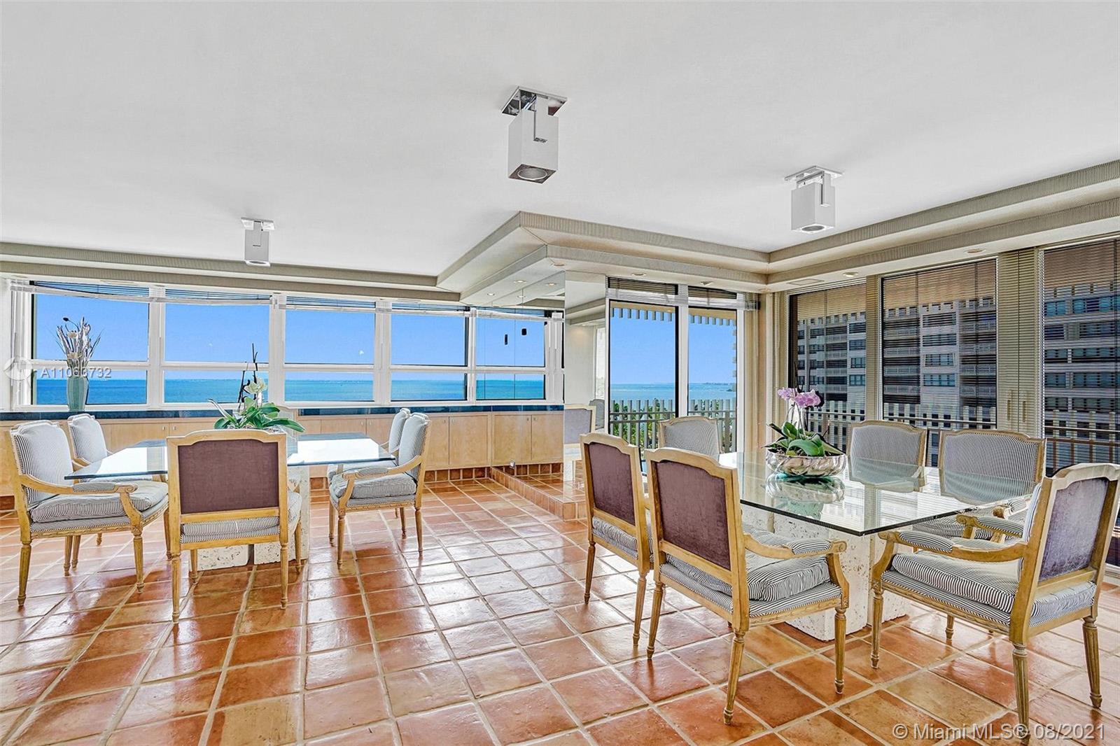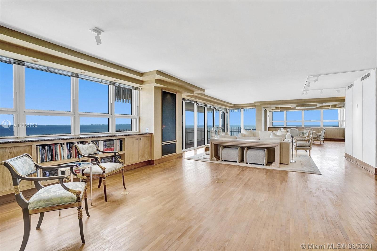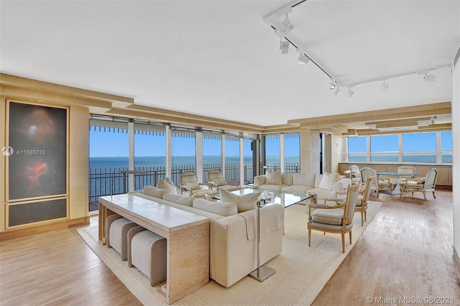 SPECTACULAR 5,012 sf GROVE ISLE APARTMENT: 270 degrees stunning views Biscayne Bay & Coconut Grove. Two 3-bedroom corner units combined by the original (and only) owner with special architectural features to create a home designed for gracious living and entertaining. SPECIAL FEATURES: Approx. 51 ft Living room (space for a grand piano); 32 ft entrance hall; dining room: permanent seating for 16 – and 24 for special occasions; Primary bedroom and attached sitting room, his & hers separate bathrooms & closets; large Library/TV room; large Office & file space; 4 terraces; Guest suite; Service bedroom & bath for housekeeper, health aide, or catering staff. Grove Isle is a secure 20-acre guarded island with full services and resort style amenities. This unique apartment is a rare opportunity.