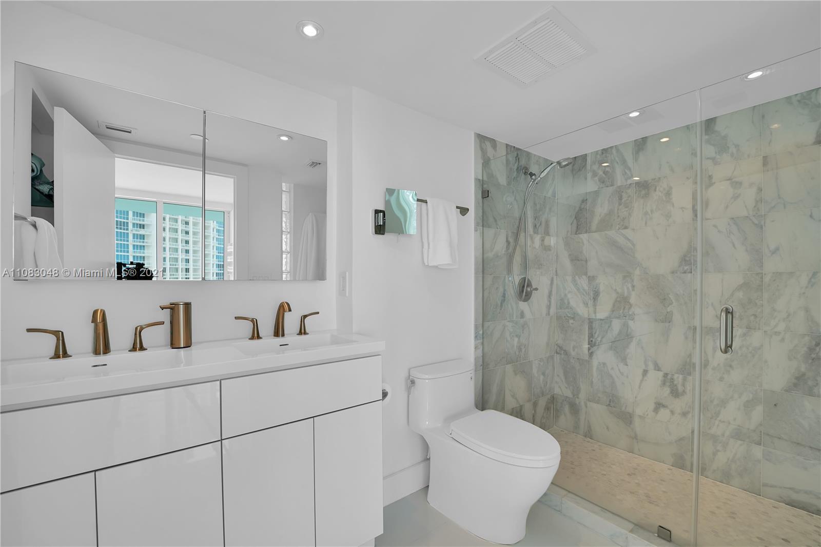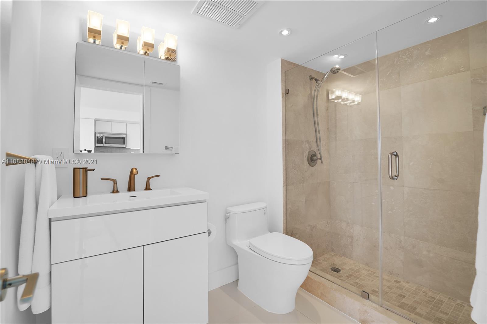 Renovated 2 bed 2 bath unit in full-service South of Fifth building. Open kitchen with quartz counters. Main suite features en-suite bath with double vanity and walk-in shower. Walk-in closets with custom cabinetry. White marble glass floors and window shades throughout. This home is move in ready. Parking and storage unit. The building features resort style amenities which are in the final stages of renovation. All assessments for work underway have been paid in full.