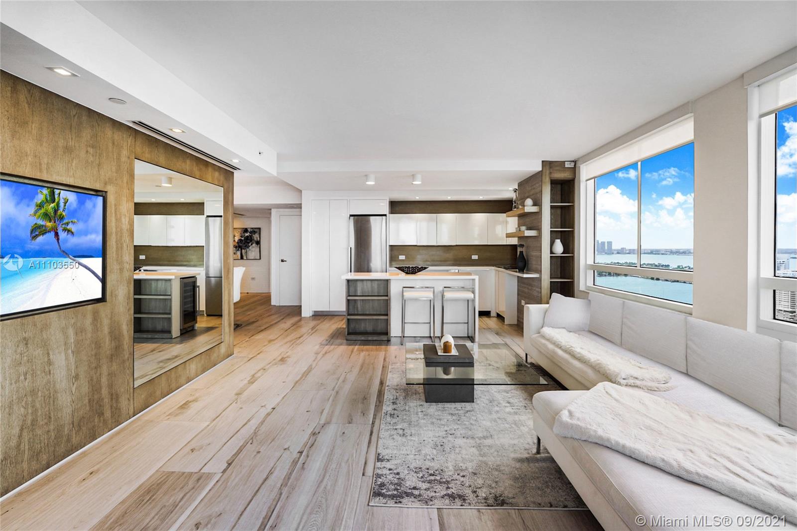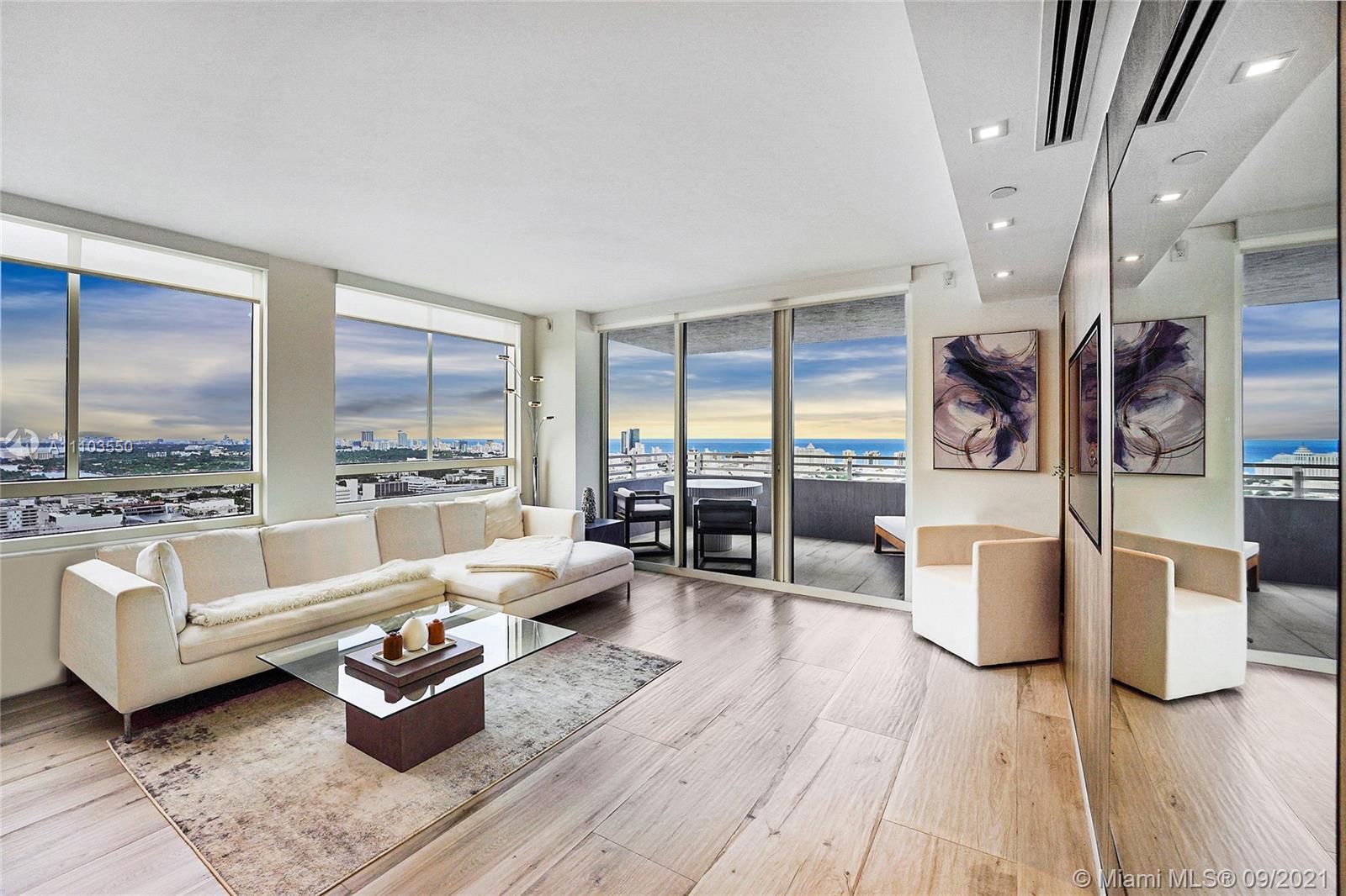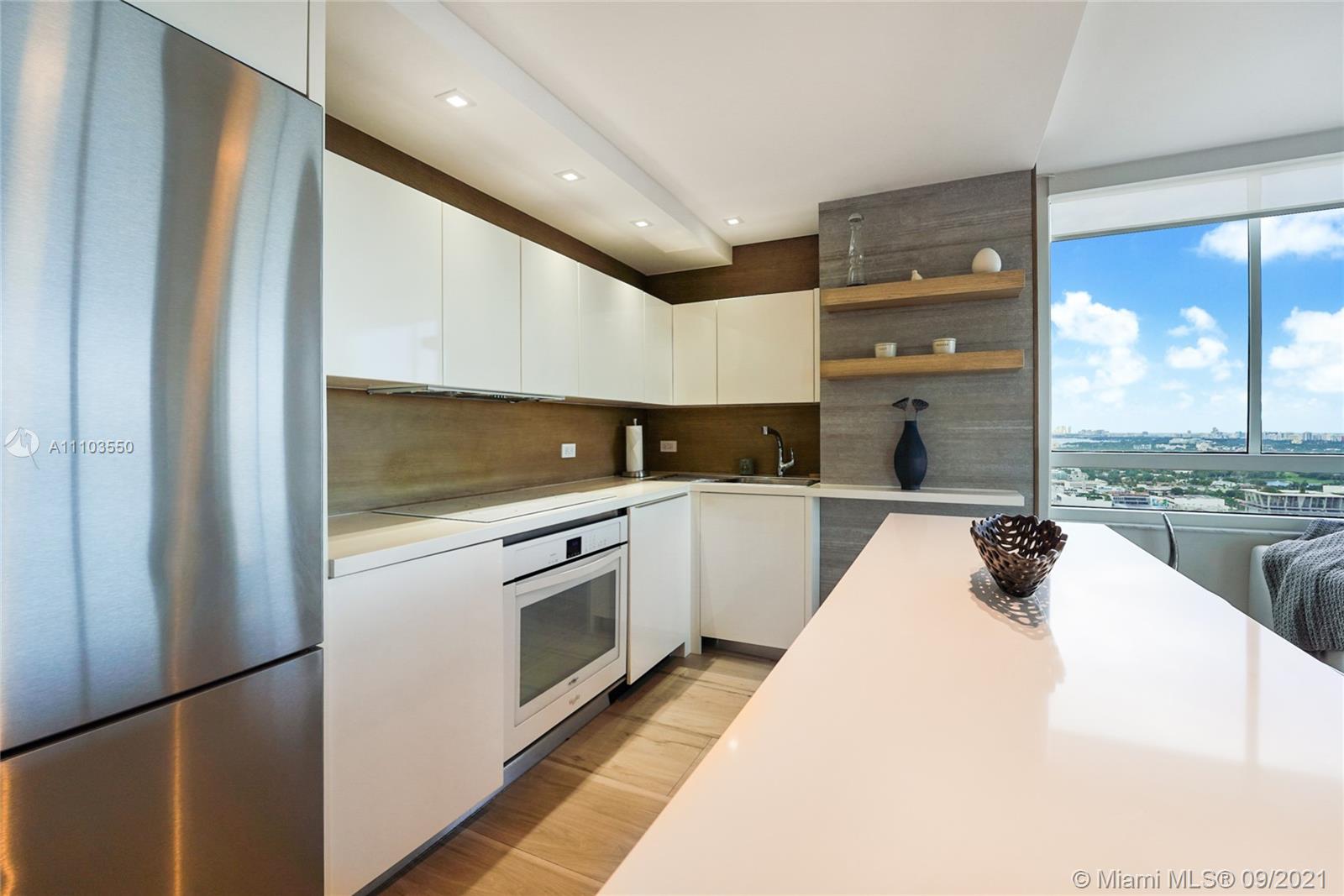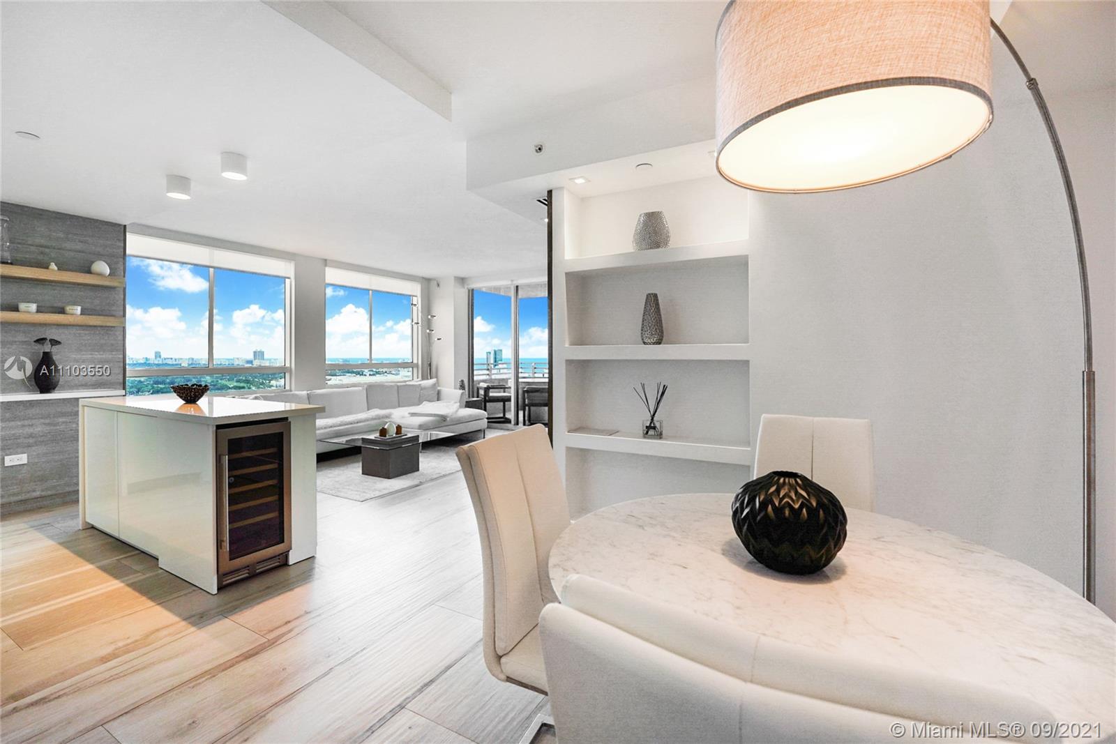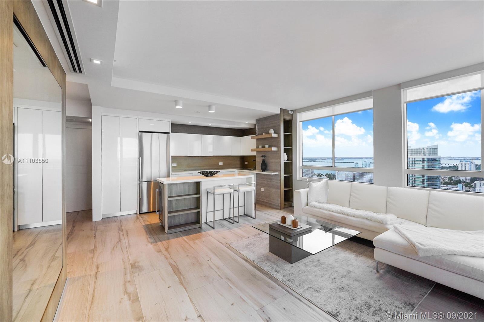 Experience the luxury of the renowned architecture and design firm Lineaire Designs and F&S Developers. This 2 bedroom, 2 bathroom condo on the 34th floor is completely renovated, featuring custom woodwork, extensive plank tiling, lacquer kitchen cabinetry, quartz counters, & modern appliances. The kitchen & living room areas have expansive city & water views, making for incredible evening and sunrise occasions. Other features include fully remodeled bathrooms, custom closet cabinetry, electric window blinds, & a large deep terrace off the living room. The Waverly is a bayfront luxury high-rise building that is full-service, including 24-hour security, front desk, valet, a bayfront pool w/jacuzzi, volleyball gym, tennis courts, business room, garage parking, & so much more.