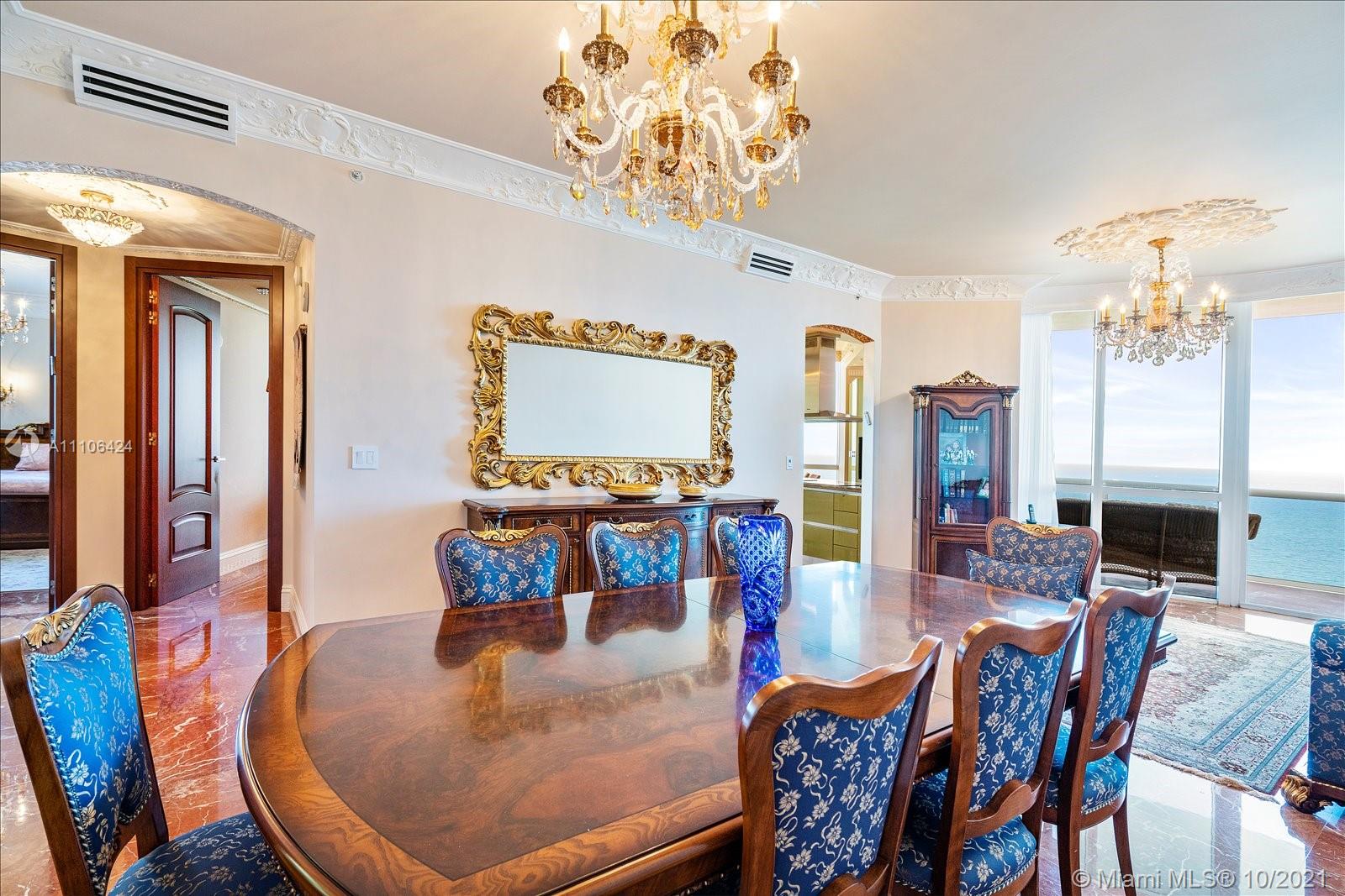 This is the largest two bedroom floor plan in Trump Royale, and boasts endless oceanfront views from all of the floor to ceiling windows in this corner east facing unit. Ceilings are true 10 ft in this unit! Enjoy a large living area, eat in kitchen, and an oversized master bedroom and master closet. No expense was sparred! Owner gutted the entire unit , marble and onyx floors, custom Italian doors, custom bathrooms and custom Italian kitchen featuring two subzero refrigerators, all upgraded Miele appliances with two stoves and two sinks. Miele washer and dryer. Custom closets, crown moldings , ceiling designs, custom lighting, chandeliers, all Italian furniture and so much more. Fully equipped, just bring your toothbrush!