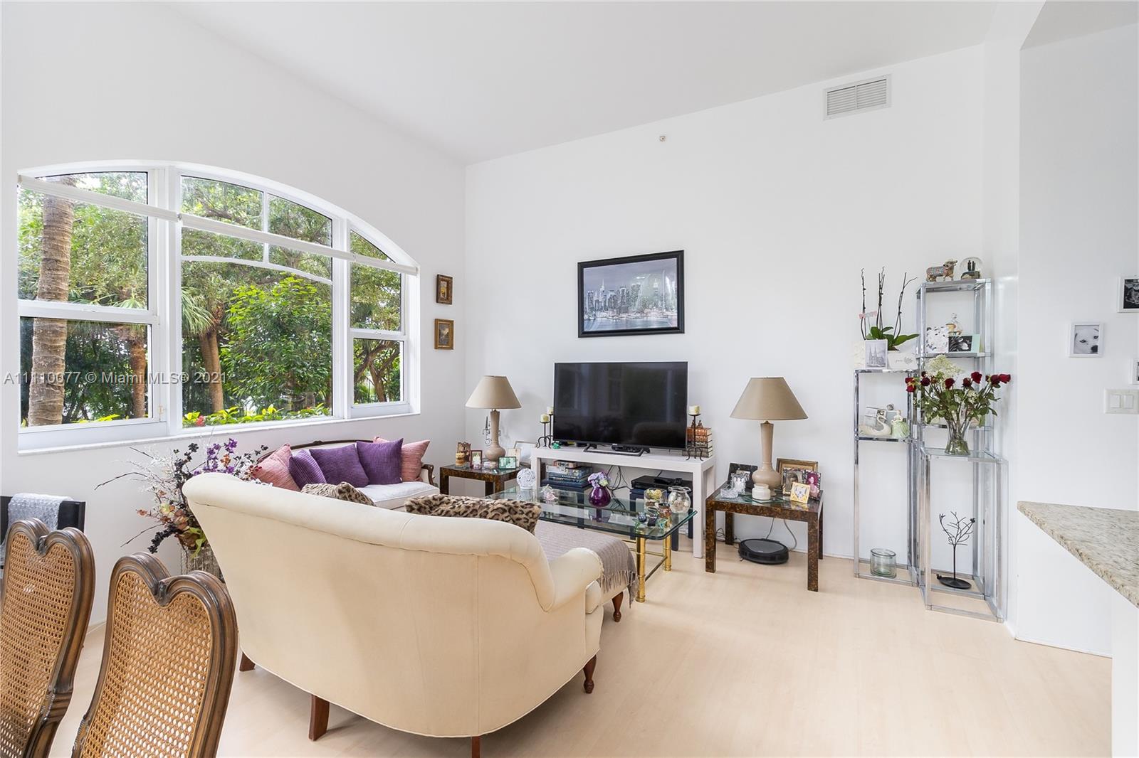 This condo feels like you're living in a house! Incredible open living space with 14ft ceilings and huge windows overlooking lush landscaping with golf course behind it. Spacious patio expands the living space for entertaining. European cabinets with elegant granite countertops and especially long open kitchen counter for seating. Very large bedrooms, walk-in closets, split plan, both with large bathrooms ensuite. Unit is located on ground floor, easy access to the amenities, the lobby, and for walking your dogs. Amazing location on Aventura Circle, walking distance to Aventura Mall, Founders Park, and a drive away to Gulfstream.