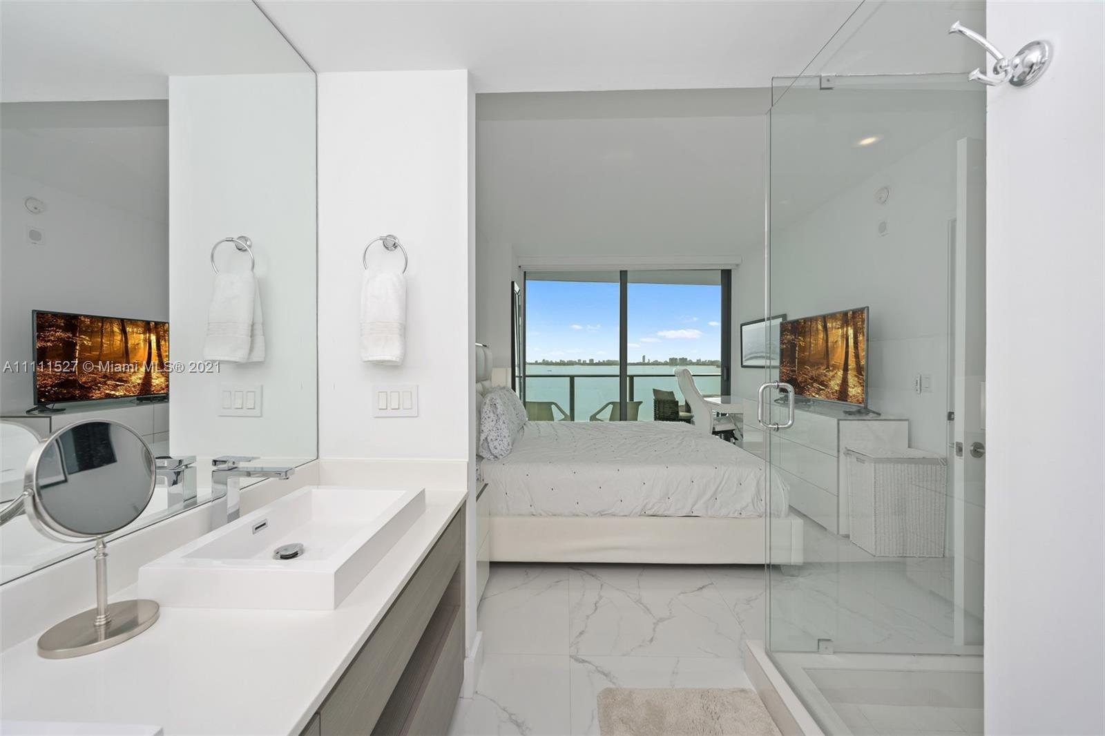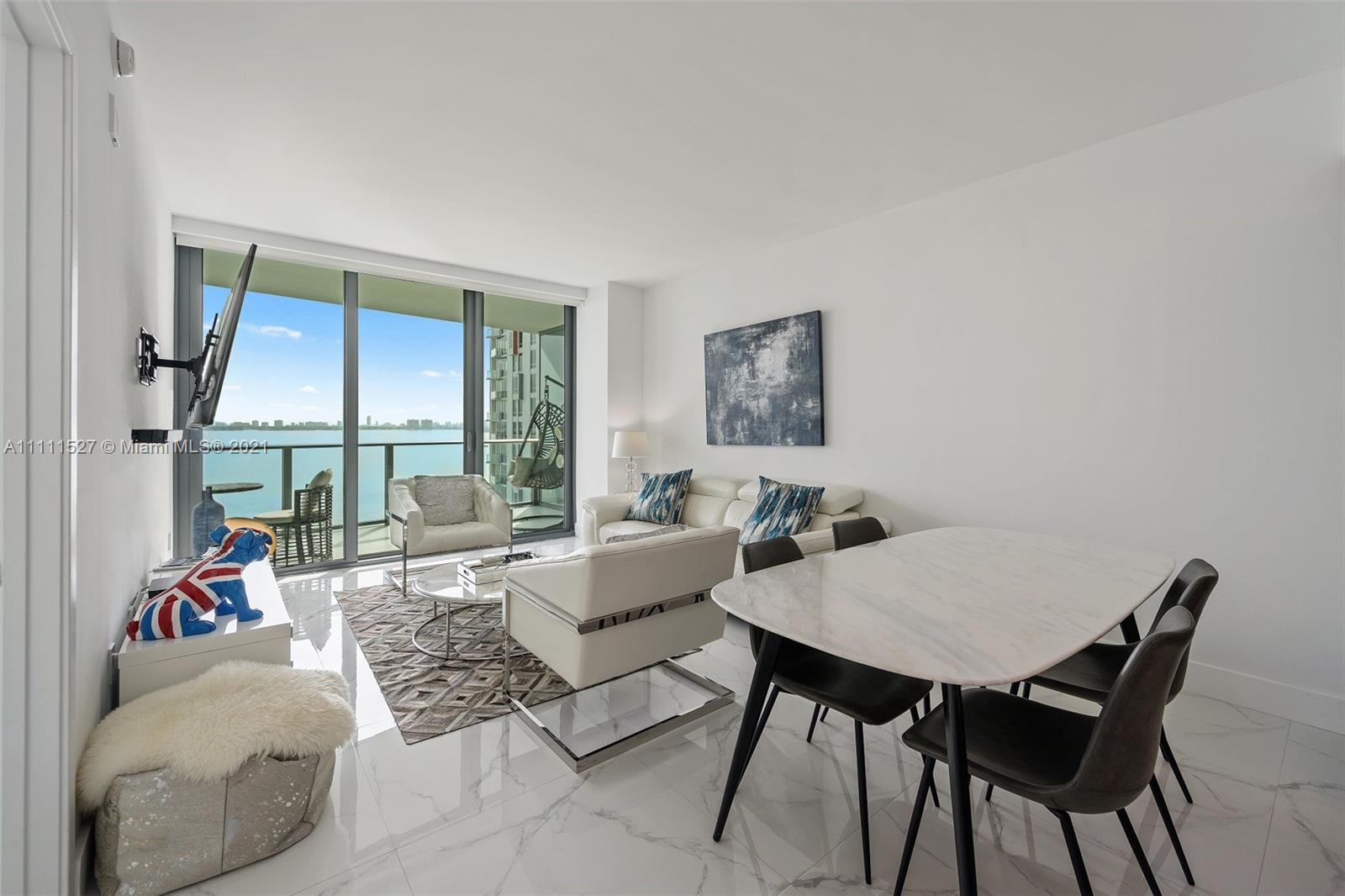 Spectacular unit with amazing views of Biscayne Bay, private elevator foyer, luxurious porcelain tile Statuario Alphino size 32 x 32 throughout the unit, electric window treatments with remote control in master bedroom and living room area. Live in the best location in Edgewater with full access to world class amenities such as tennis courts, bayview pool and gym, social lounge, spa and much more! Apartment shows like a model unit, very easy to show