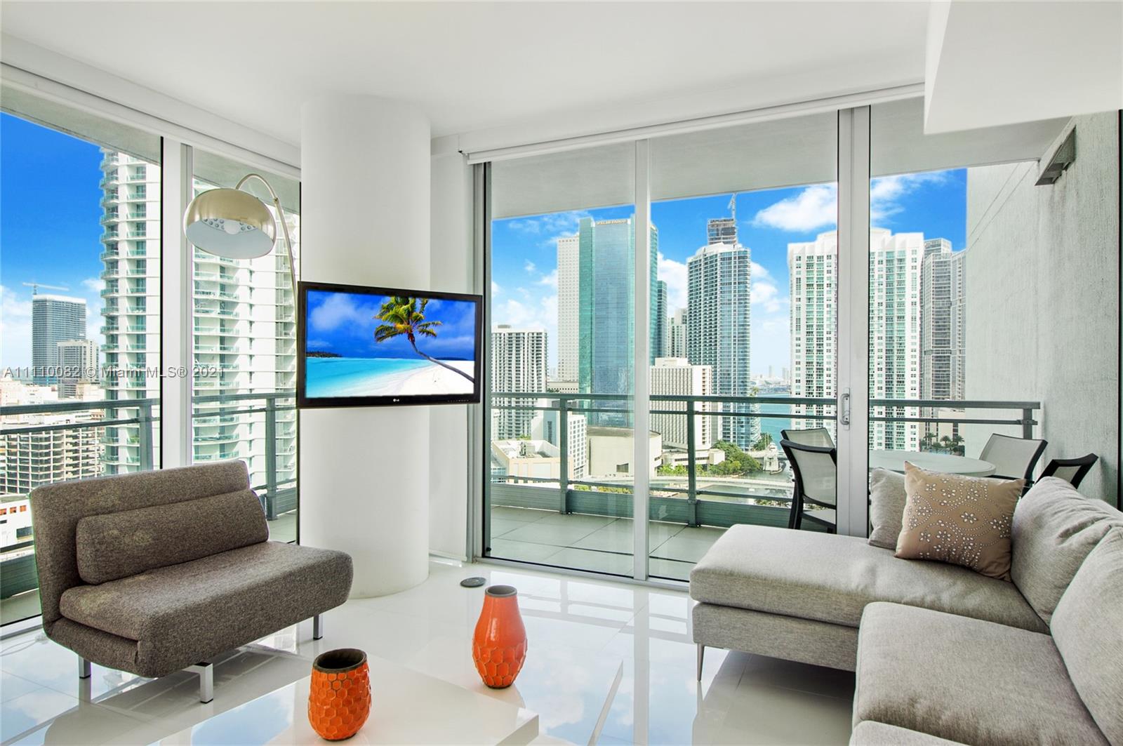 Most desirable 10-line corner unit at Mint Riverfront, a luxury condo, with almost 1,400 SqFt w/ 2 beds & 2.5 baths, white crystal title flooring throughout the unit and two large balconies at 25th floor, 180 Degree open views of Brickell Skyline, Miami River , Downtown & also west for the Sunset! European kitchen with top-of-the-line stainless steel appliances, built-in closets, new washer and dryer, new AC machine and more. Walking distance to BRICKELL CITY CENTRE, Riverfront location and 5-Star amenities!! Gated community. Ready to move in!! Selling Furnished!