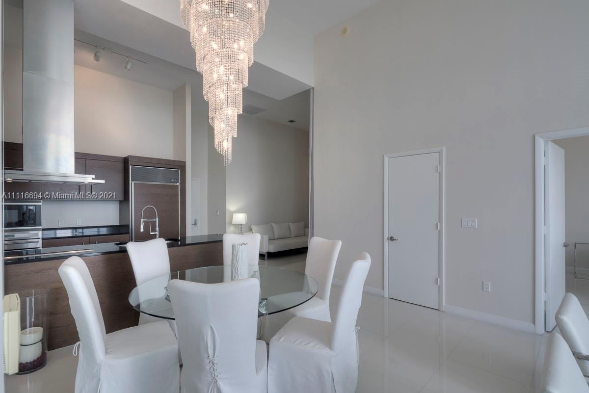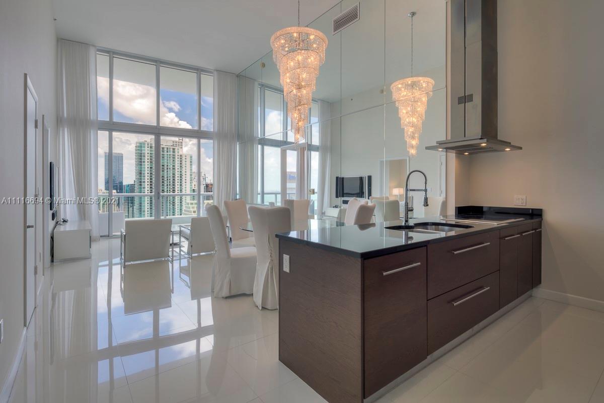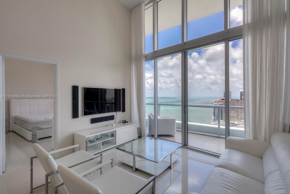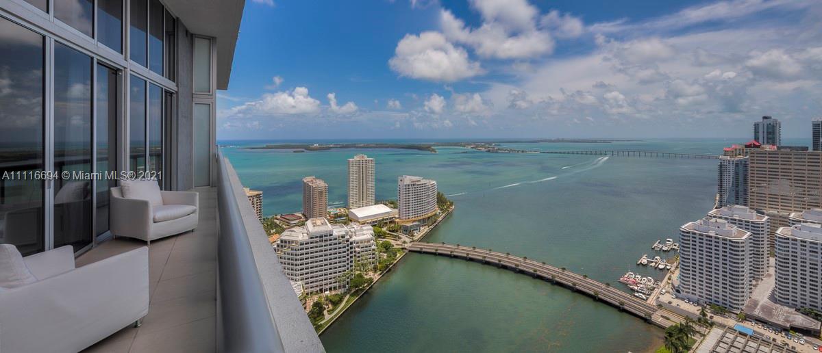 An impressive 2 Bed + Den/2 Bath condo residence w/ 1,518 interior square feet, a 220-square-foot-balcony, 16-FOOT-HIGH CEILINGS, white porcelain tiled floors, motorized shades in both bedrooms, and three crystal chandeliers. Breathtaking views of Biscayne Bay and Brickell skyline from the 41st floor. Building amenities include a 300-foot long swimming pool, 50-person hot tub, state-of-the-art fitness center, full-service spa, on-site restaurants, theater, game room, full-service concierge, valet parking, and more. Includes 1 assigned parking space.