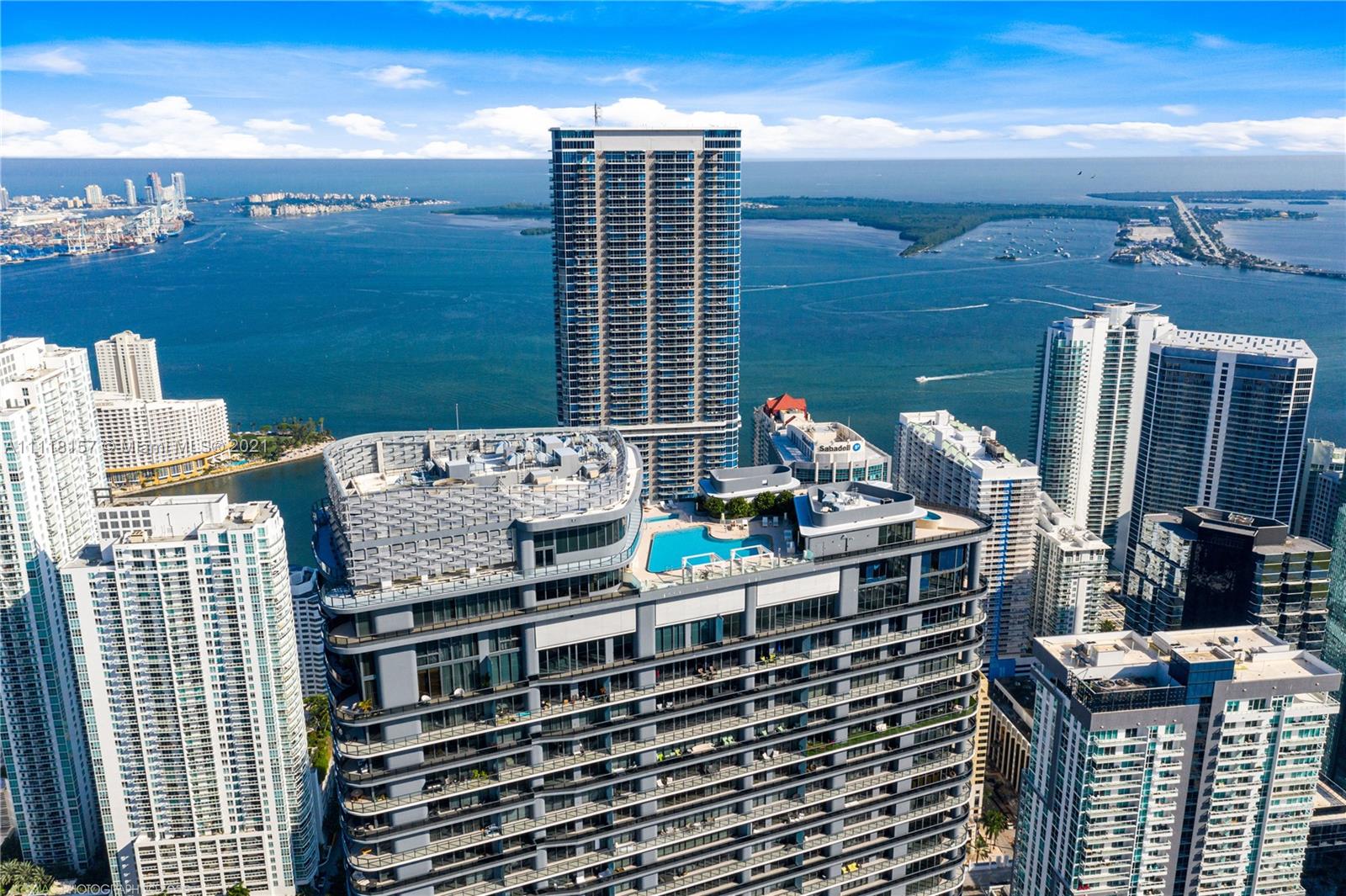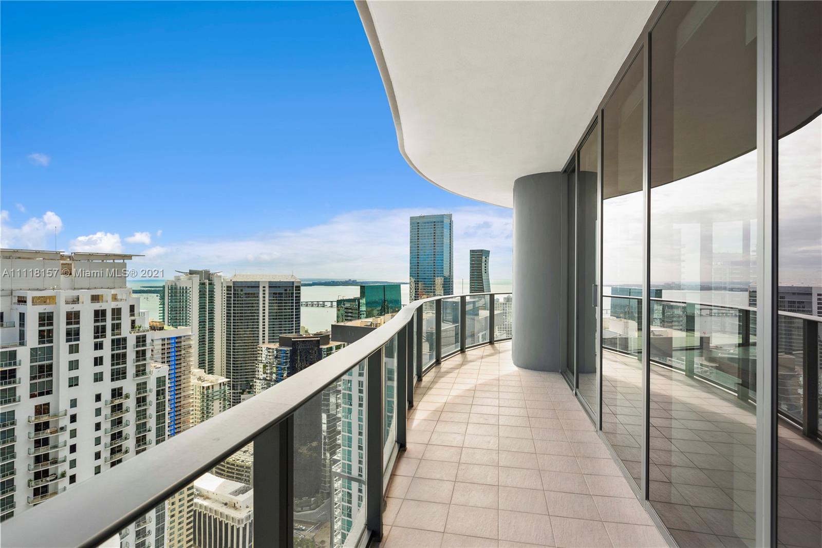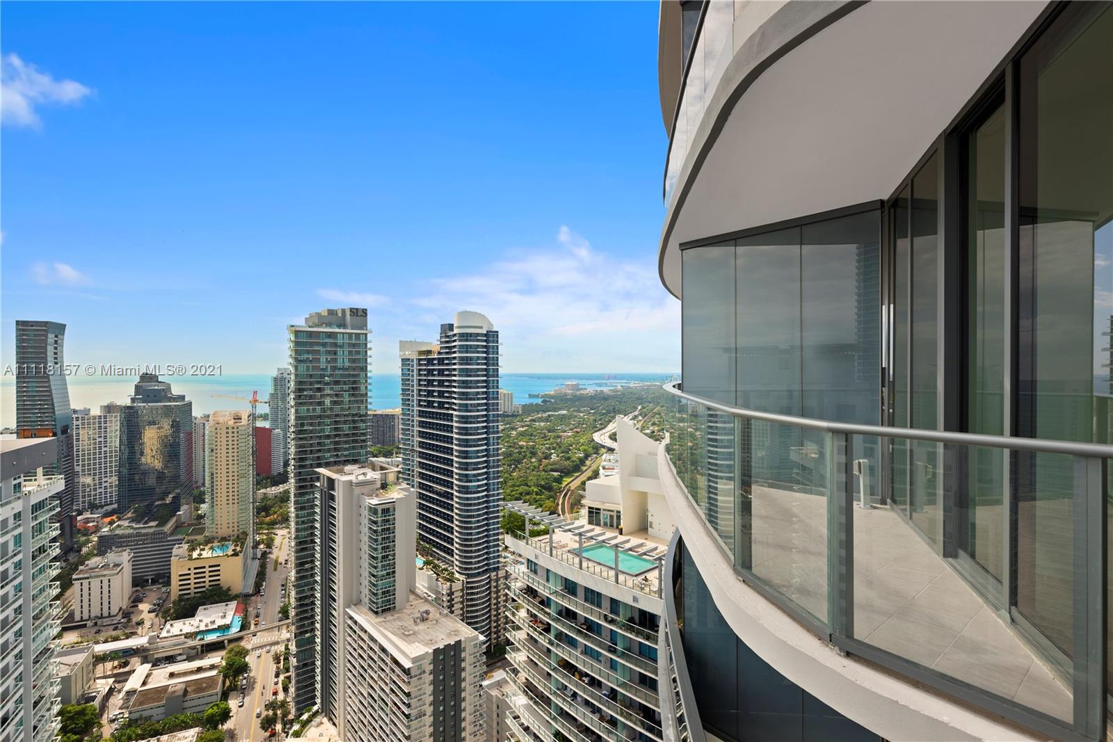 Brickell Flatiron Penthouse. Unobstructed panoramic views with SE Exposure [Best line] Corner unit with wrap around balconies throughout. 3 Beds- 3.5 Baths with 1,955 SQFT of living area, 10 ft. ceilings, floor to ceiling impact windows and sliding doors, Italian Snaidero Kitchens and Bathrooms, built-out closets, Miele appliances, and other luxury finishes. Full-service building with concierge service and resort style amenities includes the 64th Floor Sky Club, a spa, gym, theater, and lap pool, club room, lounge room, movie theater & Billiards. Two assigned parking space and valet service. Fantastic location in the heart of Brickell. Vacant turn-key unit easy to show.