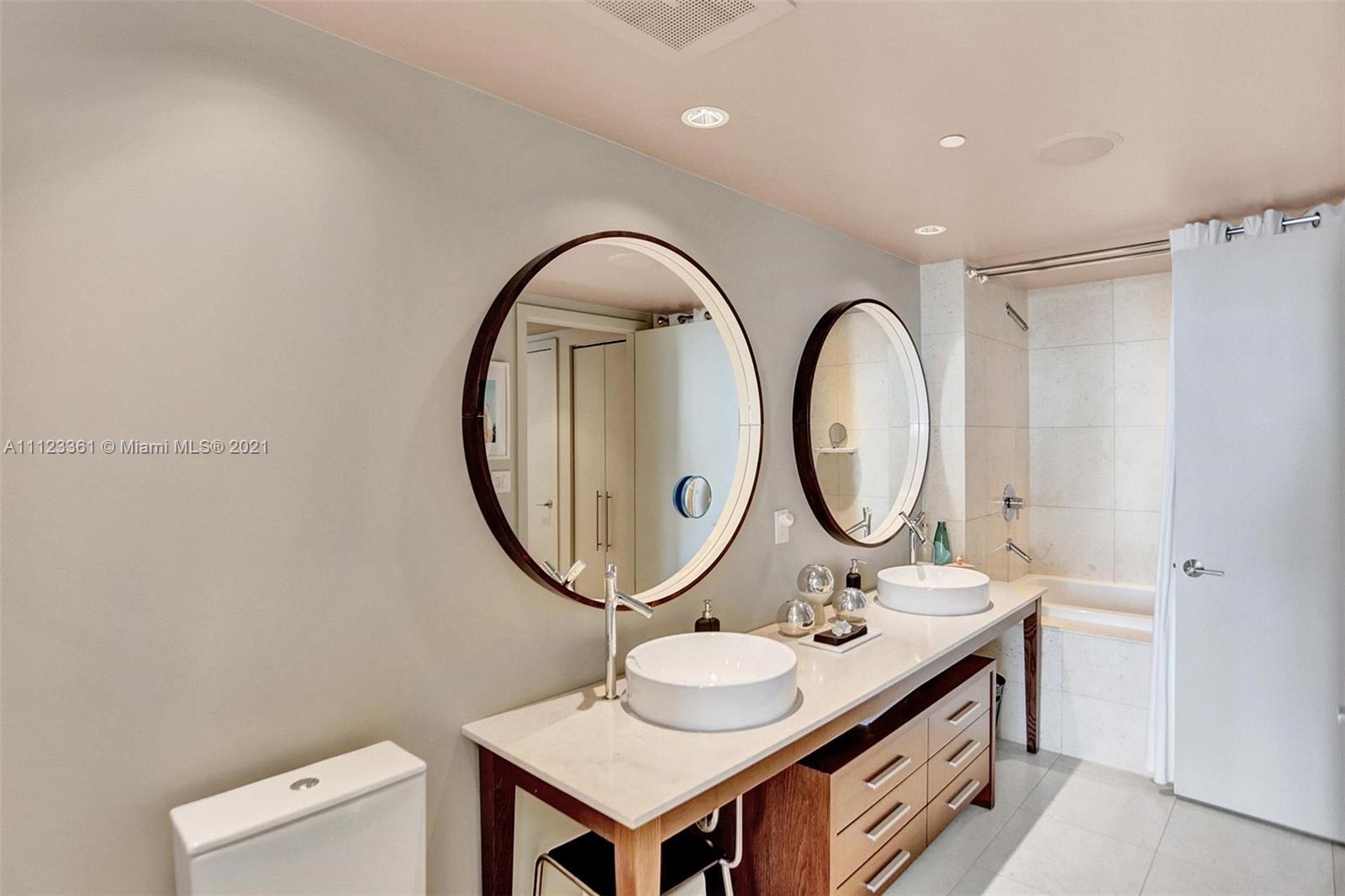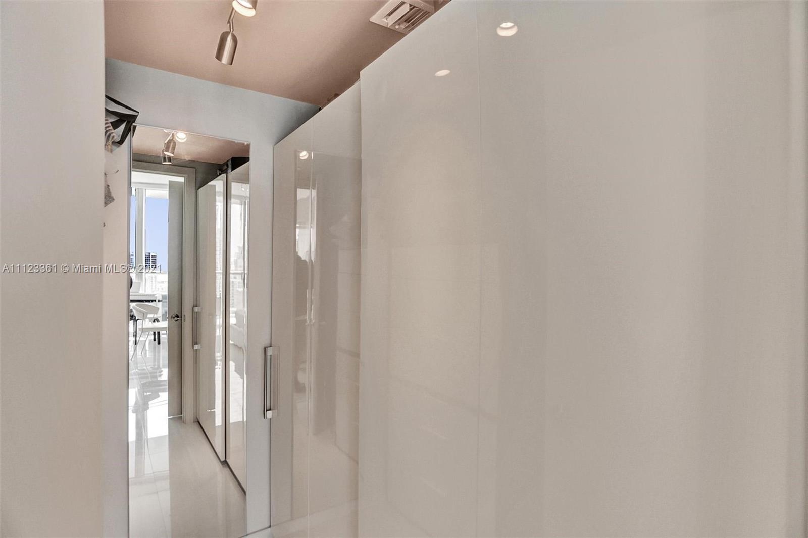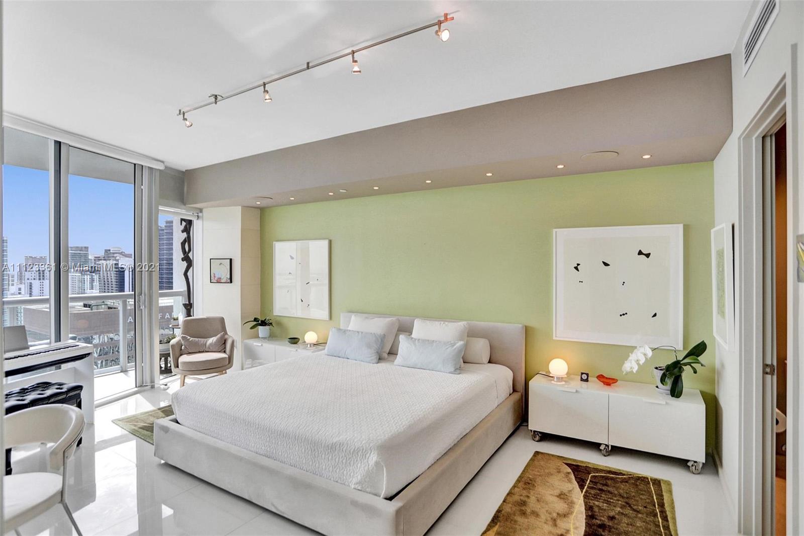 Beautifully designed and professionally decorated! There is no other unit like it! This residence offers incredible high floor bay and magical city views along with amazing finishes and tech automation! Features include beautiful 24X24 interior white glossy porcelain floors -flat finish on the balcony. Custom media built-ins with storage, open kitchen with high-end appliances, Lutron controlled light switches, track lighting and dining room light fixture by tech lighting, nest thermostat, built-in wall speakers, built-in ethanol fireplace, wireless outdoor Sonos speaker, led light strip on balcony. Bedroom has walk-in closet with custom built-ins, en-suite bathroom with double sinks and mirrors. 2 TV’s and 2 DVD’s also included. Live at one of the most desirable addresses in Miami.