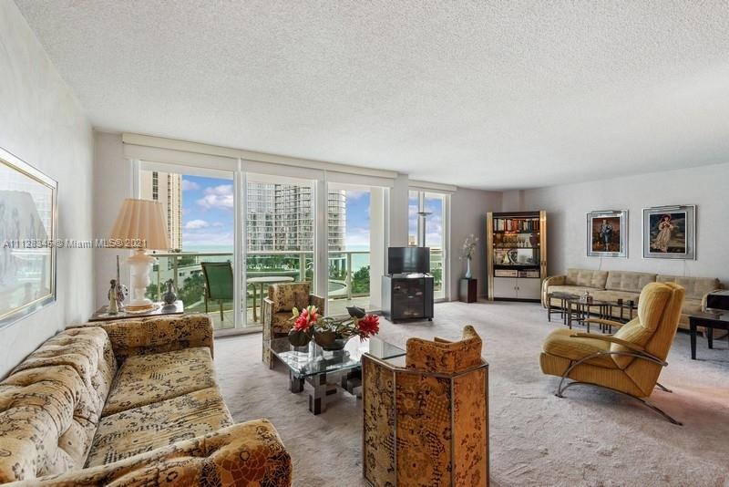 Looking for your own place across the street from the beach with a direct ocean view? Then, look no further than this 1331sf 2/2, currently set up as a 1 BR convertible with an expansive balcony & floor to ceiling hurricane impact glass from every room. Though in need of some upgrading, this condo is in move-in condition. The kitchen has been remodeled & has a small breakfast counter. The formal dining room has a built in bar & you can add a wall to the great room to create a private second bedroom as per the tax roll. The bathrooms were changed in past years & the primary bathroom has a whirlpool tub. Additional features include custom closets, a newer A/C & covered parking. A great Sunny Isles Beach location across from the new Ritz Carlton. Secure your place in the sun today!