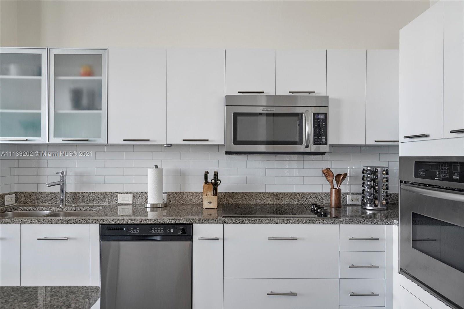 Beautiful penthouse with impressive views; Modern and tastefully updated loft with 14 foot high ceilings and private furnished 510 Sq ft. Roof Top Terrace, with unobstructed views. Kitchen redone with updated cabinets, new backsplash, and new installed wine cooler. Brand new custom-built 10 feet high bedroom closets with clothing racks and built-in dresser drawers. Brand new custom-designed office with 8 foot high built-in cabinets for additional clothing space, and custom cabinets installed over the office, for additional office storage space. Marble flooring throughout the unit-including the Patio area. New Lighting, Fans, and chandelier throughout the Loft. Updated Bathrooms; new LED Mirrors and new light fixtures. Unit completely newly painted and sold furnished.