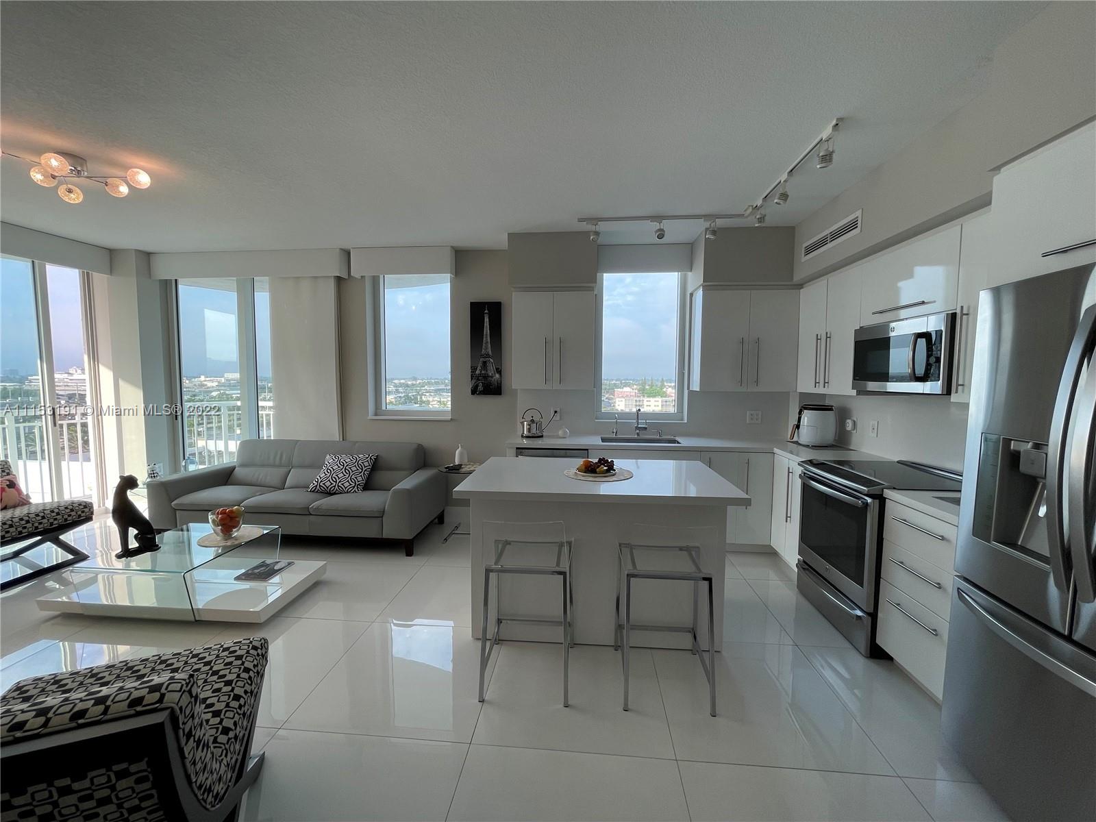Luxury at its Best at the Desirable Resort-Style Living !!! Immaculate, Completely Remodeled Corner Unit Offers a Beautiful Contemporary Lifestyle. Gorgeous Open Kitchen, High Gloss Cabinets, Quartz Counter Tops, High-End Stainless Steel Appliances, Movable Kitchen Island That Will Help You Rearrange Your Space in Seconds! Impact Windows and Doors. Customized Window Treatments, Fabric Sliding Panels, Fabric Wrapped Valances & Blackouts. Ample Main Bedroom, Custom Closets & Doors. Tastefully Remodeled Bathrooms. Sophisticated Built-In Banquette Seating in Dining Area. Elegant Porcelain Floors & Light Fixtures Throughout. Built-In Work Space in 2nd Bedroom. Amazing City Views From Your Wrap-Around Balcony. Newer Washer and Dryer. Resort-Style Amenities!! This is a Must See!!