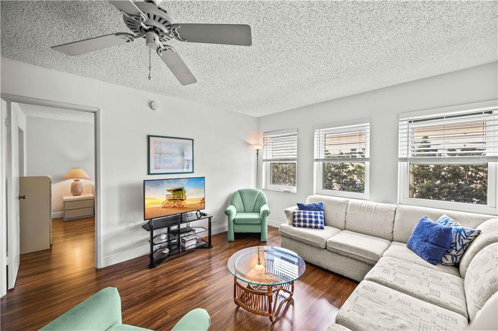 The perfect location and situated in a well managed boutique residence. Spacious 1- bedroom, 1 bath second floor west-facing unit park-side in Victoria Park. New laminate flooring, impact windows, a Kitchen with Breakfast Bar pass thru, generous amount of closet space plus a storage unit too. Kitchen and bath or mint 70's design and in very good condition. Assigned owner parking, tons of guest parking plus a community laundry and heated pool. Rentals permitted but pets are not allowed. Only steps to Holiday Park's tennis center and all the park has to offer. Building has passed 40 year inspections. Roof about 10 years old. No assessments are scheduled. See broker's remarks.