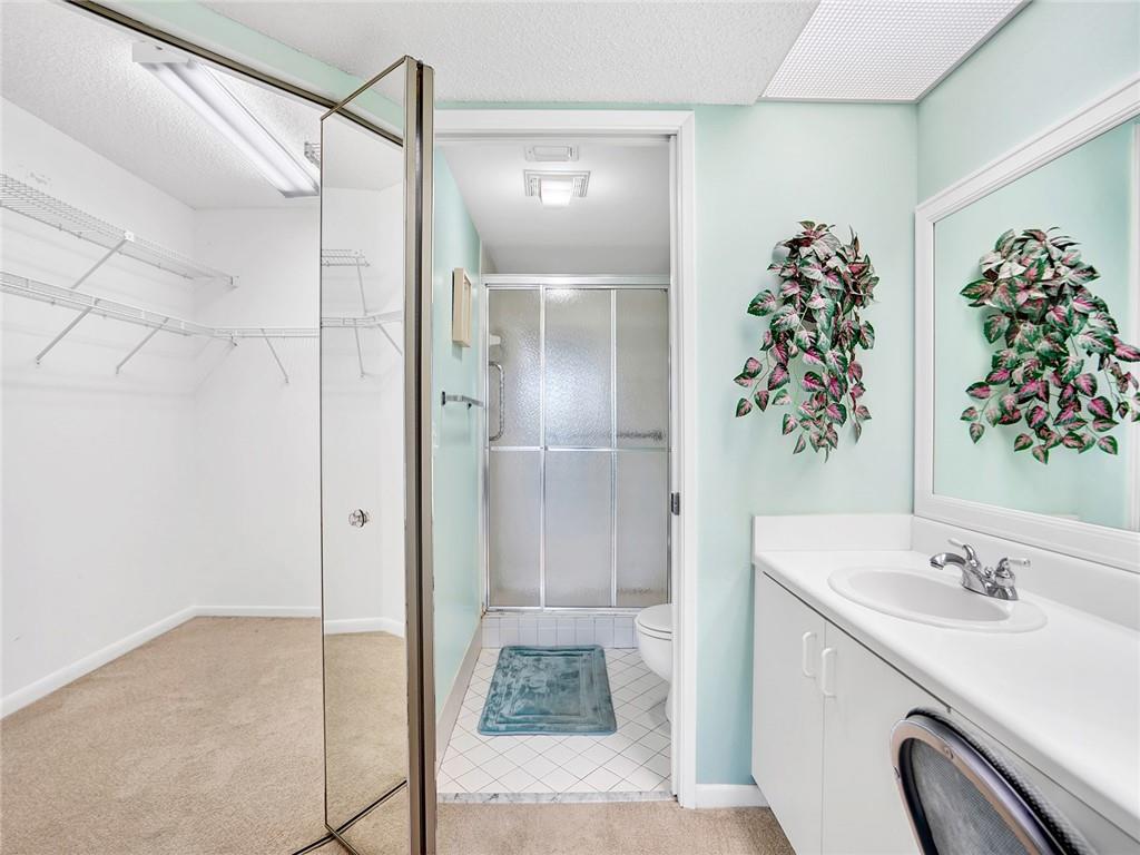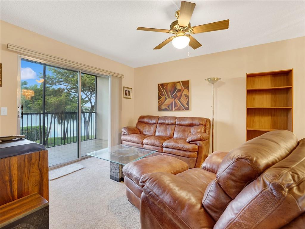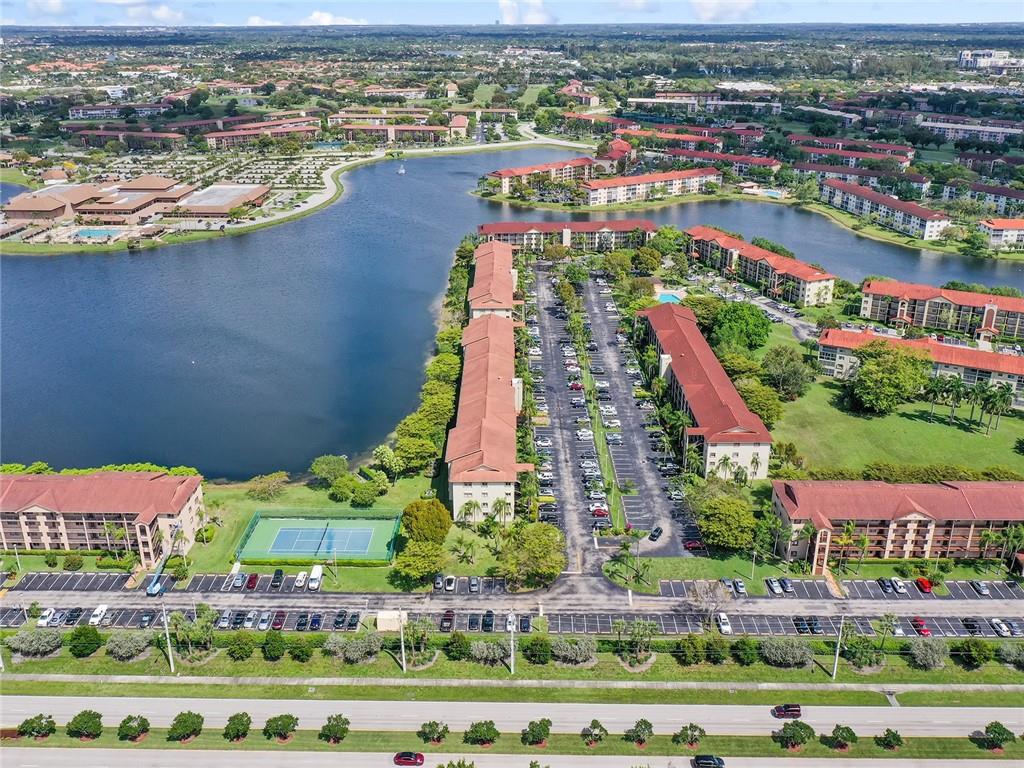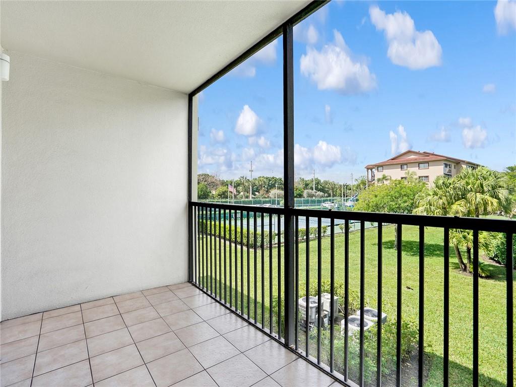 Large Karanda model w wide waterfront views. Spacious plan featuring eat-in cafe, galley style kitchen w wood laminate floors and big living & dining area that opens to a large, screened patio overlooking the lake. Generous sized Master Suite and bath w big walk-in closet, Bedroom 2 has a walk-in closet and adjacent full bathroom w tub. In-unit newer stacked washer & dryer, newer AC &, water heater, newer refrigerator, effortless rolldown and accordion shutters. This building has a newer elevator. Great location in Ivanhoe East section, close to back gate entry. Awesome community amenities, clubhouse, entertainment, gym, transportation. Condo fees include water/sewer, cable tv and internet. Please note, no pets, no rentals during the first 2 years of ownership.