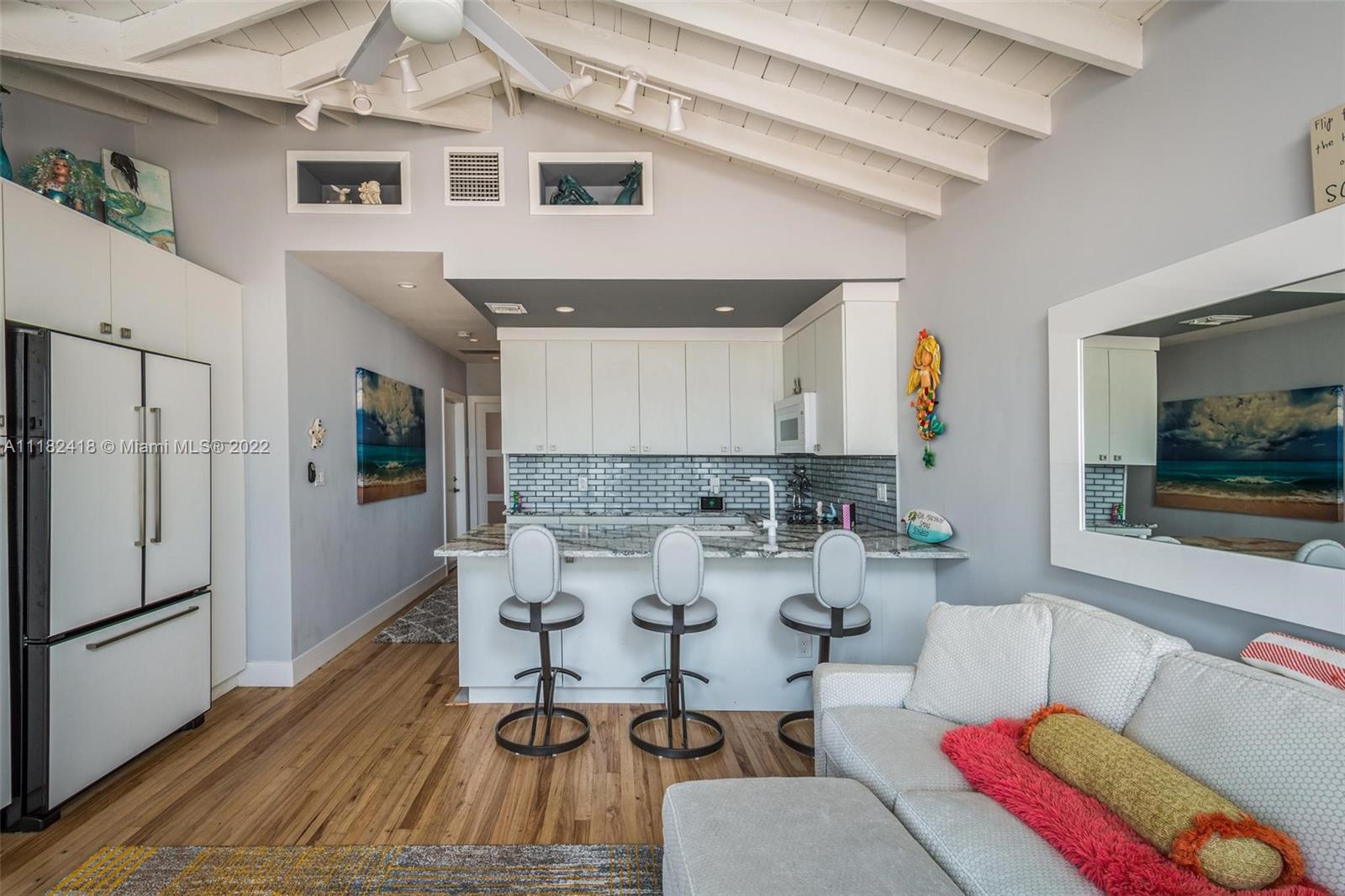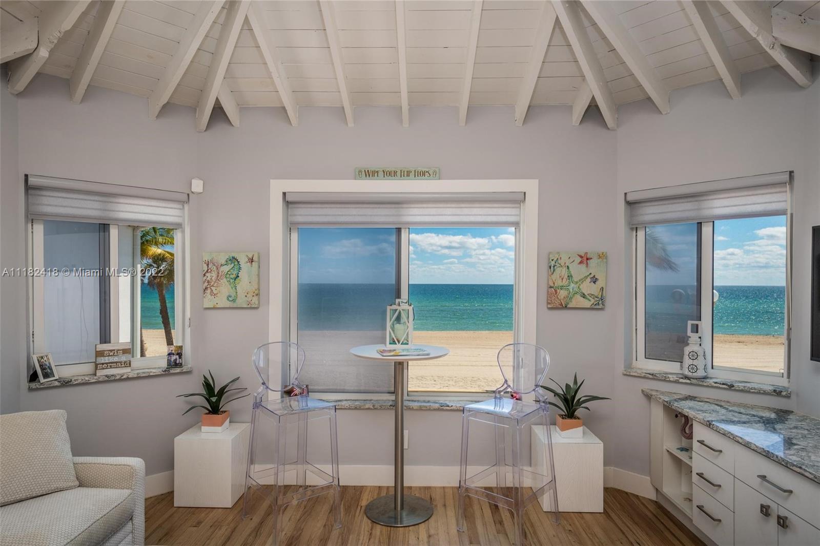This rarely available corner unit in boutique 7-unit building along the Hollywood Beach Broadwalk, is the perfect beach getaway. From the second you step through the front door you’re mesmerized by the ocean views. No detail has been overlooked in this professionally decorated 1 bed/1 bath condo. Vaulted wood finished ceiling. Wood and tile flooring. Impact glass throughout. Washer/Dryer. Updated summer kitchen for the common area. Reserved parking. You can rent 3 times a year with one month minimum.