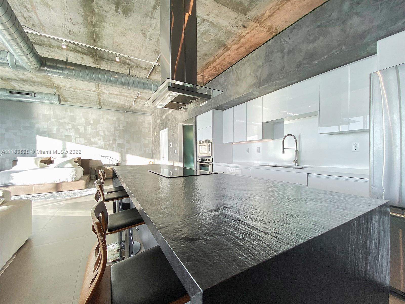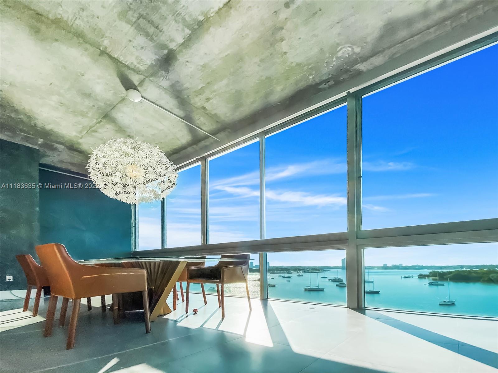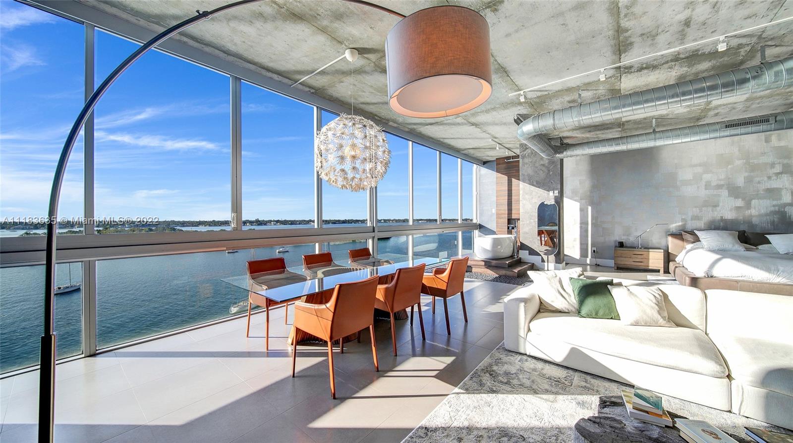 Unique loft at the contemporary Space 01 a waterfront building with panoramic views of Biscayne Bay and the Downtown Miami Skyline in North Bay Village, designed by award-winning architect Chad Oppenheim. One-of-a-kind unit with 11.16’’ high ceilings, floor to ceiling sliding door windows from side to side of the unit. All the walls in this unit are artistically covered with Faux Finish decorative painting, giving the walls a modern and sophisticated look that helps create different areas in the same space, like bedrooms, living room, dining and kitchen, facilitating flow and movement in the loft. Custom built furniture in living room, European style kitchen with stainless steel appliance , stone gourmet island with hood, wine cooler, custom closets, washer/dryer.