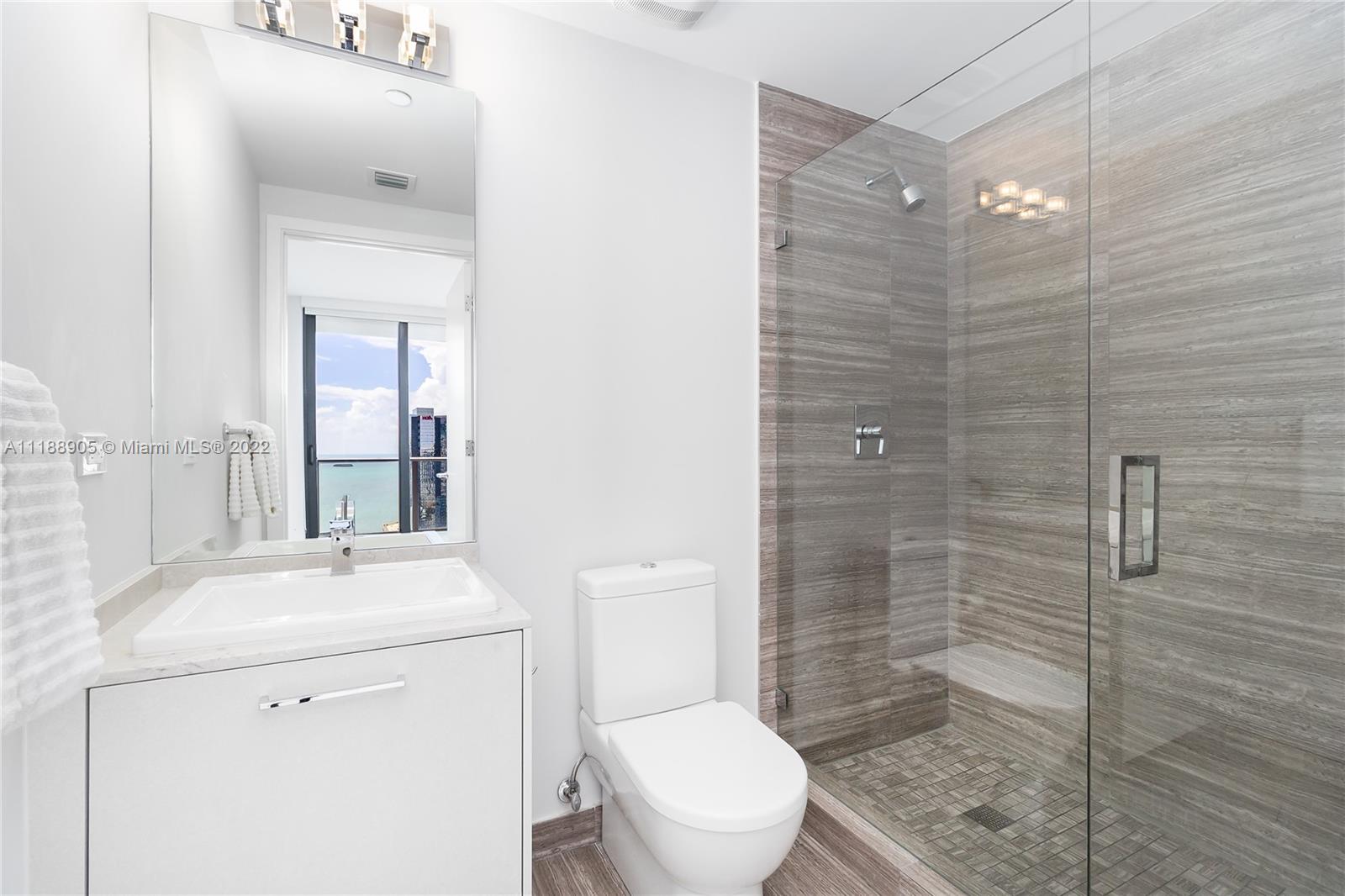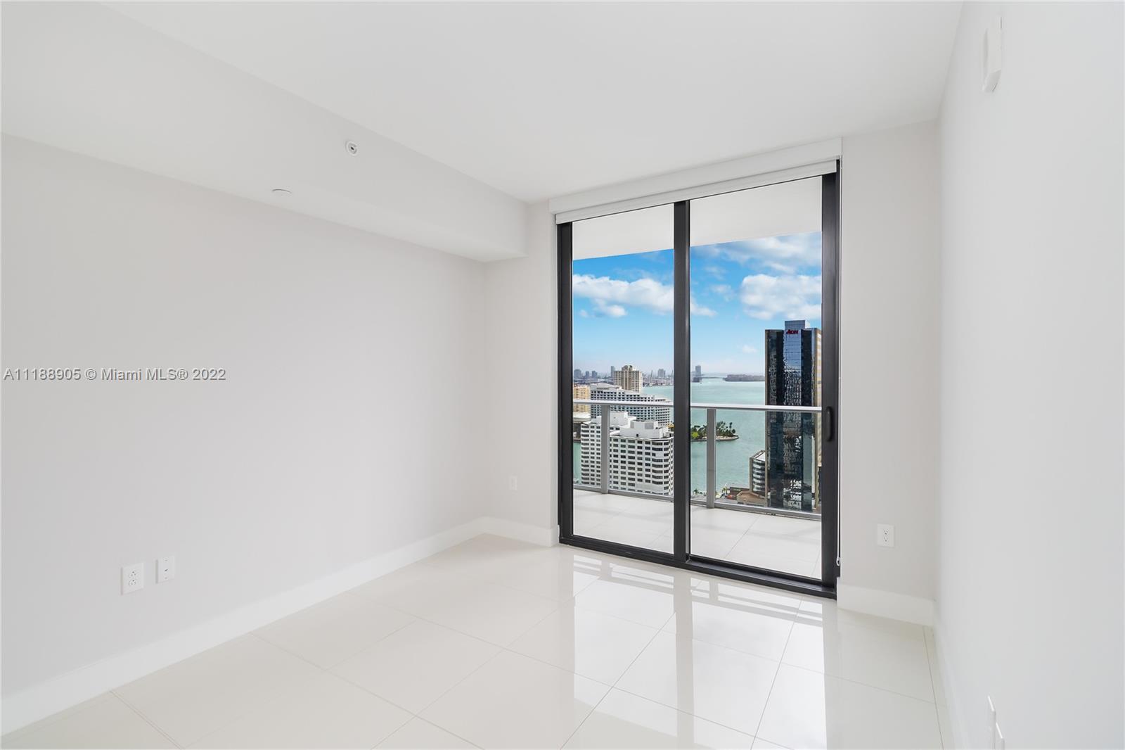 Premium high-floor unit with stunning bay and skyline views from walls of windows. Private balcony runs entire length of this skyhome with access from all rooms. Private elevator opens directly into this 2 Bedroom + enclosed den. This den includes a full bathroom so it is ideal for guests, nanny or extra bedroom. Work from Home or walk to the finance and tech offices outside your doorman lobby. Fast close welcome - tenant exits May 15, 2022. 1010 Brickell delivers resort-quality amenities including rooftop pool, children's room, running track, spa and haman, indoor basketball court, outdoor running track, club house, game room, on-site management and self-park garage.