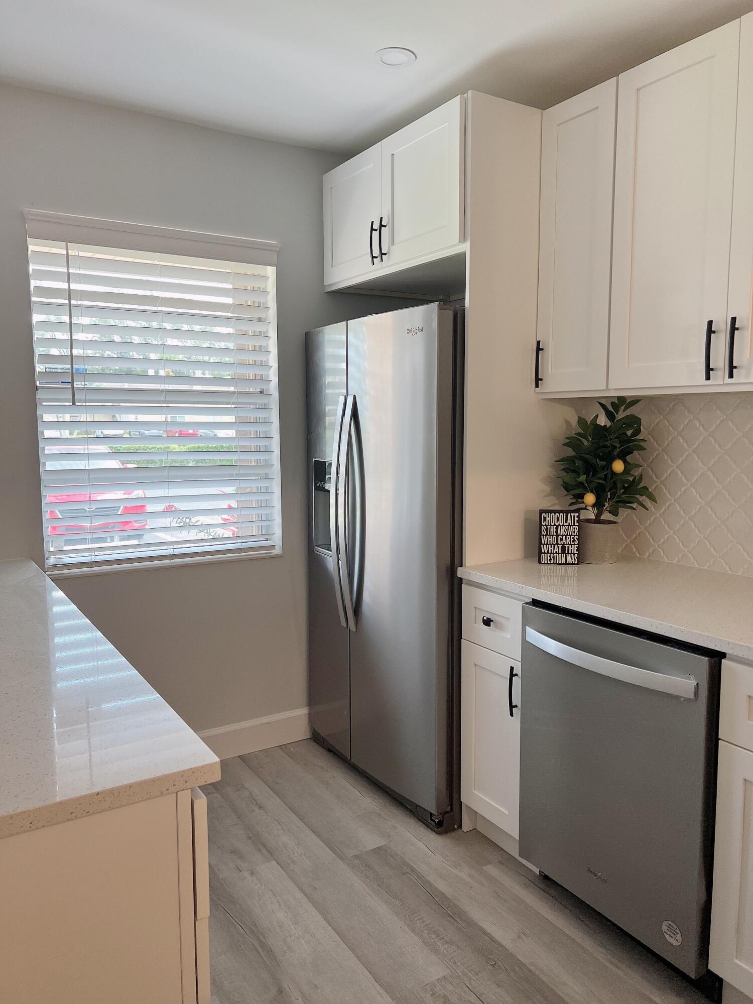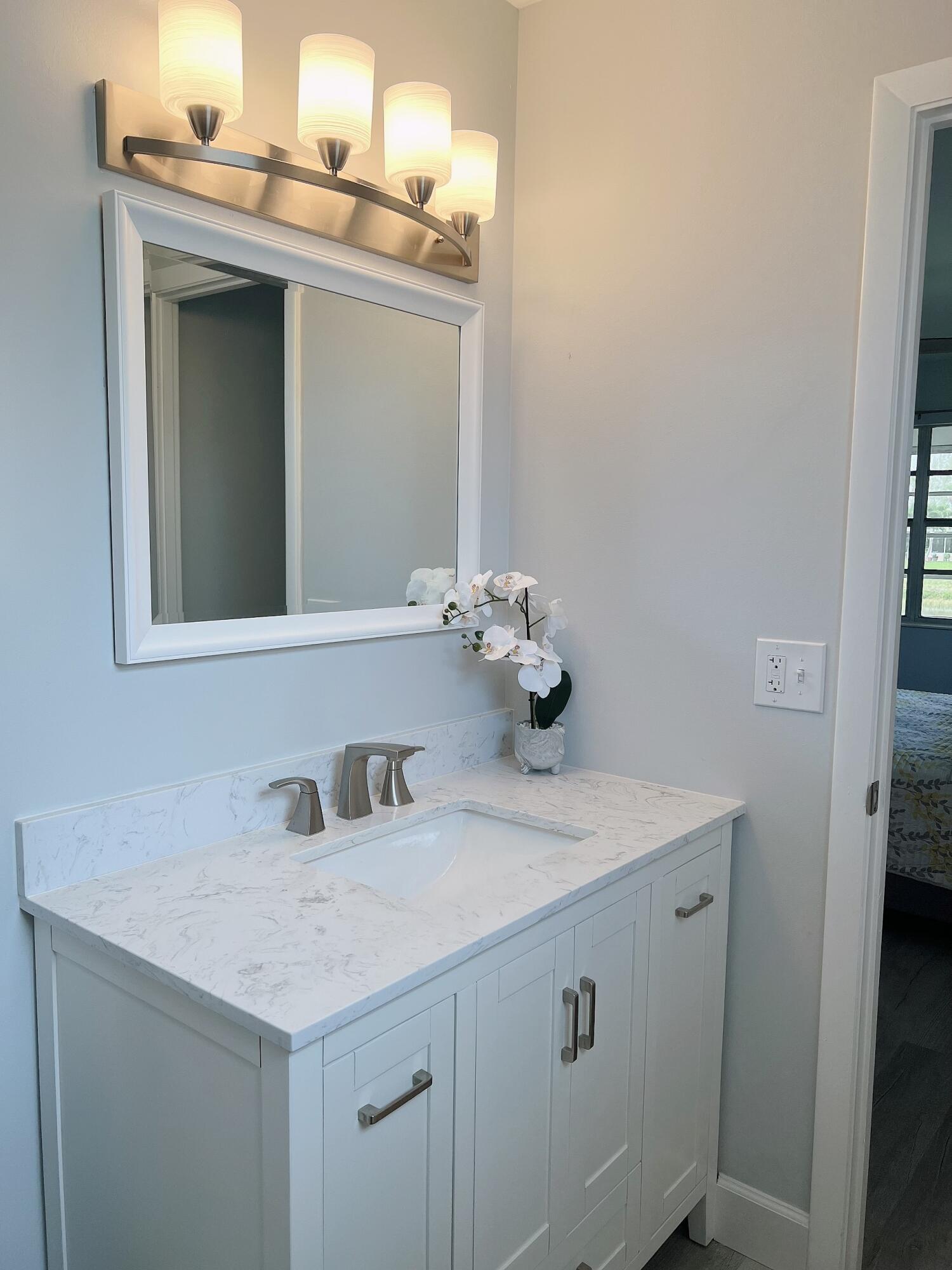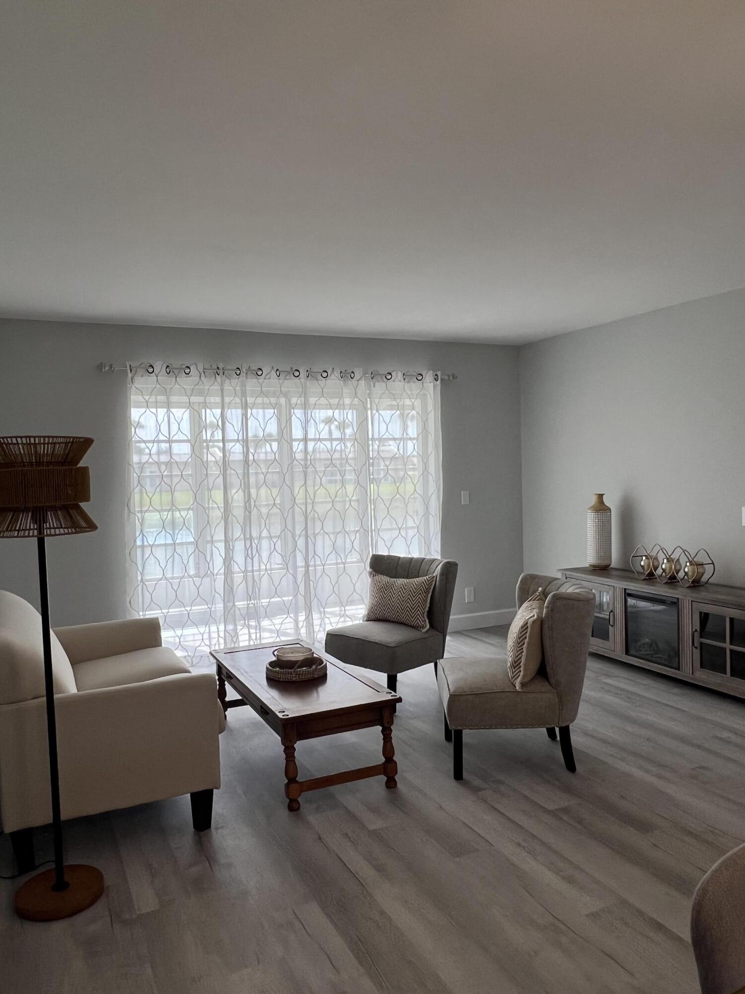 BEAUTIFULLY Updated 2 Bedroom 2 Bath, Villa in Active 55+ Community. New Impact Front Door.Kitchen updated with White Cabinets, Quartz Countertops and New Stainless Steal Appliances. New Luxury Vinyl Plank flooring through out. Bathrooms updated with new Vanities,Toilets,Tile and fixtures. NO Popcorn Ceilings-Knockdown Texuture. New Ceiling Fans, light fixtures and high-hat lighting. New interior Doors/Closet Doors and Baseboards. Large tiled Patio has Fantastic Waterview. New Washer and Dryer included in Patio storage. This Villa is located in Golden Lakes ''Phase B''.Maintenance includes bldg insurance, recreation facilities, water/sewer,24/7 guard gated, courtesy bus two days a week.Club House includes Olympic size pool and other fantastic amenities. MUST SEE to Appreciate