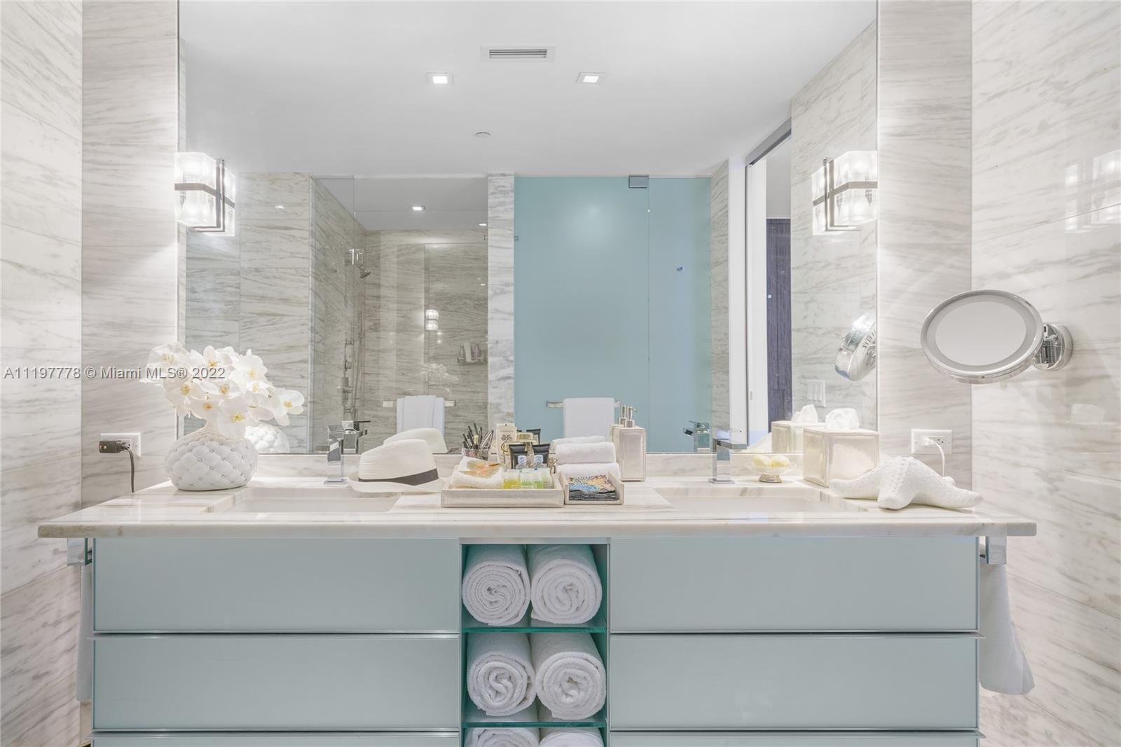 This luxury residence at the W South Beach is a 2 bedroom 2.5 bathroom suite. The master bedroom has a king bed and the second bedroom accommodates 2 more guests on a queen bed. This suite has 2.5 bathrooms, and two balconies with views of the Atlantic Ocean, and the city of Miami Beach.