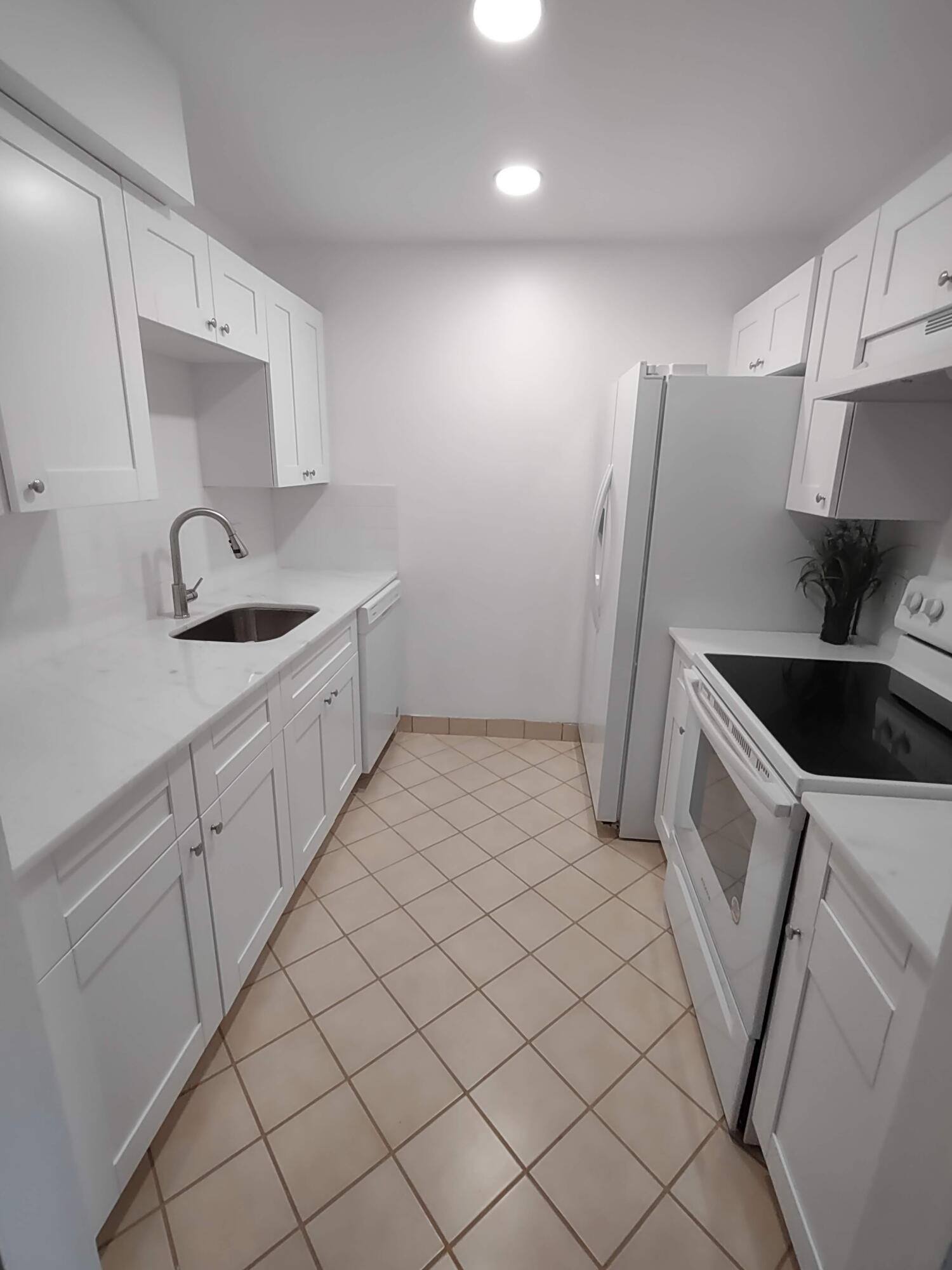 MOVE-IN READY, RENOVATED, 1ST FLOOR CONDO located in the sought after Gated Community of Century Village, an Active 55+ Community. NEW A/C 2022. Spacious floorplan featuring a beautifully updated NEW White Modern Kitchen with granite countertops, all NEW APPLIANCES, all NEW LIGHT FIXTURES, NEW Window Treatments, Freshly Painted Interior, and NEW Baths, and New Vinyl Flooring in Owner's Suite. NO CARPET!!! Step outside onto your covered and screened-in lanai to enjoy beautiful views of the lake and golf course. Community laundry steps away from unit.Community offers clubhouse, theater, outdoor activities, gym, pools, tennis, golf, and more. On-site convenience store, medical offices, management office, etc. 24-Hour Security.Association includes Water, Cable, & Internet.