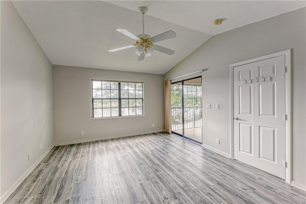 Nicely updated coach home with beautiful lake views! LARGE floor plan,3 bedrooms plus a den! One car garage and extra storage closet at entry level. Go up one flight of stairs to the beautiful main living area. The den is over the garage off the kitchen. Nicely updated eat in kitchen w/granite snack counter, upgraded stainless steel appliances, ample cabinetry & counter space, laundry room w/extra storage, HUGE living/dining area w/soaring ceilings, 3rd bedroom w/double entry doors, partly updated guest bathroom, 2nd bedroom and master bedroom w/slider to balcony & views of the lake and water fountain,UPDATED master bath w/dual sinks, walk in shower, separate soaking tub, 2 closets plus a linen closet.Newer laminte wood floors,New A/C & water heater. Guard gated community w/pool.LOCATION!!