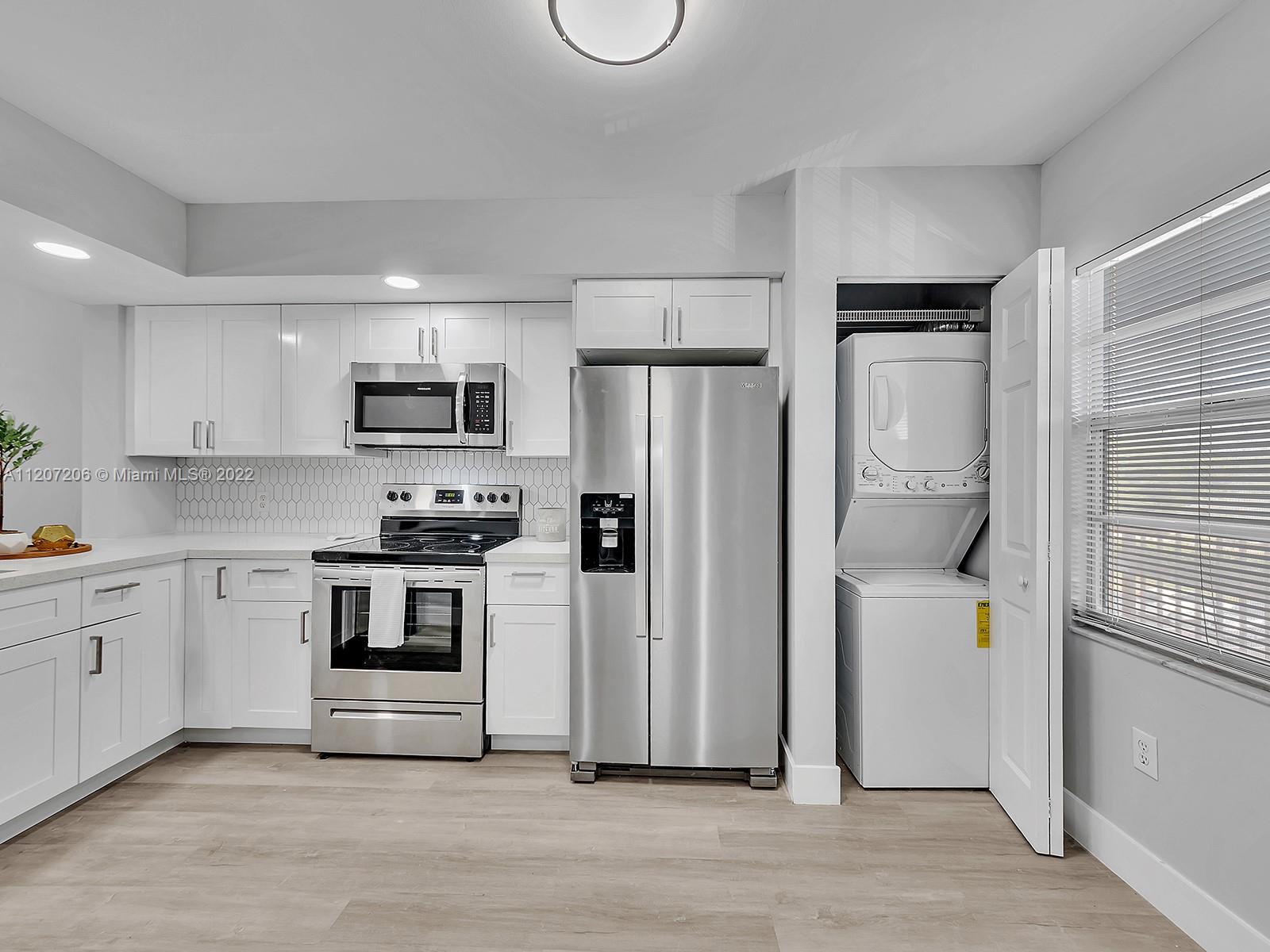 This gorgeous bright, modern, and completely remodel condo would welcome you upon entering the front door into a beautiful concept. 2 Bedrooms, and 1.5 Bathrooms. This O model offers a relaxing welcoming entrance from the kitchen into the living/dining room. The kitchen has been tastefully upgraded with soft closing white cabinets, white quartz, modern backsplash, and stain-steel appliances, laminate waterproof flooring, smooth walls and ceiling finishes, and very modern bathrooms. Washer & dryer in the unit. Be part of the Best 55+ community in the area offering resort-style amenities with numerous options to stay socially and physically active. come and enjoy endlessly resort amenities!