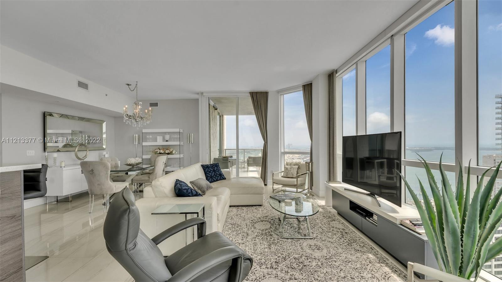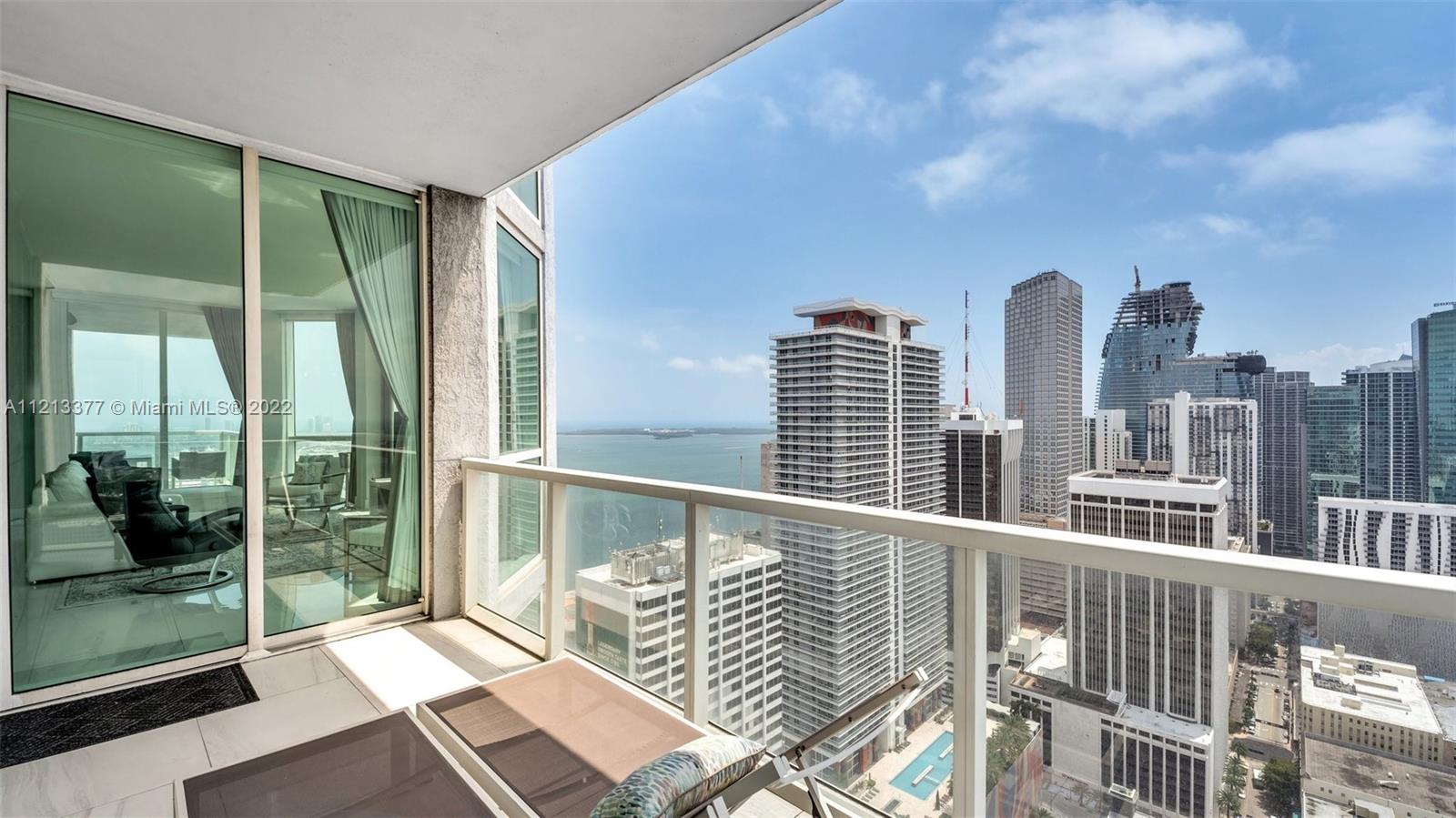 This 3 Bed, 3 full Bath unit will leave you breathless. Walk into a panoramic 44th floor, with East, West, & South views of Downtown Miami & Miami Beach, with all solid doors for increased quiet and privacy. Open concept layout w/high ceilings, porcelain floors & decks, remodeled kitchen with quartz countertops, built-in fridge, SS appliances, marble bathrooms, automated remote control window coverings, 2 ac's, 2 balconies, & spacious living area made for entertaining and enjoying the city night lights, beautiful sunrises & endless sunsets. All were remodeled in 2016. Highly desired South tower in Vizcayne Building including spa, gym, sauna, clubhouse, movie theater and 4 pools with available service for