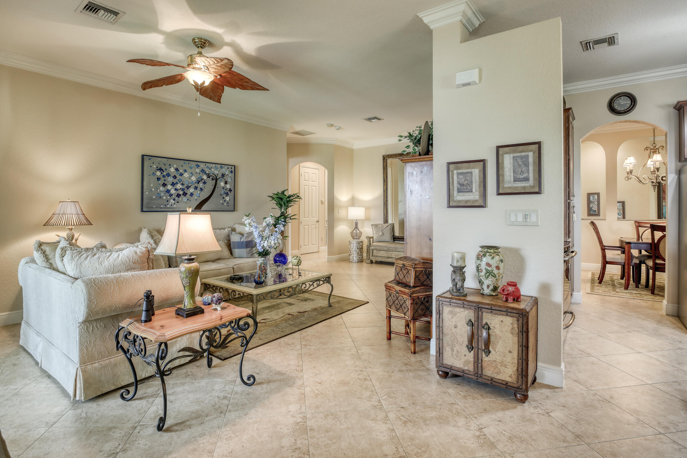 This is an absolutely stunning, 3 bedrooms, 2 bath LAKEVIEW coach home with elevator, 2 car garage & HURRICANE IMPACT WINDOWS with breathtaking views of the lake and sunsets!!! This home is so spacious you won't even realize you're living in a condo. Unique floor plan with living room, family room & formal dining room. Kitchen boasts 42'' maple wood cabinets, granite counters, newer SS appliances (refrigerator new in 2022, double oven w/convection), undermount lighting and a breakfast bar. The entire living area is adorned with crown molding and beautiful window treatments. Tile on the diagonal. The owner's suite has a tray ceiling, a set of sliding glass doors that lead out to the patio and the His/Her's closets are custom fitted with closet system. The owner's bath has dual sinks,