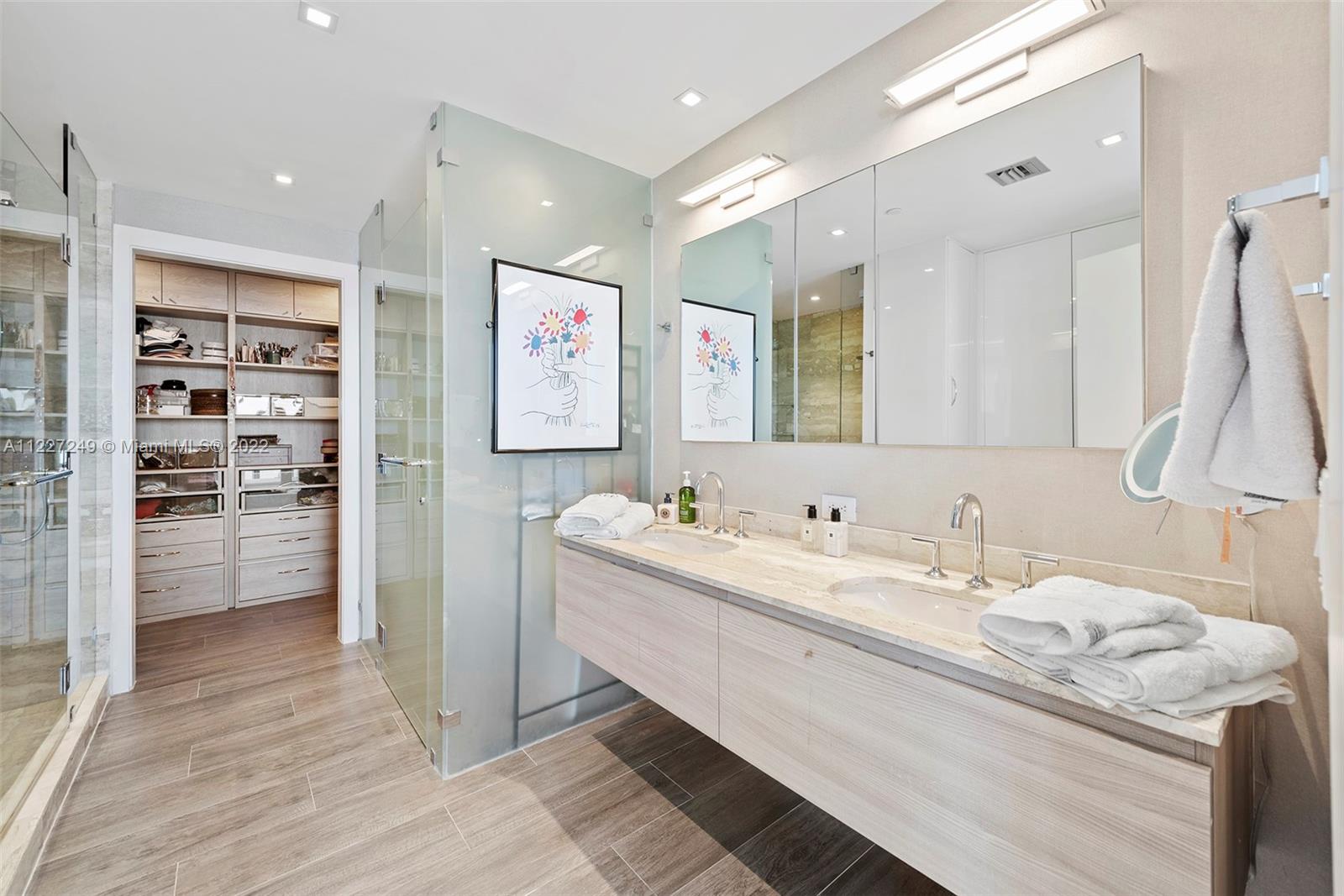 Spectacular bay & city views from this upgraded corner 3 Bed + den & 4 bath condo in the most coveted line of Biscayne Beach. Elevator opens to private foyer. Modern, bright and cozy unit with many upgrades: Master bathtub removed & extra closet built in (2 closets in Master), kitchen island expanded with extra cabinets & workstation kitchen sink, custom built-in wall unit in living room & master bedroom by IntellyHouse, Armadi custom closets & sliding door to den, recessed ceilings & soffits, smart Lutron Lighting system, electric shades, wallpaper in foyer, living room, & master bath, tiled bathroom walls. Storage space (9x4) on same floor as 2 tandem parking spots. Incredible amenities, sand area with cabanas, 2 pools, spa, gym, bbq area, tennis & basketball court and public bay walk.