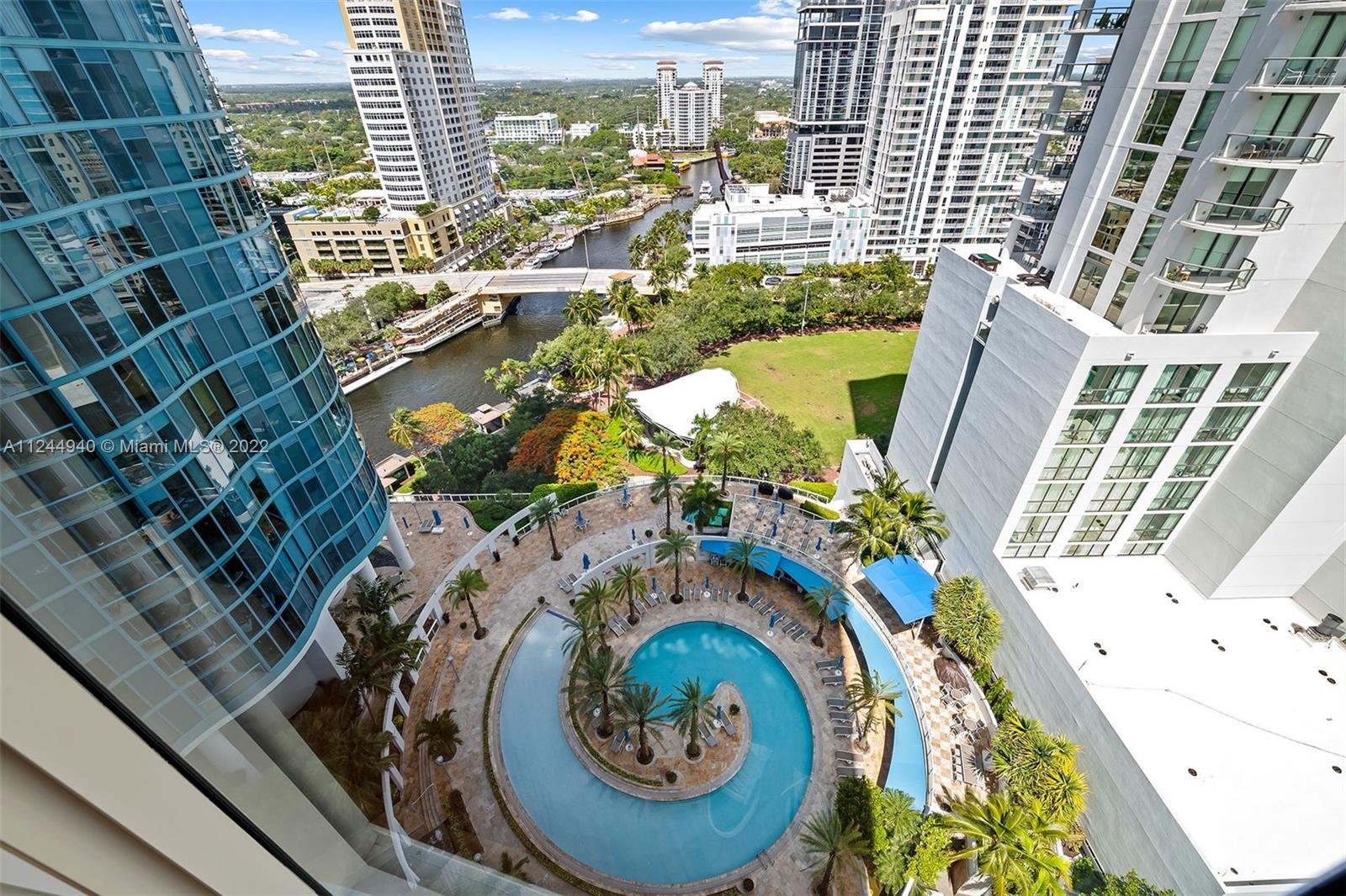 Welcome to your perfect urban riverfront home in Ft Lauderdale's landmark tower, Las Olas River House. Located on the New River in the heart of downtown & famous Las Olas Blvd. This very special 2/2.5 offers huge views from every room showcasing the vibrant New River, Riverwalk, tropical pool deck, city park and skyline. Round radius floor to ceiling glass + large balcony makes this lovely condo a very unique. Elevators sweep you to semi-private foyer. Enjoy River House's 5 star lifestyle offering 24 hr valet, concierge, grand lobby with Koi pond, world class fitness center, & resort style pool deck. 4M lobby renovation now complete by Steven G. New Hyatt Hotel, Eddie V's & Greenwise Grocery just steps away. Pinnacle dynamic urban life + the very best location! Livingroom fixture excluded.