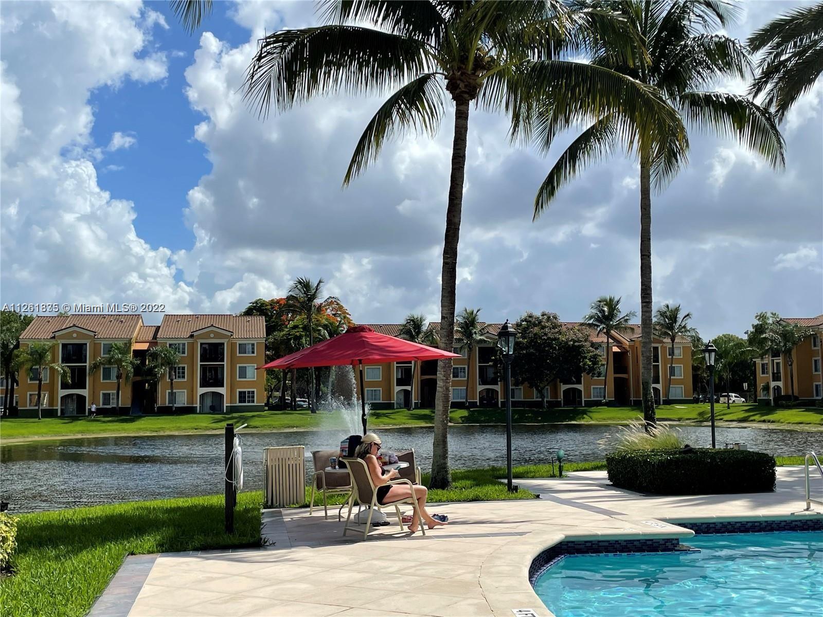 Lovely 2 bedroom/1 bathroom unit located at gated community of The Residences at Miramar. Laminated floor through out the apartment. Stainless steel appliances. Washer/dryer inside the unit. Great view from balcony to garden, tennis courts and lake. Enjoy the amazing amenities such as community pool, tennis and basketball courts, gym, playground and much more. Ideal for investors!