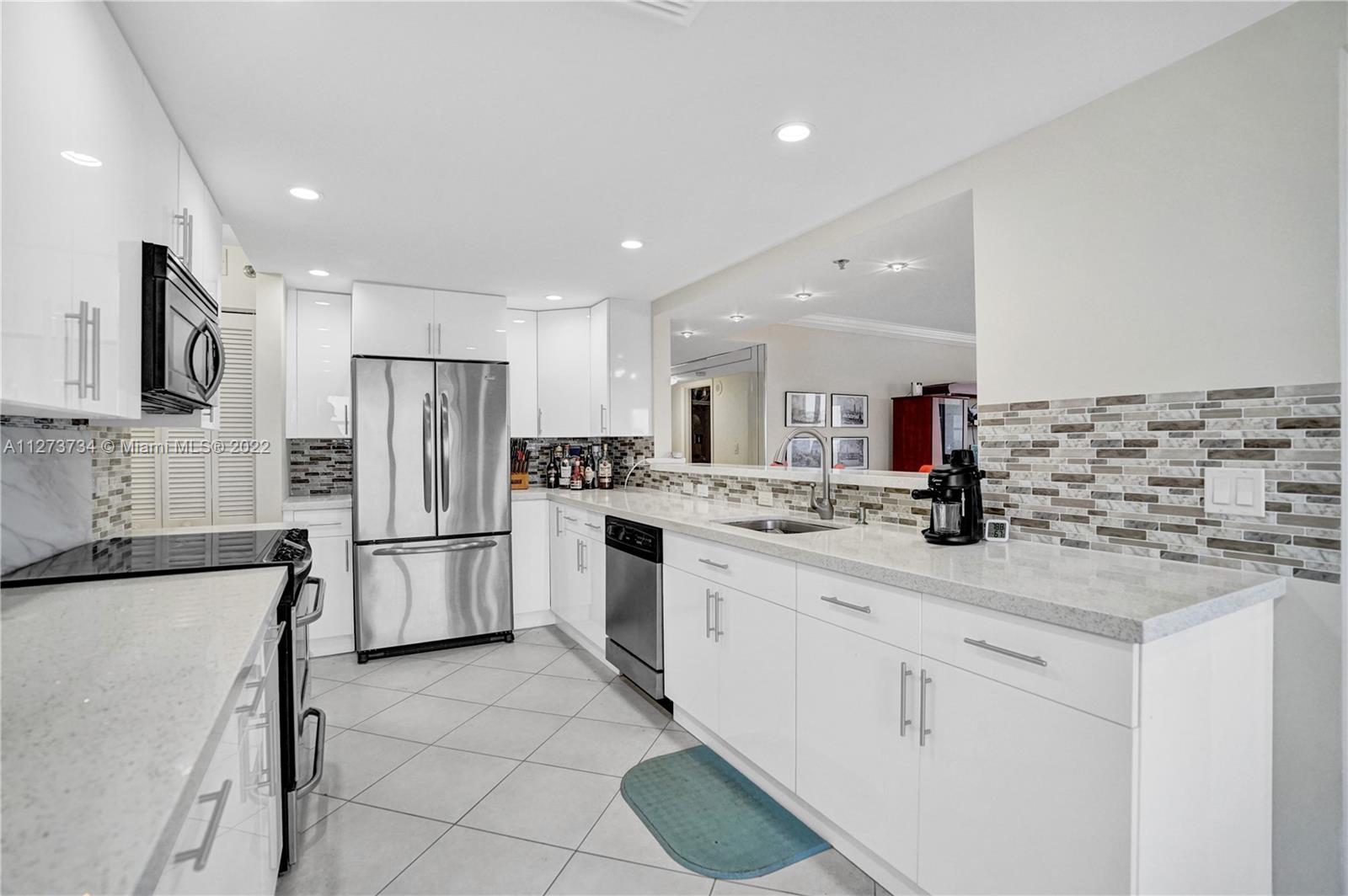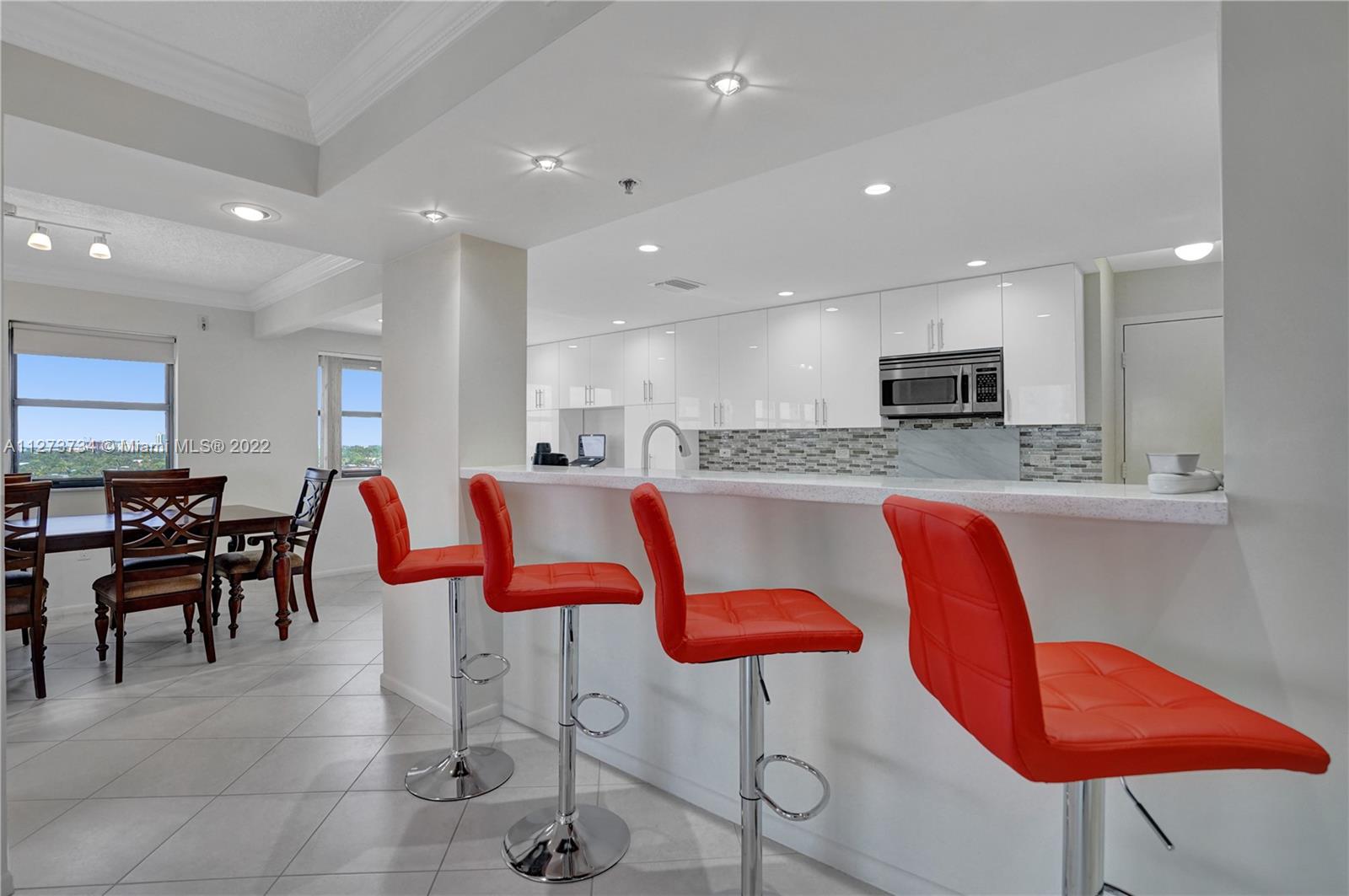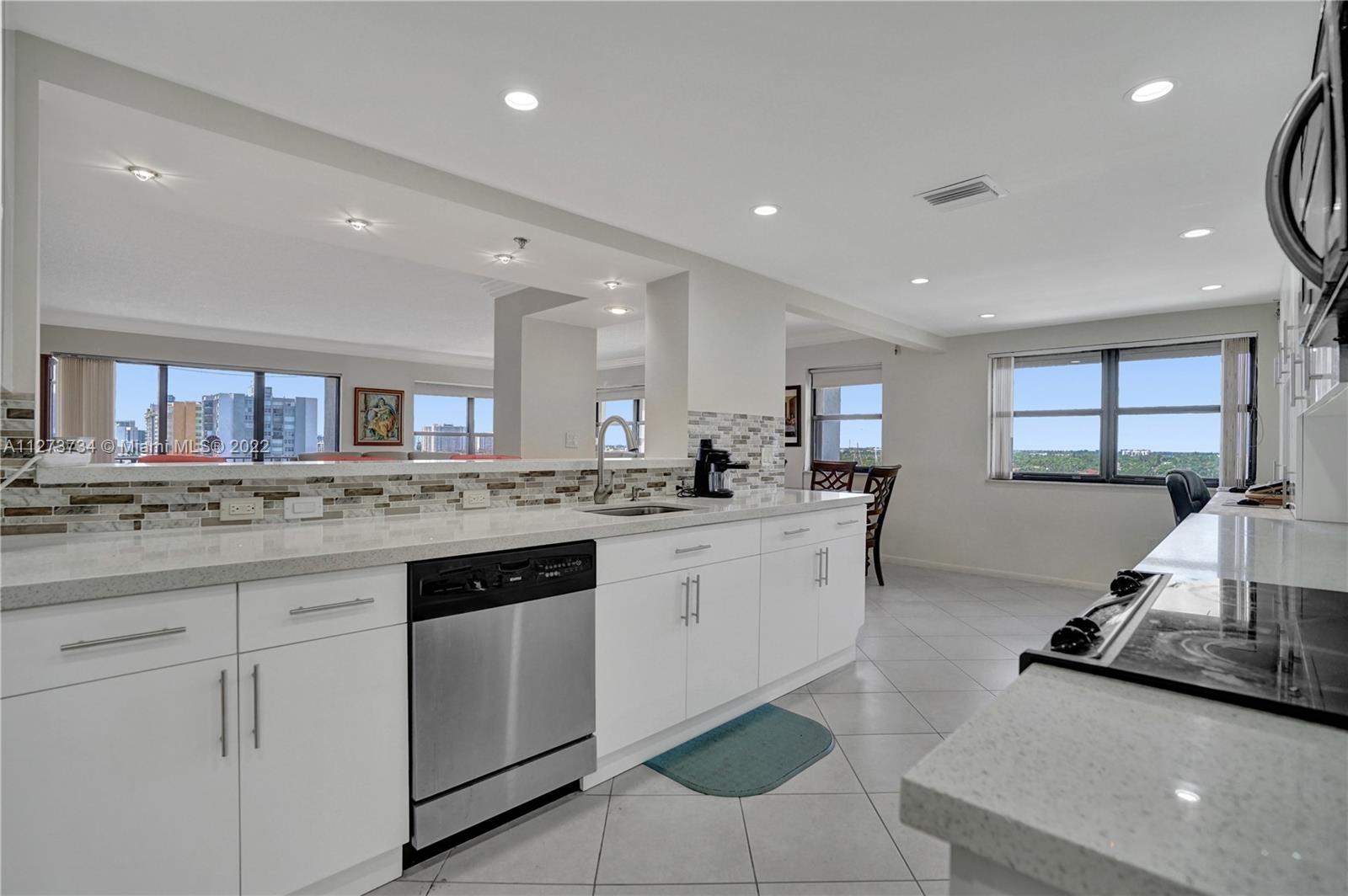 Breathtaking water views from every room in the Summit on Hollywood Beach. Renovated condo SW corner overlooking Southlake & Ocean. Manicured grounds in country club setting. Covered garage parking, washer/dryer in the unit. Open concept living room, dining room, kitchen. SS appliances and white quartz countertops that looks like terrazzo! Large island, white cabinets & built in desk. Glass sliding doors onto balcony to enjoy the intracoastal and ocean views. Large Primary bedroom w/walk in closet,vanity & sink. Bath has marble shower. Second bedroom and hall bath with tub and shower. This unit has a laundry room with stacked washer and dryer, more cabinets and storage area. Feels like home rather than a condo. Must see! Virtual showings welcome