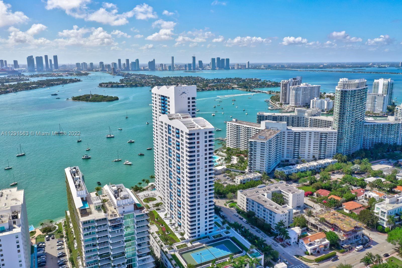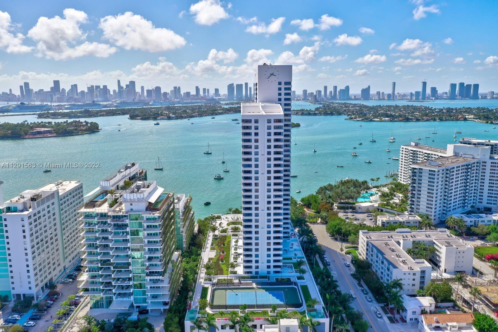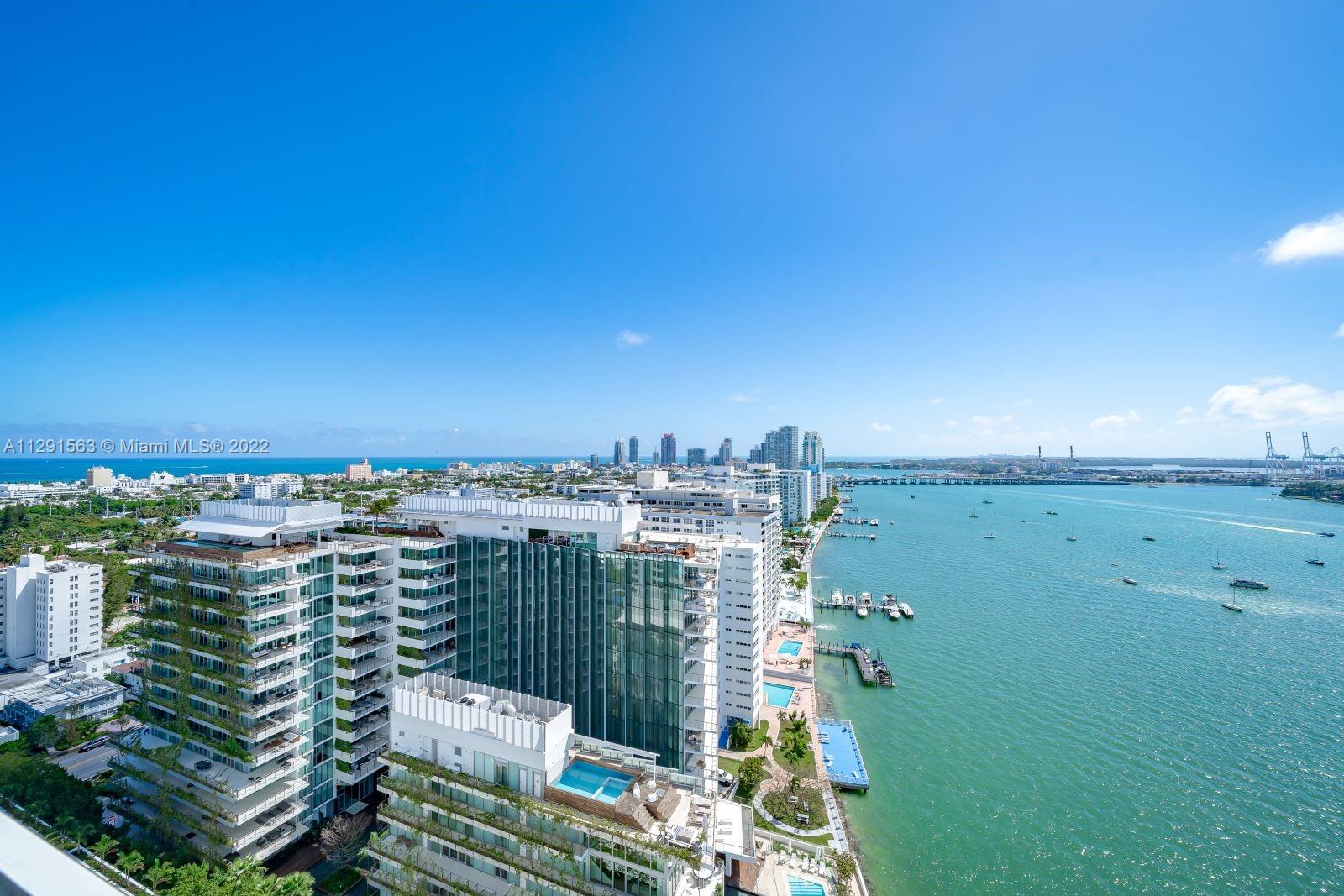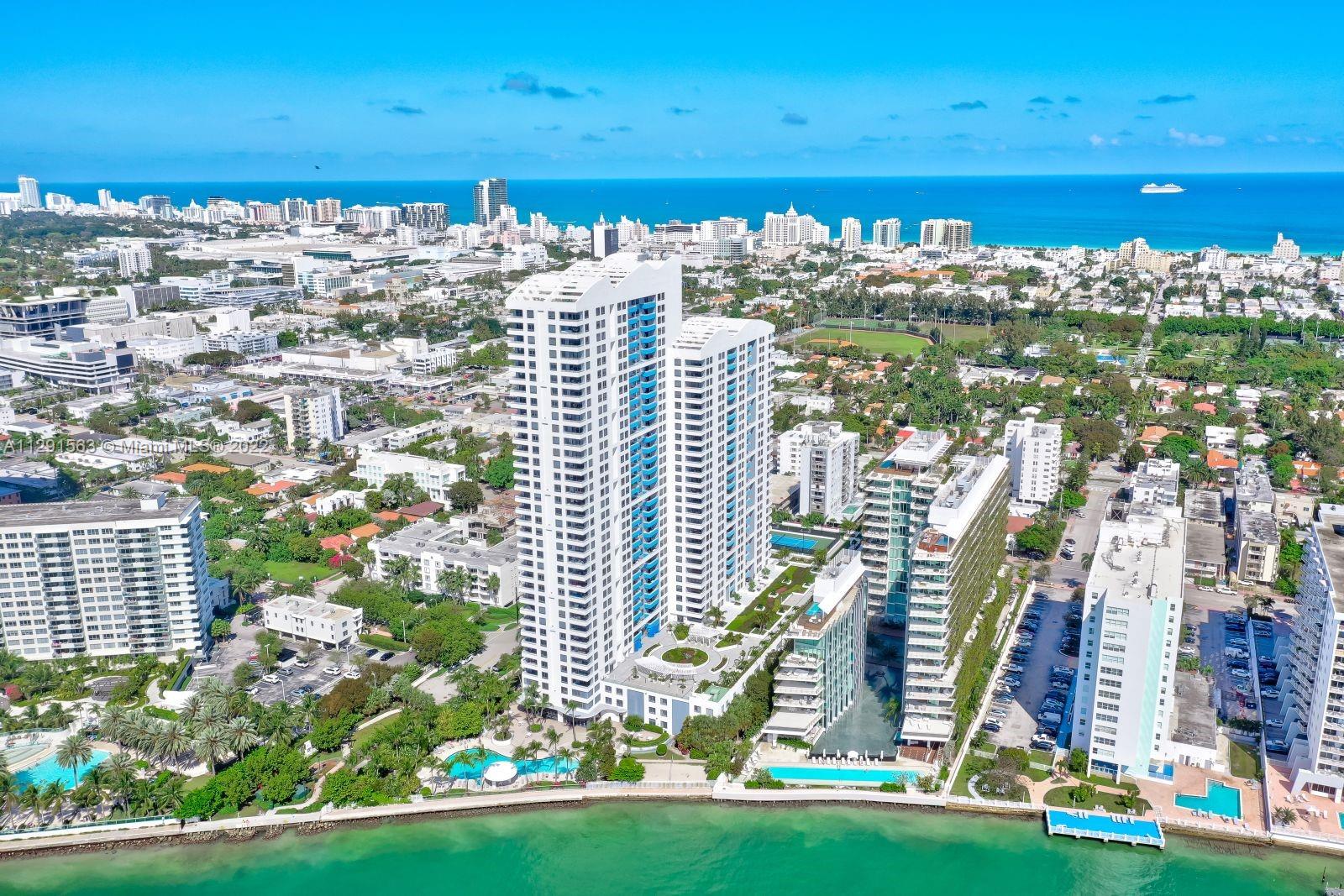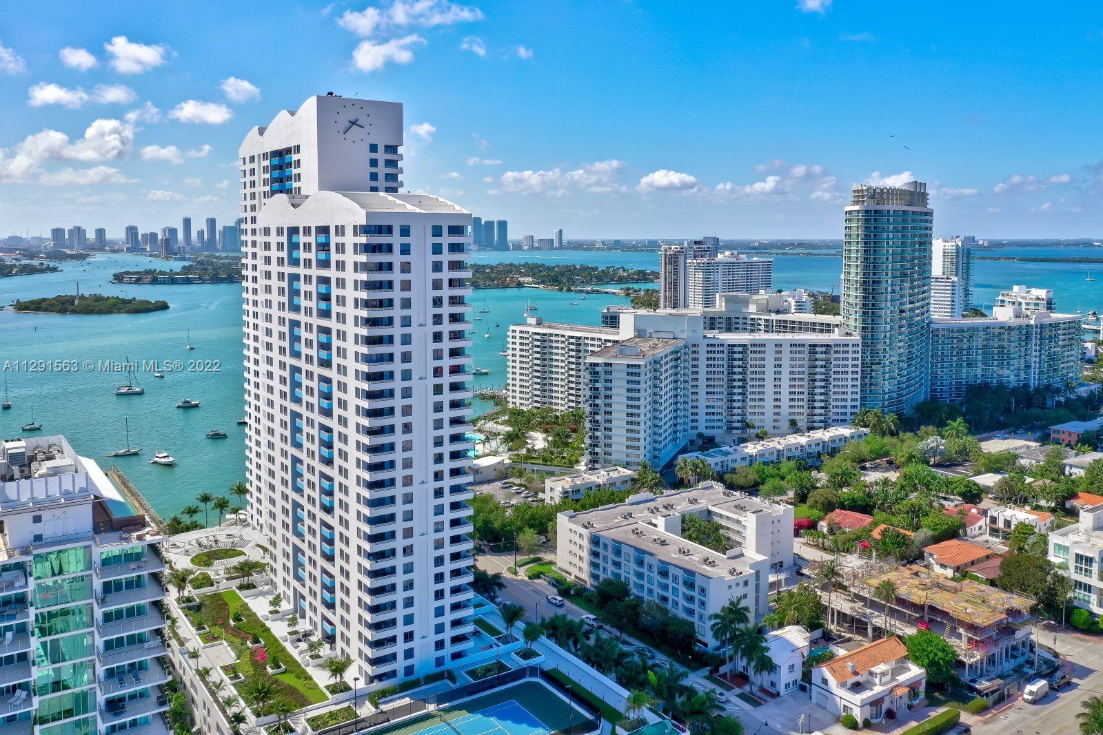 Spacious 2/2 corner unit with extraordinary city, bay, and ocean views. Breathtaking sunrises and sunsets from all rooms and spacious private balcony. Enjoy the resort lifestyle with bayfront pool, BBQ’s, sand volleyball, tennis, fitness center with yoga and cardio rooms, Spa/Hot Tub, newly renovated feng shui garden, renovated party room, business center, electric vehicle charging stations & convenience store. Onsite management, 24 hr. security and concierge, valet. The trendy West Ave neighborhood is close to SoBe's best restaurants, gyms, and shops. Minutes to the ocean, Lincoln Rd, and an International airport. One assigned-covered parking space. Full-size washer/dryer in unit. Cable & high-speed internet included in maintenance. Pet friendly.