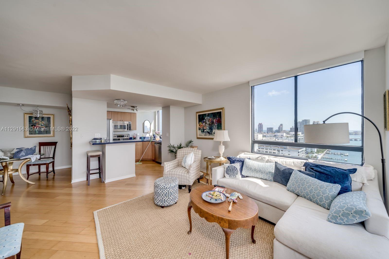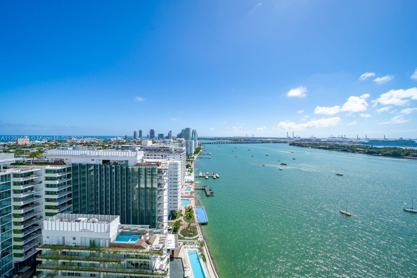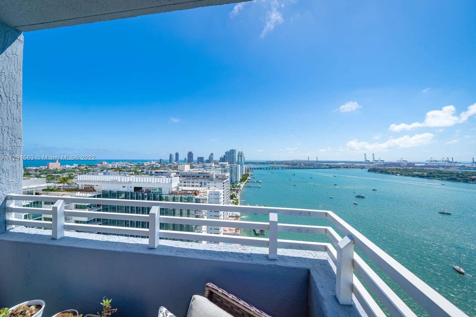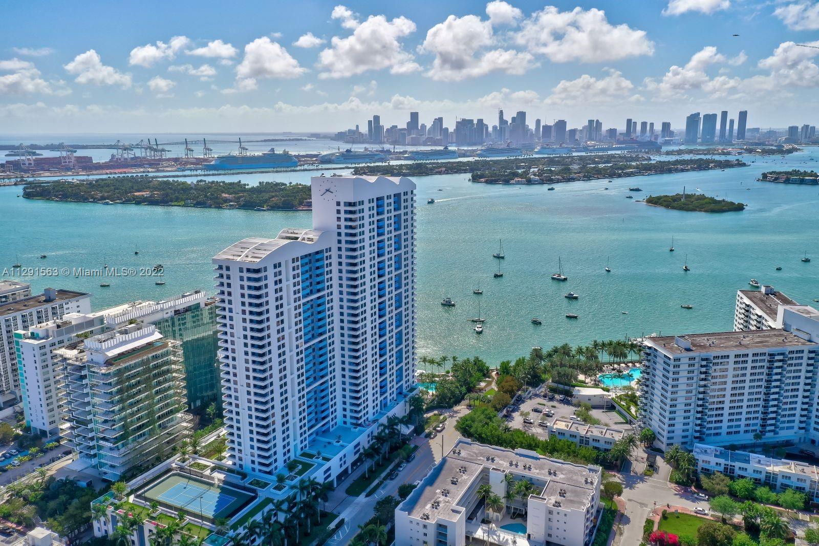 Spacious 2/2 corner unit with extraordinary city, bay, and ocean views. Breathtaking sunrises and sunsets from all rooms and spacious private balcony. Enjoy the resort lifestyle with bayfront pool, BBQ’s, sand volleyball, tennis, fitness center with yoga and cardio rooms, Spa/Hot Tub, newly renovated feng shui garden, renovated party room, business center, electric vehicle charging stations & convenience store. Onsite management, 24 hr. security and concierge, valet. The trendy West Ave neighborhood is close to SoBe's best restaurants, gyms, and shops. Minutes to the ocean, Lincoln Rd, and an International airport. One assigned-covered parking space. Full-size washer/dryer in unit. Cable & high-speed internet included in maintenance. Pet friendly.